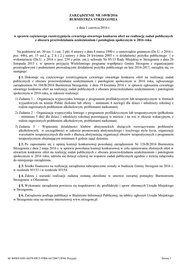 ZARZĄDZENIE NR 149/B/2016 BURMISTRZA STRZEGOMIA z dnia 1 czerwca 2016 r. w sprawie częściowego rozstrzygnięcia czwartego otwartego konkursu ofert na realizację zadań publicznych z obszaru przciwdziałania uzależnieniom i patologiom społecznym w 2016 roku Na podstawie art. 30 ust. 1 i ust. 2 pkt. 4 ustawy z dnia 8 marca 1990 r. o samorządzie gminnym (Dz.U. z 2016 r. poz. 446), art. 15 ust.2 g, 2 h i 2 j ustawy z dnia 24 kwietnia 2003 r. o działalności pożytku publicznego i o wolontariacie (Dz.U. z 2016 r. poz. 239 z późn. zm.), uchwały Nr 95/15 Rady Miejskiej w Strzegomiu z dnia 26 listopada 2015 r. w sprawie przyjęcia Wieloletniego programu współpracy Gminy Strzegom z organizacjami pozarządowymi i podmiotami prowadzącymi działalność pożytku publicznego na lata 2016-2017, zarządza się, co następuje: § 1. Dokonuje się częściowego rozstrzygnięcia czwartego otwartego konkursu ofert na realizację zadań publicznych z obszaru przeciwdziałania uzależnieniom i patologiom społecznym w 2016 roku, ogłoszonego zarządzeniem Nr 104/B/2016 Burmistrza Strzegomia z dnia 19 kwietnia 2016 r. w sprawie ogłoszenia czwartego otwartego konkursu ofert na realizację zadań publicznych z obszaru przeciwdziałania uzależnieniom i patologiom społecznym w 2016 roku, w zakresie realizacji: 1) Zadania 1 - Organizacja wypoczynku letniego z programem profilaktycznym lub terapeutycznym w formach wyjazdowych na terenie Polski (kolonie lub obozy – minimum 4 noclegi) dla dzieci i młodzieży szkolnej z rodzin zagrożonych problemem alkoholowym, problemami narkomanii; 2) Zadania 2 – Organizacja wypoczynku letniego z programem profilaktycznym lub terapeutycznym (półkolonie – minimum 5 dni) dla dzieci i młodzieży szkolnej pozostającej w mieście i na wsi w okresie wakacyjnym, z rodzin zagrożonych problemem alkoholowym, problemami narkomani; 3) Zadania 3 - Wspieranie działalności klubów abstynenckich służących rozwiązywaniu problemów alkoholowych, w szczególności w zakresie promowania abstynenckiego i trzeźwego stylu życia, organizacji warsztatów terapeutycznych dla osób z dłuższą abstynencją, organizacji obozów terapeutycznych z programem terapeutycznym obejmującym minimum 6 godzin zajęć dziennie. § 2. Po zapoznaniu się z opinią komisji konkursowej powołanej zarządzeniem Nr 126/B/2016 Burmistrza Strzegomia z dnia 2 maja 2016 r. w sprawie powołania komisji konkursowej w celu opiniowania złożonych ofert w otwartym konkursie ofert na realizcję zadań publicznych z obszaru przeciwdziałania uzależnieniom i patologiom społecznym w 2016 roku, udziela się dotacji celowej na wsparcie zadań publicznych zgodnie z treścią załącznika do niniejszego zarządzenia. § 3. Środki finansowe na realizację zarządzenia zabezpieczone zostały w budżecie Gminy Strzegom na 2016 r. w rozdziale 85153 i w rozdziale 85154. § 4. Zakres i warunki realizacji zadania zostaną określone w umowie zawartej pomiędzy Burmistrzem Strzegomia a Oferentem. § 5. Wykonanie zarządzenia powierza się inspektorowi ds. profilaktyki i spraw obronnych Urzędu Miejskiego w Strzegomiu. § 6. Zarządzenie podlega publikacji w Biuletynie Informacji Publicznej, na tablicy ogłoszeń Urzędu Miejskiego w Strzegomiu oraz na stronie internetowej www.strzegom.pl. Id: B49EFA9D-AD78-49C5-95B4-A67204713F86. Przyjęty Strona 1 § 7. Zarządzenie wchodzi w życie z dniem podpisania. z up. Zastępca Burmistrza Wiesław Witkowski Id: B49EFA9D-AD78-49C5-95B4-A67204713F86. Przyjęty Strona 2 Załącznik do Zarządzenia Nr 149/B/2016 Burmistrza Strzegomia z dnia 1 czerwca 2016 r. Rodzaj zadania publicznego: Zadanie 1: Organizacja wypoczynku letniego z programem profilaktycznym lub terapeutycznym wformach wyjazdowych na terenie Polski (kolonie lub obozy – minimum 4 noclegi) dla dzieci i młodzieżyszkolnej z rodzin zagrożonych problemem alkoholowym, problemami narkomanii. Oferta 1. 2. 3. 4. 5. 6. Nazwa oferenta STOWARZYSZENIE MIESZKAŃCÓW NA RZECZ ROZWOJU WSI STANOWICE STOWARZYSZENIE UCZNIOWSKI KLUB SPORTOWY „AKTYWNA KOSTRZA" KOŁO PRZYJACIÓŁ DZIECI „ COPERNICUS” PRZY PUBLICZNEJ SZKOLE PODSTAWOWEJ NR 2 W STRZEGOMIU STOWARZYSZENIE PRZYJACIÓŁ PUBLICZNEJ SZKOŁY PODSTAWOWEJ NR 4 IM. KORNELA MAKUSZYŃSKIEGO W STRZEGOMIU „PRZYJACIELE CZWÓRKI” STOWARZYSZENIE WSPIERANIA KULTURY W GMINIE STRZEGOM „AKCJA” STOWARZYSZENIE ROZWOJU WSI OLSZANY Wysokość przyznanych środków w zł 4.000,00 9.000,00 8.400,00 8.000,00 8.000,00 8.000,00 Zadanie 2: Organizacja wypoczynku letniego z programem profilaktycznym lub terapeutycznym(półkolonie – minimum 5 dni) dla dzieci i młodzieży szkolnej pozostającej w mieście i na wsi w okresiewakacyjnym, z rodzin zagrożonych problemem alkoholowym, problemami narkomanii. Oferta 1. 2. 3. 4. 5. 6. 7. Nazwa oferenta KOŁO PRZYJACIÓŁ DZIECI „COPERNICUS” PRZY PUBLICZNEJ SZKOLE PODSTAWOWEJ NR 2 W STRZEGOMIU STOWARZYSZENIE PRZYJACIÓŁ PUBLICZNEJ SZKOŁY PODSTAWOWEJ NR 4 IM. KORNELA MAKUSZYŃSKIEGO W STRZEGOMIU „PRZYJACIELE CZWÓRKI” STOWARZYSZENIE PEDAGOGÓW I PSYCHOLOGÓW GMINY STRZEGOM STOWARZYSZENIE WSPIERANIA KULTURY W GMINIE STRZEGOM „AKCJA” STOWARZYSZENIE NA RZECZ WSPIERANIA GIMNAZJUM NR 2 IM. JANA PAWŁA II W STRZEGOMIU KOŁO TOWARZYSTWA PRZYJACIÓŁ DZIECI PRZY ZESPOLE SZKÓŁ SPECJALNYCH W STRZEGOMIU UCZNIOWSKI KLUB SPORTOWY „GIMEK” Id: B49EFA9D-AD78-49C5-95B4-A67204713F86. Przyjęty Wysokość przyznanych środków w zł 10.000,00 9.682,60 18.665,40 5.370,00 4.904,00 2.196,00 3.472,00 Strona 1 Zadanie 3: Wspieranie działalności klubów abstynenckich służących rozwiązywaniu problemówalkoholowych, w szczególności w zakresie promowania abstynenckiego i trzeźwego stylu życia, organizacji warsztatów terapeutycznych dla osób z dłuższą abstynencją, organizacji obozów terapeutycznych z programemterapeutycznym obejmującym minimum 6 godzin zajęć dziennie. Oferta 1. Nazwa oferenta KLUB ABSTYNENCKI „ARKA” Id: B49