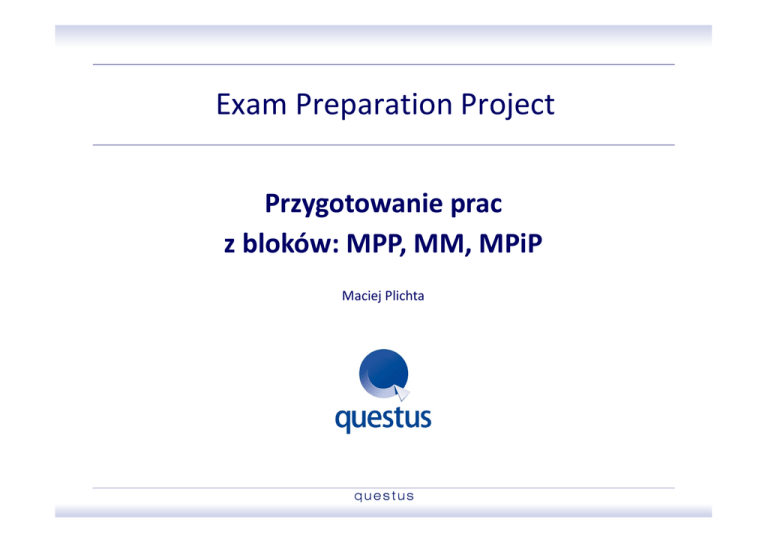 Exam Preparation Project Przygotowanie prac z bloków: MPP, MM, MPiP Maciej Plichta Format pracy (wersja elektroniczna) i formatowanie tekstu – cz.1 • praca z danego bloku powinna stanowić JEDEN plik (doc lub pdf) o następującej nazwie: nazwa centrum egzaminacyjnego – nazwa bloku (MPP, MM lub MPiP) – sesja – numer członkowski CIM przykład: QUESTUS – MPP – Mar 10 – 12345678 • praca powinna być napisana czcionką ARIAL w rozmiarze 11 (na stronie tytułowej czcionka może być większa). W tabelach i na wykresach może być mniejsza, ale nie mniejsza niż ARIAL w rozmiarze 8. 2 Format pracy (wersja elektroniczna) i formatowanie tekstu – cz.2 Jak przygotować pracę w jednym pliku pdf? W sytuacji, gdy odpowiedź na pytanie egzaminacyjne lub jeden z załączników zostanie przygotowany w formie prezentacji (powerpoint) lub rozbudowanej tabeli (excel), którą będzie trudno zaimportować do głównego pliku doc (word) lub odpowiedzi na poszczególne pytania zostały zapisane jako odrębne pliki doc możliwe jest następujące rozwiązanie: • Odpowiedź na każde z pytań oraz każdy załącznik należy zapisać w oddzielnym pliku (doc, ppt lub xls) przygotowanym do wydruku na A4 • Każdy z plików należy kolejno zapisać jako plik pdf – stosując dowolną drukarkę wirtualną – np. qprinter lub primo pdf - niezależnie od formatu pliku źródłowego powinniśmy otrzymać czytelny pdf • Używając darmowego programu Gios Pdf Splitter And Merger (lub innego) należy skleić poszczególne pliki pdf w jeden plik. Należy tu tylko zwrócić uwagę na zachowanie właściwej kolejności fragmentów pracy! 3 Format pracy (wersja elektroniczna) i formatowanie tekstu – cz.3 1. Appendix 1 tzw. „front sheet” (dokument CIM) 2. strona tytułowa 3. Spis treści 4. odpowiedź na pytanie 1 5. odpowiedź na pytanie 2 6. odpowiedź na pytanie 3 7. itd. 8. załącznik – company description* 9. pozostałe załączniki * Jeśli odpowiedź na poszczególne pytania zostanie oparta na różnych organizacjach (informacja o takiej możliwości będzie zawarta w pliku pdf z zestawem pytań) poszczególne załączniki company description powinny znaleźć się po odpowiedzi na 4 dane pytanie Strona tytułowa Strona tytułowa powinna zostać przygotowana wg schematu: nazwa bloku Marketing Planning Process wybrany zestaw egzaminacyjny (dla bloków MM i PMiM) wraz z podaniem tytułu Option One: xxxxxxxxxxxx CIM Membership Number: 12345678 numer CIM liczba słów użytych w odpowiedzi na wszystkie pytania, w których word count powinno zostać uwzględnione Total word count: 5432 5 Liczba słów (word count) • Pod odpowiedzią na pytania musi znaleźć się podsumowanie liczby słów użytych w danej odpowiedzi (word count: xxxx). WAŻNE: limity słów nie muszą stosować się do wszystkich pytań z zestawu! • Na dole STRONY TYTUŁOWEJ zamieścić należy podsumowanie liczby słów użytych w całej pracy – tzn. we wszystkich odpowiedziach na pytania, dla których przewidziano limit słów (total word count: xxxx) • Przy liczeniu słów NIE uwzględniamy: spisu treści, opisu firmy, tytułów sekcji pracy, nagłówków, przypisów, bibliografii, załączników. WAŻNE: w każdym zestawie egzaminacyjnym znajdują się szczegółowe wytyczne • W przypadku prezentacji (powerpoint) nie liczymy słów użytych na slajdach a jedynie w OPISACH slajdów (często też w pytaniu określono maksymalną liczbę slajdów!) • Suma słów nie może przekroczyć 6000 (chyba że pytanie stanowi inaczej). Dopuszczalne przekroczenie: <10%. Wymiennie z limitem słów w pytaniu może zostać określony limit stron lub slajdów. 6 Liczba słów (word count) • Tekst w tabelach rysunkach i na wykresach uwzględniamy w word count o ile znajdują się one w treści odpowiedzi. Przeniesienie ich do załącznika zwalnia nas z tego obowiązku i pozwala zaoszczędzić kilka słów – jest jednak możliwe tylko gdy pytanie nie sugeruje, że użycie w odpowiedzi którejś z tych form jest konieczne. 7 Formułka „I confirm…” W pracy musi znaleźć się następująca formułka: ”I confirm that in forwarding this assessment for marking, I understand and have applied the CIM policies relating to word count, plagiarism and collusion for all tasks. This assignment/project is the result of my own independent work where otherwise stated. Other sources are acknowledged in the body of the text and a bibliography is appended. The work that I have submitted has not previously been accepted in substance for any other award and is not concurrently submitted in candidature for any other award.” Formułkę należy umieścić na początku lub końcu pracy. 8 Wersja „papierowa” prac • Wydruki prac prosimy przesyłać do nas NIE spięte, najlepiej w teczkach lub koszulkach (cała praca w jednej teczce) na adres: questus ul. Organizacji WiN 83/7 91-811 Łódź • Prosimy zwrócić uwagę na odpowiednią kolejność stron • Treść wydruku nie może różnić się od wersji elektronicznej • Do każdej pracy prosimy dołączyć wypełnioną stronę Assignment/Project Front Sheet (Level/Award: Professional Diploma in Marketing, Accredited Study Centre: QUESTUS) 9 Inne ważne informacje • Każda strona pracy musi zostać opatrzona numerem członkowskim CIM Zdającego oraz numerem pytania (lub informacją, iż jest to załącznik do konkretnego pytania). • W przypadku przesyłania do nas prac w formacie pdf prosimy bardzo o to, by nie dodawać haseł do plików! • Wersja elektroniczna pracy może zostać przesłana do nas mailem ([email protected]) z wyraźnym zaznaczeniem w tytule maila, że jest to praca egzaminacyjna! Nie ma wówczas potrzeby nagrywania prac na płytę. • Maksymalny rozmiar pliku z pracą to 4 MB ! 10 Na zakończenie… W razie wszelkich pytań jak i wątpliwości związanych z przygotowywaniem prac egzaminacyjnych pozostaję do dyspozycji: - Maciej Plichta [email protecte
