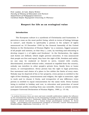 UWARUNKOWANIA MAŁŻEŃSKIEGO I RODZINNEGO SZCZĘŚCIA Prof. nadzw. dr hab. Edyta Wolter Faculty of History of Education and Nurture Department of Pedagogical Sciences Cardinal Stefan Wyszyński University in Warsaw Respect for life as an ecological value Introduction The European culture is a synthesis of Christianity and humanism. It perceives a man as the most perfect being, which in terms of biology belongs to nature1, and thanks to spirituality a person is the subject of rights announced on 10 December 1948 by the General Assembly of the United Nations in the Declaration of Human Rights "as a common, biggest purpose of all people and nations, so that they (...) aim, by teaching and educating to develop respect (...) of rights and freedoms". In the Declaration, the rights and duties are defined, which might prevent atrocities. It was announced that people are free and equal, they have the right of life, freedom and safety, no one may be enslaved or forced to serve, treated with cruelty, discriminated, arrested without order, retained or expelled from the country, nobody can interfere in other people's private lives, family lives or home issues, or correspondence. Every person has the right to legal protection, free movement and choice of a place to live within the limits of every state. Nobody may be deprived of his or her property, every person is entitled to the right of free thinking, consciousness and religion, the right to associate, right to work and to choose it freely, and irrespective of any difference every person is entitled to equal remuneration for the same work. Every human being is entitled to holiday and rest, to education and protection of moral and material profits resulting from any scientific, literary or artistic activity (compare Universal Declaration of Human Rights, 1989, p. 15-16). In medical literature there are more and more scientific publications explain the influence on the environmental protection on the functioning of people in the scope of the symptoms of seasonal depression. See L. Pawłowski. (2004), Seasonal depression as an example of the impact of natural environment on a human being's psychological condition, in: Social ecology - psychological and environmental conditions of attitudes, Cracow: Stowarzyszenie Ekopsychologia, Jagiellonian University p. 141– 43. 1 FIDES ET RATIO Strona 183 UWARUNKOWANIA MAŁŻEŃSKIEGO I RODZINNEGO SZCZĘŚCIA In consequence of the Universal Declaration of Human Rights other documents appeared, such as: the European Convention on the Protection of Human Rights and Fundamental Freedoms - treaty prepared in the framework of the Council of Europe (compare the European Convention of Human Rights, 2000, p. 5) to serve with the idea support in the development of sensitive (humanistic) approach for human affairs, with recognition of respect for the value of life and personal identity, in actions transforming the social and environmental society (compare Suchodolski, Wojnar, 1990, p. 61). Although dignified life is a value, which became a part of the heritage of the European Culture - a person's relation to environment has become a more general problem, namely a relation towards people's existence and the reality they live in (compare Michalik, 1989, p. 21). H. Skorowski emphasized that "person as the highest value is to be the subject of the new Europe, he or she should manifest their real value outside. It should be manifested by a morality of personal behavior” (Skorowski, 2010, p. 33). Personal and common responsibility for the created world concerns a relation between a person and environment. Personal dignity is the basis of the above. In the process of Christian education it serves shaping the attitude of responsibility for the creation of God, it is connected with ecological education, environmental protection of life (compare Zellma, 2007, p. 481), as a category indicating beings with specific properties living on Planet Earth. As already mentioned in this article a human being, by its bodily element is a part of nature and in the Christian culture it is understood as the perfect creation of God2. M. Nowak, considering the uniqueness of a person's position in the Universe, explains that all human theories should aim at realism, and he defends himself against the dualistic concept, which changes the emphasis or its spiritual dimension (homo spirituals), or biological or economic one (homo biologicus oeconomicus). Continuing this thought, M. Nowak reminded us that both positions are against the integral humanism presented by J. Maritain (compare Nowak, 2010, p. 51), who developed personalistic pedagogy. It should be emphasized that because of the development level of the mind and the culture of social life - the source of the ecological crisis in 2 As a relation gist human being - God. ISSN 2082-7067 4(28)2016 KWARTALNIK NAUKOWY UWARUNKOWANIA MAŁŻEŃSKIEGO I RODZINNEGO SZCZĘŚCIA a society is a human being himself - his internal disruption, attention focused at material values” (Szafrański, 1993, p. 9). Making Earth serve, does not give any right to homo sapiens to thoughtlessly exploit nature, to destroy it, to make people and animals suffer. According to J. Plenkowić the reasons of disrupting the humanistic homeostasis are not only bad relations between people and nature, but also inappropriate (or even pathological) relations in social communities (compare Plenkowić, 2004, p. 17), which are shaped pursuant to the fashionable - in the general tendency of universal culture - consumer worldview, leading to existential emptiness (compare Piątek, 2001, p. 93). Among other things I. Kurlak emphasizes that the phenomenon of mobbing (especially in serious cases, which lead to a huge threat of a loss of health or even life) is a form of social pathology, which societies do not willingly admit because of a complex nature of this phenomenon, and which has a negative influence on various psycho-social aspects of