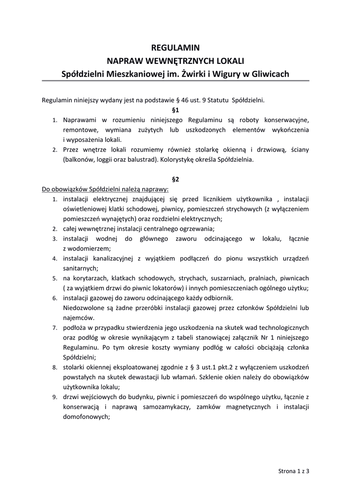 REGULAMIN NAPRAW WEWNĘTRZNYCH LOKALI Spółdzielni Mieszkaniowej im. Żwirki i Wigury w Gliwicach Regulamin niniejszy wydany jest na podstawie § 46 ust. 9 Statutu Spółdzielni. §1 1. Naprawami w rozumieniu niniejszego Regulaminu są roboty konserwacyjne, remontowe, wymiana zużytych lub uszkodzonych elementów wykończenia i wyposażenia lokali. 2. Przez wnętrze lokali rozumiemy również stolarkę okienną i drzwiową, ściany (balkonów, loggii oraz balustrad). Kolorystykę określa Spółdzielnia. §2 Do obowiązków Spółdzielni należą naprawy: 1. instalacji elektrycznej znajdującej się przed licznikiem użytkownika , instalacji oświetleniowej klatki schodowej, piwnicy, pomieszczeń strychowych (z wyłączeniem pomieszczeń wynajętych) oraz rozdzielni elektrycznych; 2. całej wewnętrznej instalacji centralnego ogrzewania; 3. instalacji wodnej do głównego zaworu odcinającego w lokalu, łącznie z wodomierzem; 4. instalacji kanalizacyjnej z wyjątkiem podłączeń do pionu wszystkich urządzeń sanitarnych; 5. na korytarzach, klatkach schodowych, strychach, suszarniach, pralniach, piwnicach ( za wyjątkiem drzwi do piwnic lokatorów) i innych pomieszczeniach ogólnego użytku; 6. instalacji gazowej do zaworu odcinającego każdy odbiornik. Niedozwolone są żadne przeróbki instalacji gazowej przez członków Spółdzielni lub najemców. 7. podłoża w przypadku stwierdzenia jego uszkodzenia na skutek wad technologicznych oraz podłóg w okresie wynikającym z tabeli stanowiącej załącznik Nr 1 niniejszego Regulaminu. Po tym okresie koszty wymiany podłóg w całości obciążają członka Spółdzielni; 8. stolarki okiennej eksploatowanej zgodnie z § 3 ust.1 pkt.2 z wyłączeniem uszkodzeń powstałych na skutek dewastacji lub włamań. Szklenie okien należy do obowiązków użytkownika lokalu; 9. drzwi wejściowych do budynku, piwnic i pomieszczeń do wspólnego użytku, łącznie z konserwacją i naprawą samozamykaczy, zamków magnetycznych i instalacji domofonowych; Strona 1 z 3 §3 Naprawy nie ujęte w § 2 ust.1 – 9 mogą być wykonywane przez Spółdzielnię wyłącznie odpłatnie na koszt użytkownika lokalu. §4 Naprawy, których zakres określa § 2 ust. 1 – 9 są finansowane z funduszu na remonty i konserwację. §5 Do obowiązków użytkownika lokalu należy: 1. odnawianie lokalu ( malowanie, tapetowanie itp.); 2. konserwacja stolarki okiennej i drzwiowej oraz grzejników, zlewozmywaków, rur i urządzeń malowanych kolejno dla zabezpieczenia przed korozją; 3. napawa urządzeń techniczno – sanitarnych, łącznie z wymianą tych urządzeń; 4. naprawa i wymian podłóg; 5. remont instalacji wewnętrznych: a. instalacji wodnych od zaworu odcinającego dopływ wody do lokalu, b. instalacji elektrycznej od tablicy pomiaru zużycia energii ( licznik pomiaru zużycia energii elektrycznej jest własnością Zakładu Energetycznego i każde uszkodzenie, rozplombowanie należy zgłosić dostawcy), c. instalacji gazowej od zaworu odcinającego dopływ gazu do odbiornika wraz z odbiornikiem UWAGA – WAŻNE każdą przeróbkę lub remont instalacji gazowej należy przed ponownym włączeniem gazu natychmiast zgłosić w Dziale Technicznym SM w celu wykonania pomiarów szczelności całej instalacji wraz z odbiornikami, d. instalacji kanalizacyjnej w zakresie wszystkich odpływów zamontowanych urządzeń ( wanna, umywalka, muszla klozetowa, pisuar, bidet, kabina, pralka, zlewozmywak, zmywarka itp.) e. instalacji domofonowej rozprowadzonej w lokalu przez użytkownika; 6. wymiana uszkodzonych zaworów termostatycznych ( uszkodzenia mechaniczne spowodowane przez użytkownika) UWAGA – WAŻNE – w celu prawidłowego funkcjonowania zaworów należy raz w miesiącu w okresie grzewczym przeprowadzić regulację polegającą na zakręceniu i ponownym odkręceniu każdego zaworu, 7. wymiana i remont stolarki okiennej i drzwiowej na zasadach obowiązujących w Spółdzielni Strona 2 z 3 §6 Koszty naprawy uszkodzeń wewnątrz lokalu powstałe z winy użytkownika ponosi on sam do pełnej wysokości. §7 Regulamin niniejszy wchodzi w życie z dniem uchwalenia przez Radę Nadzorczą tj. 29.09.2009 r. §8 Traci moc dotychczasowy regulamin z dnia 25.05.1996 r. Strona 3 z 3