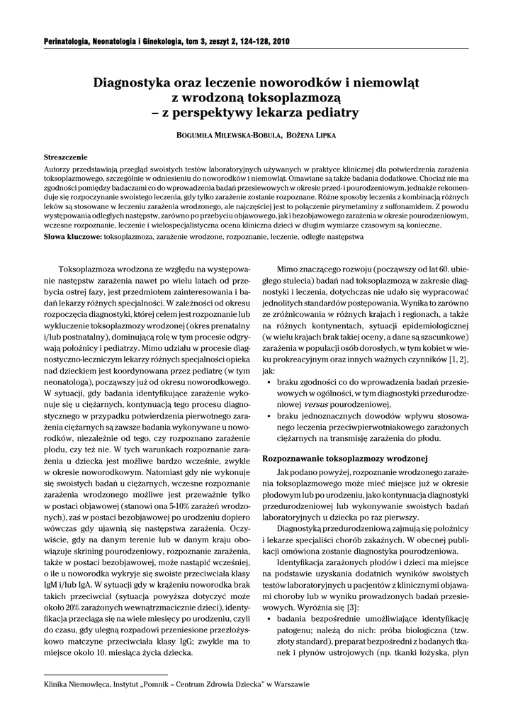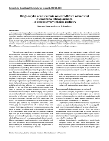 Perinatologia, Neonatologia i Ginekologia, tom 3, zeszyt 2, 124-128, 2010 Diagnostyka oraz leczenie noworodków i niemowląt z wrodzoną toksoplazmozą – z perspektywy lekarza pediatry BOGUMIŁA MILEWSKA-BOBULA, BOŻENA LIPKA Streszczenie Autorzy przedstawiają przegląd swoistych testów laboratoryjnych używanych w praktyce klinicznej dla potwierdzenia zarażenia toksoplazmowego, szczególnie w odniesieniu do noworodków i niemowląt. Omawiane są także badania dodatkowe. Chociaż nie ma zgodności pomiędzy badaczami co do wprowadzenia badań przesiewowych w okresie przed- i pourodzeniowym, jednakże rekomenduje się rozpoczynanie swoistego leczenia, gdy tylko zarażenie zostanie rozpoznane. Różne sposoby leczenia z kombinacją różnych leków są stosowane w leczeniu zarażenia wrodzonego, ale najczęściej jest to połączenie pirymetaminy z sulfonamidem. Z powodu występowania odległych następstw, zarówno po przebyciu objawowego, jak i bezobjawowego zarażenia w okresie pourodzeniowym, wczesne rozpoznanie, leczenie i wielospecjalistyczna ocena kliniczna dzieci w długim wymiarze czasowym są konieczne. Słowa kluczowe: toksoplazmoza, zarażenie wrodzone, rozpoznanie, leczenie, odległe następstwa Toksoplazmoza wrodzona ze względu na występowanie następstw zarażenia nawet po wielu latach od przebycia ostrej fazy, jest przedmiotem zainteresowania i badań lekarzy różnych specjalności. W zależności od okresu rozpoczęcia diagnostyki, której celem jest rozpoznanie lub wykluczenie toksoplazmozy wrodzonej (okres prenatalny i/lub postnatalny), dominującą rolę w tym procesie odgrywają położnicy i pediatrzy. Mimo udziału w procesie diagnostyczno-leczniczym lekarzy różnych specjalności opieka nad dzieckiem jest koordynowana przez pediatrę (w tym neonatologa), począwszy już od okresu noworodkowego. W sytuacji, gdy badania identyfikujące zarażenie wykonuje się u ciężarnych, kontynuacją tego procesu diagnostycznego w przypadku potwierdzenia pierwotnego zarażenia ciężarnych są zawsze badania wykonywane u noworodków, niezależnie od tego, czy rozpoznano zarażenie płodu, czy też nie. W tych warunkach rozpoznanie zarażenia u dziecka jest możliwe bardzo wcześnie, zwykle w okresie noworodkowym. Natomiast gdy nie wykonuje się swoistych badań u ciężarnych, wczesne rozpoznanie zarażenia wrodzonego możliwe jest przeważnie tylko w postaci objawowej (stanowi ona 5-10% zarażeń wrodzonych), zaś w postaci bezobjawowej po urodzeniu dopiero wówczas gdy ujawnią się następstwa zarażenia. Oczywiście, gdy na danym terenie lub w danym kraju obowiązuje skrining pourodzeniowy, rozpoznanie zarażenia, także w postaci bezobjawowej, może nastąpić wcześniej, o ile u noworodka wykryje się swoiste przeciwciała klasy IgM i/lub IgA. W sytuacji gdy w krążeniu noworodka brak takich przeciwciał (sytuacja powyższa dotyczyć może około 20% zarażonych wewnątrzmacicznie dzieci), identyfikacja przeciąga się na wiele miesięcy po urodzeniu, czyli do czasu, gdy ulegną rozpadowi przeniesione przezłożyskowo matczyne przeciwciała klasy IgG; zwykle ma to miejsce około 10. miesiąca życia dziecka. Mimo znaczącego rozwoju (począwszy od lat 60. ubiegłego stulecia) badań nad toksoplazmozą w zakresie diagnostyki i leczenia, dotychczas nie udało się wypracować jednolitych standardów postępowania. Wynika to zarówno ze zróżnicowania w różnych krajach i regionach, a także na różnych kontynentach, sytuacji epidemiologicznej (w wielu krajach brak takiej oceny, a dane są szacunkowe) zarażenia w populacji osób dorosłych, w tym kobiet w wieku prokreacyjnym oraz innych ważnych czynników [1, 2], jak: C braku zgodności co do wprowadzenia badań przesiewowych w ogólności, w tym diagnostyki przedurodzeniowej versus pourodzeniowej, C braku jednoznacznych dowodów wpływu stosowanego leczenia przeciwpierwotniakowego zarażonych ciężarnych na transmisję zarażenia do płodu. Rozpoznawanie toksoplazmozy wrodzonej Jak podano powyżej, rozpoznanie wrodzonego zarażenia toksoplazmowego może mieć miejsce już w okresie płodowym lub po urodzeniu, jako kontynuacja diagnostyki przedurodzeniowej lub wykonywanie swoistych badań laboratoryjnych u dziecka po raz pierwszy. Diagnostyką przedurodzeniową zajmują się położnicy i lekarze specjaliści chorób zakaźnych. W obecnej publikacji omówiona zostanie diagnostyka pourodzeniowa. Identyfikacja zarażonych płodów i dzieci ma miejsce na podstawie uzyskania dodatnich wyników swoistych testów laboratoryjnych u pacjentów z klinicznymi objawami choroby lub w wyniku prowadzonych badań przesiewowych. Wyróżnia się [3]: C badania bezpośrednie umożliwiające identyfikację patogenu; należą do nich: próba biologiczna (tzw. złoty standard), preparat bezpośredni z badanych tkanek i płynów ustrojowych (np. tkanki łożyska, płyn Klinika Niemowlęca, Instytut „Pomnik – Centrum Zdrowia Dziecka” w Warszawie Diagnostyka oraz leczenie noworodków i niemowląt z wrodzoną toksoplazmozą mózgowo-rdzeniowy) oraz reakcja polimerazowa pozwalająca wykryć DNA pierwotniaka (głównie w płynie owodniowym, w płynie mózgowo-rdzeniowym, płynie z komory przedniej oka), a także metody wykrywające antygeny pierwotniaka [4]; ograniczeniem stosowania tych metod jest długi okres oczekiwania na wynik (próba biologiczna) oraz brak powszechnej dostępności; C badania pośrednie polegające na wykrywaniu i różnicowaniu swoistych przeciwciał różnych klas (IgM, IgA, IgG) we krwi i w płynach ustrojowych; z kolei ograniczeniem w tej metodzie może być niedostateczna produkcja przez pacjenta przeciwciał spowodowana niedojrzałością układu odpornościowego (noworodki, w tym urodzone przedwcześnie oraz najmłodsze niemowlęta) bądź zahamowaniem produkcji przeciwciał wskutek wrodzonych czy nabytych defektów odporności. W praktyce swoista diagnostyka toksoplazmozy, w tym wrodzonej, polega prz