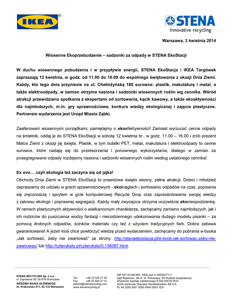 Warszawa, 3 kwietnia 2014 Wiosenne Ekoprzebudzenie – sadzonki za odpady w STENA EkoStacji W duchu wiosennego pobudzenia i w przypływie energii, STENA EkoStacja i IKEA Targówek zapraszają 12 kwietnia, w godz. od 11.00 do 16.00 do wspólnego świętowania z okazji Dnia Ziemi. Każdy, kto tego dnia przyniesie na ul. Chełmżyńską 180 surowce: plastik, makulaturę i metal, a także elektroodpady, w zamian otrzyma nasiona i sadzonki wiosennych roślin wg cennika. Wśród atrakcji przewidziano spotkania z ekspertami od sortowania, kącik kawowy, a także ekoaktywności dla najmłodszych, m.in. gry sprawnościowe, konkurs wiedzy ekologicznej i zajęcia plastyczne. Partnerem wydarzenia jest Urząd Miasta Ząbki. Zaaferowani wiosennymi porządkami, pamiętajmy o ekoefektywności! Zamiast wyrzucać cenne odpady na śmietnik, oddaj je do STENA EkoStacji w sobotę 12 kwietnia br., w godz. 11.00 – 16.00 i zrób prezent Matce Ziemi z okazji jej święta. Plastik, w tym butelki PET, metal, makulatura i elektroodpady to cenne surowce, które nadają się do przetworzenia i ponownego wykorzystania, dlatego w zamian za posegregowane odpady rozdajemy nasiona i sadzonki wiosennych roślin według ustalonego cennika! Ex ovo… czyli ekologia też zaczyna się od jajka! Obchody Dnia Ziemi w STENA EkoStacji to prawdziwe święto wiosny, pełne atrakcji. Dzieci i młodzież zapraszamy do udziału w grach sprawnościowych - ekokręglach i sortowaniu odpadów na czas, popisania się zręcznością i sprytem w grze komputerowej Recycle Drop oraz zaprezentowania swojej wiedzy z zakresu ekologii i poprawnej segregacji. Każdy mały zwycięzca otrzyma oczywiście ekoniespodziankę. W ramach plastycznych aktywności o wielkanocnym charakterze, zachęcamy zarówno najmłodszych, jak i ich rodziców do puszczenia wodzy fantazji i niecodziennego udekorowania dużego modelu pisanki – za pomocą drobnych odpadów, ścinków materiału czy też z użyciem tradycyjnych farb. Dobra zabawa gwarantowana! A jeżeli ktoś chce powtórzyć wiedzę przed wydarzeniem, zachęcamy do pobrania e-booka „Jak sortować, żeby nie zwariować” ze strony: http://stenaekostacja.pl/e-book-jak-sortowac-zeby-niezwariowac/ lub http://czterykaty.pl/czterykaty/0,136087.html. STENA RECYCLING Sp. z o.o. ul. Ogrodowa 58, 00-876 Warszawa SIEDZIBA BIURA GŁÓWNEGO: Al. Krakowska 271, 02-133 Warszawa Tel. +48 22 520 27 00 Fax: +48 22 520 27 01 [email protected] www.stenarecycling.pl NIP 527-23-46-985, KRS pod nr 0000027111 Sąd Rejonowy dla m. st. Warszawy, XII Wydział Gospodarczy Wysokość kapitału zakładowego 8 000 000,00 PLN Konto bankowe: Svenska Handelsbanken AB S.A. PL 84 2250 0001 0000 0040 0053 1251 Ekoatrakcji nigdy dość! STENA EkoStacja to wyjątkowe miejsce m.in. ze względu na Showroom przygotowany wspólnie z IKEA Targówek, w którym można obejrzeć wystawę edukacyjną nt. recyklingu oraz zobaczyć jak tworząc ekownętrza, żyć w zgodzie z najnowszymi trendami i naturą. Propagując ideę zrównoważonego życia w domu, IKEA pragnie pokazać, że ekologia to przede wszystkim małe zmiany w codziennych czynnościach, które przynoszą duże efekty. Dzień Ziemi to także doskonała okazja, by zwiedzić stację recyklingu z ekoprzewodnikami i zadać im nurtujące pytania, dotyczące nowych regulacji ustawowych, zasad sortowania, czy też fascynujących możliwości, jakie daje przetwarzanie odpadów - eksperci Stena Recycling będą do dyspozycji przez cały czas trwania eventu. Na posilenie i uzupełnienie energii odwiedzających gwarantujemy także stawiającą na nogi słodką szwedzką przekąskę, a o podsumowanie ekowrażeń poprosimy w pamiątkowej księdze EkoStacji. „Inspirowanie do ekodziałania, symbolicznie wyrażone w haśle tegorocznej edycji obchodów Dnia Ziemi to jedno z podstawowych założeń STENA EkoStacji. Cieszymy się, że od ponad 1,5 roku z powodzeniem udaje nam się je realizować. Kolejne inicjatywy na terenie stacji recyklingu przyciągają coraz więcej warszawiaków i mieszkańców okolicznych gmin. 12 kwietnia to doskonały moment, by przy okazji wiosennych porządków pozbyć się odpadów w najlepszy możliwy sposób, zgodny z ekozasadami, a także szansa, by w miłej atmosferze i poprzez zabawę zagłębić się w fascynujący świat recyklingu.” – komentuje Anna Nowakowska ze Stena Recycling. Twoje odpady są w cenie! Zbieramy: butelki PET i puszki aluminiowe; papier oraz zużyty sprzęt elektryczny i elektroniczny. W zamian rozdajemy nasiona i sadzonki wiosennych roślin wg cennika: BUTELKI PET/ PUSZKI ALUMINIOWE Poniżej 10 szt. 1 kupon 1 szt. nasionek kwiatów 10 - 30 szt. 2 kupony 2 szt. nasionek kwiatów 31 - 40 szt. 3 kupony 1 sadzonka Każde kolejne 40 szt. STENA RECYCLING Sp. z o.o. ul. Ogrodowa 58, 00-876 Warszawa SIEDZIBA BIURA GŁÓWNEGO: Al. Krakowska 271, 02-133 Warszawa Tel. +48 22 520 27 00 Fax: +48 22 520 27 01 [email protected] www.stenarecycling.pl 1 sadzonka NIP 527-23-46-985, KRS pod nr 0000027111 Sąd Rejonowy dla m. st. Warszawy, XII Wydział Gospodarczy Wysokość kapitału zakładowego 8 000 000,00 PLN Konto bankowe: Svenska Handelsbanken AB S.A. PL 84 2250 0001 0000 0040 0053 1251 PAPIER Poniżej 5 kg 1 kupon 1 szt. nasionek kwiatów 5 – 15 kg 2 kupony 2 szt. nasionek kwiatów 16 – 30 kg 3 kupony 1 sadzonka Każde kolejne 30 kg 1 sadzonka ELEKTROODPADY Mały sprzęt (suszarka, żelazko, mikser) Średni sprzęt (mikrofalówka, telewizor, odkurzacz, komputer) Duży sprzęt (lodówka, pralka) 3 kupony 1 sadzonka 6 kuponów 2 sadzonki 9 kuponów 3 sadzonki W STENA EkoStacji można oddać wszystkie rodzaje surowców, zużyty sprzęt elektryczny i elektroniczny, a także odpady wielkogabarytowe, kłopotliwe i niebezpieczne. Stacja jest czynna przez cały tydzień, od pn. do pt. w godz. od 8.00 do 20.00, a w weekendy od 9.00 do 15.00. Nowoczesny obiekt pozwala na wygodne poruszanie się samochodem po wyznaczonych pasach ruchu, prowadzących do właściwyc