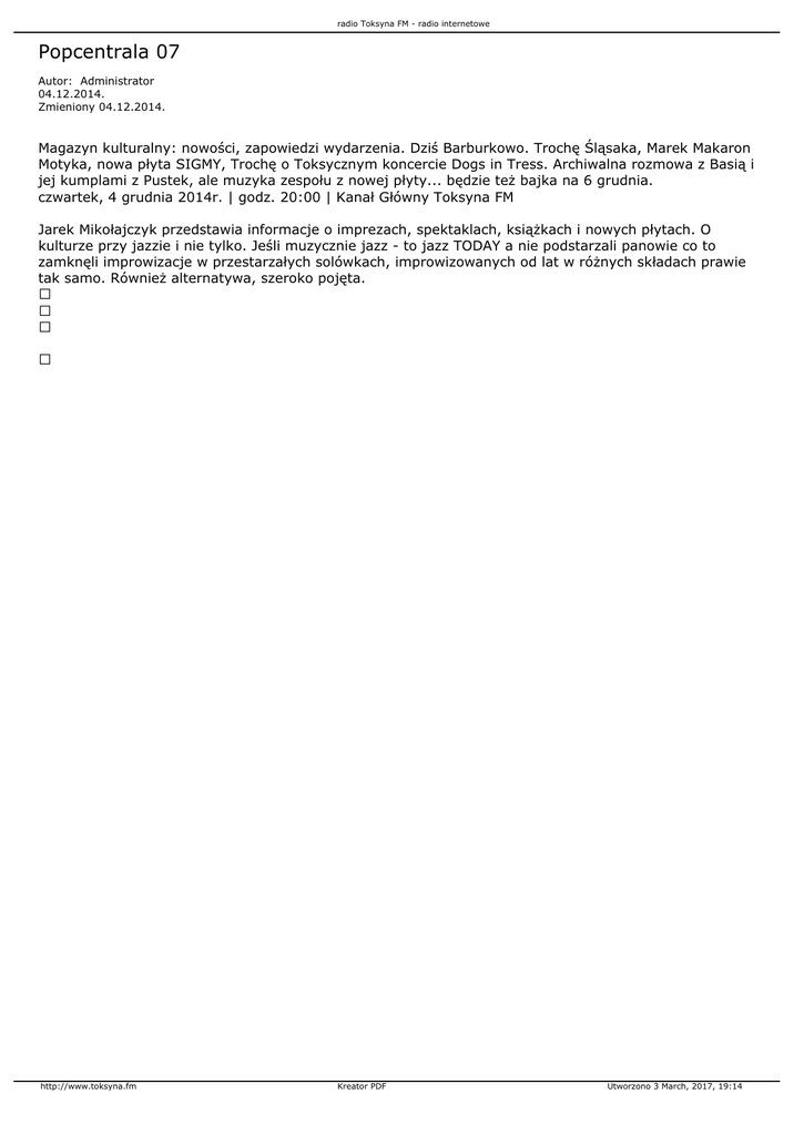 radio Toksyna FM - radio internetowe Popcentrala 07 Autor: Administrator 04.12.2014. Zmieniony 04.12.2014. Magazyn kulturalny: nowości, zapowiedzi wydarzenia. Dziś Barburkowo. Trochę Śląsaka, Marek Makaron Motyka, nowa płyta SIGMY, Trochę o Toksycznym koncercie Dogs in Tress. Archiwalna rozmowa z Basią i jej kumplami z Pustek, ale muzyka zespołu z nowej płyty... będzie też bajka na 6 grudnia. czwartek, 4 grudnia 2014r. | godz. 20:00 | Kanał Główny Toksyna FM Jarek Mikołajczyk przedstawia informacje o imprezach, spektaklach, książkach i nowych płytach. O kulturze przy jazzie i nie tylko. Jeśli muzycznie jazz - to jazz TODAY a nie podstarzali panowie co to zamknęli improwizacje w przestarzałych solówkach, improwizowanych od lat w różnych składach prawie tak samo. Również alternatywa, szeroko pojęta. http://www.toksyna.fm Kreator PDF Utworzono 3 March, 2017, 19:14