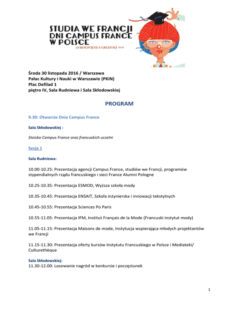 Środa 30 listopada 2016 / Warszawa Pałac Kultury i Nauki w Warszawie (PKiN) Plac Defilad 1 piętro IV, Sala Rudniewa i Sala Skłodowskiej PROGRAM 9.30: Otwarcie Dnia Campus France Sala Skłodowskiej : Stoisko Campus France oraz francuskich uczelni Sesja 1 Sala Rudniewa: 10.00-10.25: Prezentacja agencji Campus France, studiów we Francji, programów stypendialnych rządu francuskiego i sieci France Alumni Pologne 10.25-10.35: Prezentacja ESMOD, Wyższa szkoła mody 10.35-10.45: Prezentacja ENSAIT, Szkoła inżynierska i innowacji tekstylnych 10.45-10.55: Prezentacja Sciences Po Paris 10.55-11.05: Prezentacja IFM, Institut Français de la Mode (Francuski instytut mody) 11.05-11.15: Prezentacja Maisons de mode, Instytucja wspierająca młodych projektantów we Francji 11.15-11.30: Prezentacja oferty kursów Instytutu Francuskiego w Polsce i Mediateki/ Culturethèque Sala Skłodowskiej: 11.30-12.00: Losowanie nagród w konkursie i poczęstunek 1 Sesja 2 Sala Rudniewa: 13.00-13.25 Prezentacja agencji Campus France, studiów we Francji, programów stypendialnych rządu francuskiego i sieci France Alumni Pologne 13.25-13.35: Prezentacja ESMOD, Wyższa szkoła mody 13.35-13.45: Prezentacja ENSAIT, Szkoła inżynierska i innowacji tekstylnych 13.45-13.55: Prezentacja Sciences Po Paris 13.55-14.05: Prezentacja IFM, Institut Français de la Mode (Francuski instytut mody) 14.05-14.15: Prezentacja Maisons de mode, Instytucja wspierająca młodych projektantów we Francji 14.15-14.30: Prezentacja oferty kursów Instytutu Francuskiego w Polsce i Mediateki/ Culturethèque 15.00: Zakończenie dnia Campus France 2