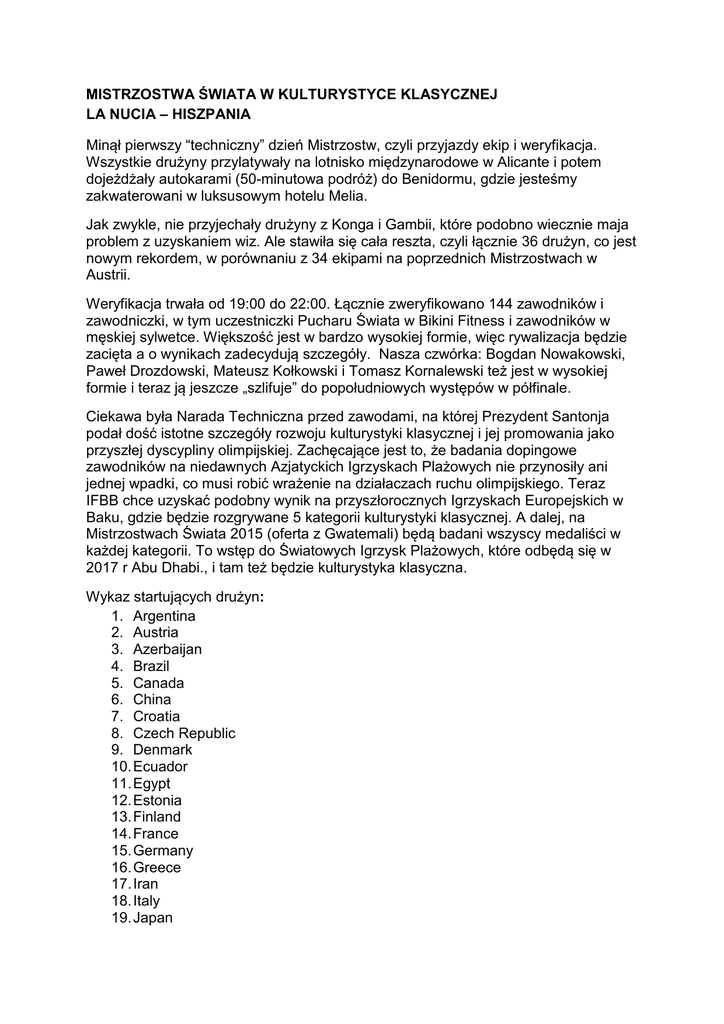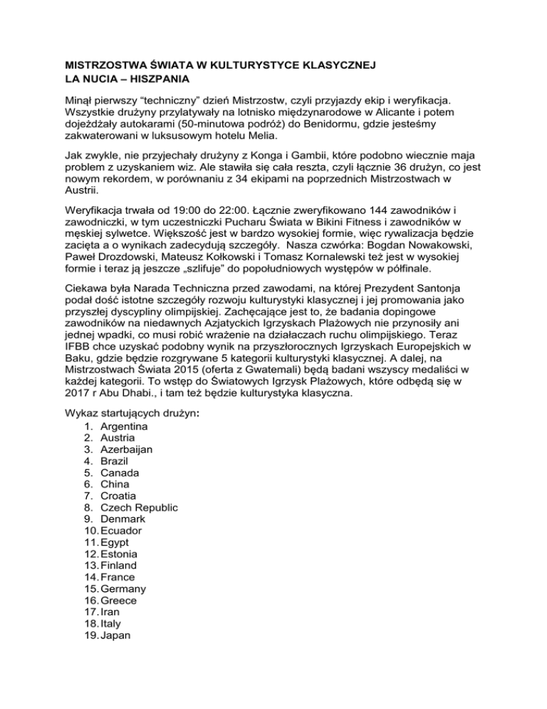 MISTRZOSTWA ŚWIATA W KULTURYSTYCE KLASYCZNEJ LA NUCIA – HISZPANIA Minął pierwszy “techniczny” dzień Mistrzostw, czyli przyjazdy ekip i weryfikacja. Wszystkie drużyny przylatywały na lotnisko międzynarodowe w Alicante i potem dojeżdżały autokarami (50-minutowa podróż) do Benidormu, gdzie jesteśmy zakwaterowani w luksusowym hotelu Melia. Jak zwykle, nie przyjechały drużyny z Konga i Gambii, które podobno wiecznie maja problem z uzyskaniem wiz. Ale stawiła się cała reszta, czyli łącznie 36 drużyn, co jest nowym rekordem, w porównaniu z 34 ekipami na poprzednich Mistrzostwach w Austrii. Weryfikacja trwała od 19:00 do 22:00. Łącznie zweryfikowano 144 zawodników i zawodniczki, w tym uczestniczki Pucharu Świata w Bikini Fitness i zawodników w męskiej sylwetce. Większość jest w bardzo wysokiej formie, więc rywalizacja będzie zacięta a o wynikach zadecydują szczegóły. Nasza czwórka: Bogdan Nowakowski, Paweł Drozdowski, Mateusz Kołkowski i Tomasz Kornalewski też jest w wysokiej formie i teraz ją jeszcze „szlifuje” do popołudniowych występów w półfinale. Ciekawa była Narada Techniczna przed zawodami, na której Prezydent Santonja podał dość istotne szczegóły rozwoju kulturystyki klasycznej i jej promowania jako przyszłej dyscypliny olimpijskiej. Zachęcające jest to, że badania dopingowe zawodników na niedawnych Azjatyckich Igrzyskach Plażowych nie przynosiły ani jednej wpadki, co musi robić wrażenie na działaczach ruchu olimpijskiego. Teraz IFBB chce uzyskać podobny wynik na przyszłorocznych Igrzyskach Europejskich w Baku, gdzie będzie rozgrywane 5 kategorii kulturystyki klasycznej. A dalej, na Mistrzostwach Świata 2015 (oferta z Gwatemali) będą badani wszyscy medaliści w każdej kategorii. To wstęp do Światowych Igrzysk Plażowych, które odbędą się w 2017 r Abu Dhabi., i tam też będzie kulturystyka klasyczna. Wykaz startujących drużyn: 1. Argentina 2. Austria 3. Azerbaijan 4. Brazil 5. Canada 6. China 7. Croatia 8. Czech Republic 9. Denmark 10. Ecuador 11. Egypt 12. Estonia 13. Finland 14. France 15. Germany 16. Greece 17. Iran 18. Italy 19. Japan 20. Korea 21. Latvia 22. Lithuania 23. Moldova 24. Nicaragua 25. Netherlands 26. Norway 27. Poland 28. Portugal 29. Romania 30. Russia 31. Slovakia 32. South Africa 33. Spain 34. Sweden 35. Ukraine 36. United Kingdom Lista startowa w załączeniu. Najtrudniejsza jest najwyższa kategoria, powyżej 180 cm, w której zweryfikowano aż 25 zawodników. Tam też startują Kornalewski i Kołkowski, którym przyjdzie wałczyć z takimi mistrzami jak Andryj Kucharczuk, Lubos Malinak, Sergiej Chalepo czy Drażen Vrbancic. W kategorii do 180 cm zweryfikowało się 18 zawodników. Tutaj wystąpi nasz debiutant Paweł Drozdowski. Świetnie prezentuje się też Bogdan Nowakowski, który będzie miał 14 rywali z kategorii do 175 cm. Prosto z Benidormu: Andrzej Michalak