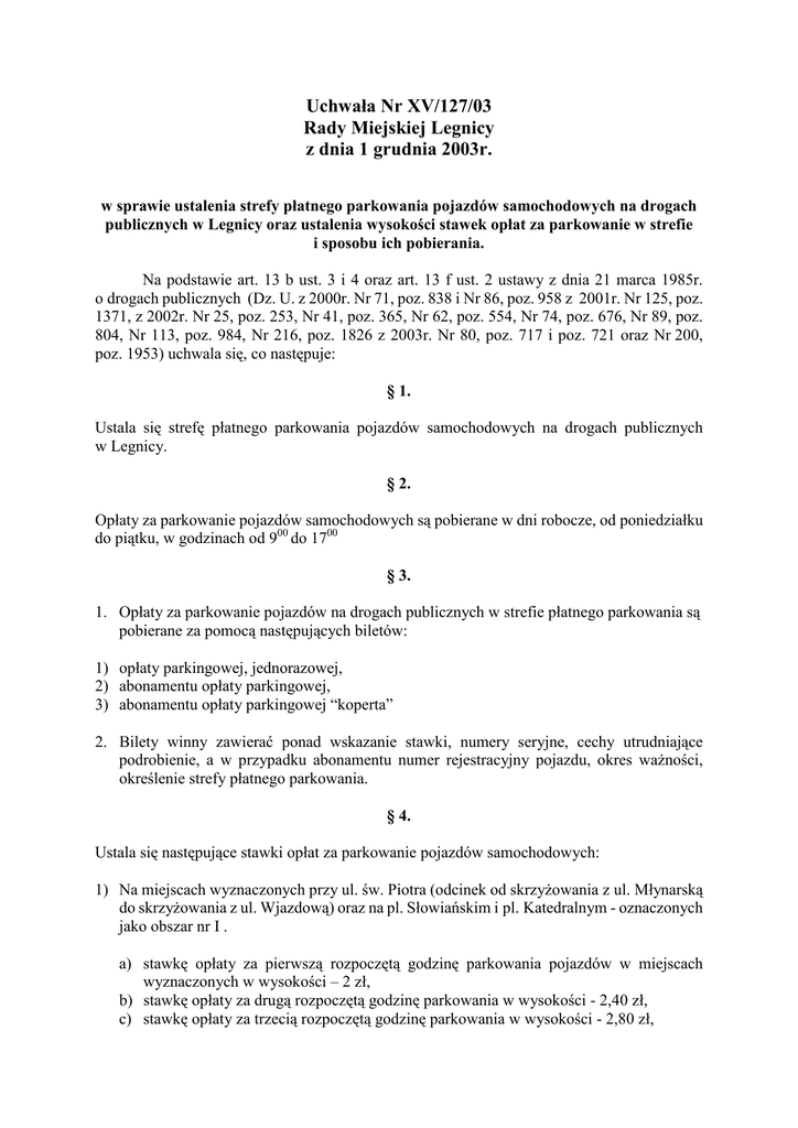 Uchwała Nr XV/127/03 Rady Miejskiej Legnicy z dnia 1 grudnia 2003r. w sprawie ustalenia strefy płatnego parkowania pojazdów samochodowych na drogach publicznych w Legnicy oraz ustalenia wysokości stawek opłat za parkowanie w strefie i sposobu ich pobierania. Na podstawie art. 13 b ust. 3 i 4 oraz art. 13 f ust. 2 ustawy z dnia 21 marca 1985r. o drogach publicznych (Dz. U. z 2000r. Nr 71, poz. 838 i Nr 86, poz. 958 z 2001r. Nr 125, poz. 1371, z 2002r. Nr 25, poz. 253, Nr 41, poz. 365, Nr 62, poz. 554, Nr 74, poz. 676, Nr 89, poz. 804, Nr 113, poz. 984, Nr 216, poz. 1826 z 2003r. Nr 80, poz. 717 i poz. 721 oraz Nr 200, poz. 1953) uchwala się, co następuje: § 1. Ustala się strefę płatnego parkowania pojazdów samochodowych na drogach publicznych w Legnicy. § 2. Opłaty za parkowanie pojazdów samochodowych są pobierane w dni robocze, od poniedziałku do piątku, w godzinach od 900 do 1700 § 3. 1. Opłaty za parkowanie pojazdów na drogach publicznych w strefie płatnego parkowania są pobierane za pomocą następujących biletów: 1) opłaty parkingowej, jednorazowej, 2) abonamentu opłaty parkingowej, 3) abonamentu opłaty parkingowej “koperta” 2. Bilety winny zawierać ponad wskazanie stawki, numery seryjne, cechy utrudniające podrobienie, a w przypadku abonamentu numer rejestracyjny pojazdu, okres ważności, określenie strefy płatnego parkowania. § 4. Ustala się następujące stawki opłat za parkowanie pojazdów samochodowych: 1) Na miejscach wyznaczonych przy ul. św. Piotra (odcinek od skrzyżowania z ul. Młynarską do skrzyżowania z ul. Wjazdową) oraz na pl. Słowiańskim i pl. Katedralnym - oznaczonych jako obszar nr I . a) stawkę opłaty za pierwszą rozpoczętą godzinę parkowania pojazdów w miejscach wyznaczonych w wysokości – 2 zł, b) stawkę opłaty za drugą rozpoczętą godzinę parkowania w wysokości - 2,40 zł, c) stawkę opłaty za trzecią rozpoczętą godzinę parkowania w wysokości - 2,80 zł, d) stawkę opłaty za czwartą rozpoczętą godzinę parkowania i kolejne godziny parkowania w wysokości – 2 zł, e) stawkę opłaty abonamentowej w wysokości: 90,0 zł - za miesiąc, 250,0 zł - za kwartał, 500,0 zł - za pół roku, 900,0 zł - za rok, f) stawkę opłaty abonamentowej za parkowanie na wydzielonym stanowisku postojowym, zastrzeżonym na prawach wyłączności /”koperta”/, w określonych godzinach lub całodobowo, na okres nie krótszy niż jeden miesiąc, w wysokości: 700,0 zł za użytkowanie całodobowe, 500,0 zł za parkowanie w dniach użytkowania w godz. od 900- 1700. 2) Na miejscach wyznaczonych przy ulicach i na placach: a) Parkowej, Rycerskiej, Murarskiej, Złotoryjskiej (odcinek od ul. Gwarnej do przejścia podziemnego), Dąbrowskiego, Skarbowej (odcinek od kładki dla pieszych do pl. Klasztornego), M.C. Skłodowskiej (odcinek od ul. Nowej do ul. Piastowskiej), Chojnowskiej (odcinek od ul. Piastowskiej do Rynku), B. Bilsego, pl. Zamkowy, pl. Klasztorny, Nowej, Młynarskiej, Rycerskiej, pl. Bohaterów Getta, św. Piotra (odcinek od ul. Biskupiej do ul. Młynarskiej) - oznaczonych jako obszar nr II, b) ul. Skarbowej (odcinek od ul. Dworcowej do kładki dla pieszych) – oznaczonych jako obszar nr III, c) ul. Górniczej (odcinek od ul. Galaktycznej do ul. Orbitalnej) – oznaczonych jako obszar nr IV, − stawkę opłaty za pierwszą rozpoczętą godzinę parkowania pojazdów w miejscach wyznaczonych w wysokości – 1 zł, − stawkę opłaty za drugą rozpoczętą godzinę parkowania w wysokości – 1,20zł, − stawkę opłaty za trzecią rozpoczętą godzinę parkowania w wysokości – 1,40zł, − stawkę opłaty za czwartą rozpoczętą godzinę parkowania i kolejne godziny parkowania w wysokości - 1zł, − stawkę opłaty abonamentowej w wysokości: 50,0 zł - za miesiąc, 140,0 zł - za kwartał, 280,0 zł - za pół roku, 560,0 zł - za rok, − stawkę opłaty abonamentowej za parkowanie na wydzielonym stanowisku postojowym zastrzeżonym na prawach wyłączności /”koperta”/, w określonych godzinach lub całodobowo, na okres nie krótszy niż jeden miesiąc, w wysokości: 500,0 zł za użytkowanie całodobowe, 380,0 zł za parkowanie w dniach użytkowania w godz. od 900 - 1700. 3) Stawkę zerową opłaty dla następujących użytkowników dróg: 2 a) osób fizycznych posiadających adres zamieszkania w strefie płatnego parkowania i legitymujących się identyfikatorem wydanym przez Zarząd Dróg Miejskich w Legnicy, b) osób niepełnosprawnych o obniżonej sprawności ruchowej posiadających pojazdy zaopatrzone w kartę parkingową. § 5. 1. Identyfikator, o którym mowa w § 4 ust. 3 pkt 1 może być wydany na wniosek osoby fizycznej, która okaże meldunek potwierdzający adres zamieszkania w strefie płatnego parkowania oraz dowód rejestracyjny pojazdu, na który wystawiony będzie identyfikator, a w przypadku, gdy wnioskujący nie jest właścicielem lub współwłaścicielem pojazdu okaże umowę leasingową lub umowę sprzedaży ratalnej /fakturę/ poświadczającą prawo do korzystania z pojazdu, na który ma być wydany identyfikator. 2. W przypadku posiadania przez osoby wymienione w ust. 1 więcej pojazdów samochodowych, identyfikator przysługuje tylko na jeden pojazd samochodowy wskazany przez tę osobę. 3. Identyfikator jest ważny przez okres jednego roku od dnia wydania. 4. Identyfikator będzie sporządzony w formie karty zawierającej swój numer seryjny, numer rejestracyjny pojazdu samochodowego, oznaczenie obszaru płatnego parkowania wraz ze wskazaniem miejsca, gdzie dany pojazd samochodowy może zostać zaparkowany, cechy utrudniające podrobienie oraz termin ważności. Posiadacz identyfikatora ma uprawnienia do parkowania bez wnoszenia opłat za parkowanie na parkingu najbliżej miejsca zamieszkania. 5. Z identyfikatora mogą korzystać oprócz osób uprawnionych do wnioskowania o wydanie identyfikatora także osoby z nimi zamieszkujące, co powinno być potwierdzone