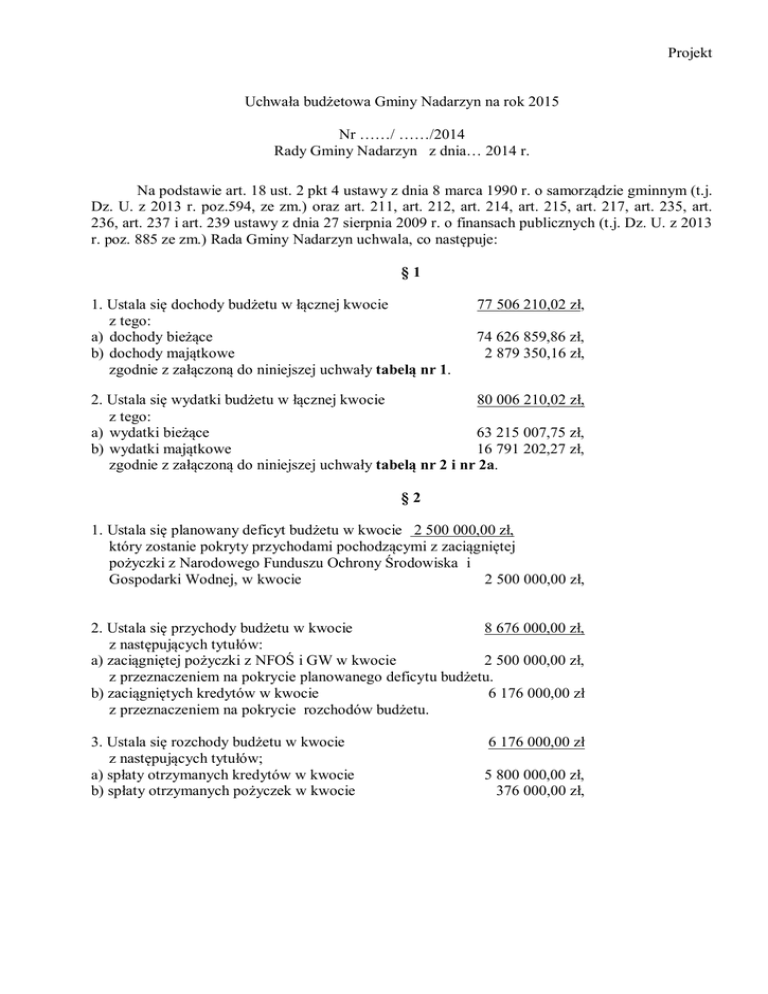 Projekt Uchwała budżetowa Gminy Nadarzyn na rok 2015 Nr ……/ ……/2014 Rady Gminy Nadarzyn z dnia… 2014 r. Na podstawie art. 18 ust. 2 pkt 4 ustawy z dnia 8 marca 1990 r. o samorządzie gminnym (t.j. Dz. U. z 2013 r. poz.594, ze zm.) oraz art. 211, art. 212, art. 214, art. 215, art. 217, art. 235, art. 236, art. 237 i art. 239 ustawy z dnia 27 sierpnia 2009 r. o finansach publicznych (t.j. Dz. U. z 2013 r. poz. 885 ze zm.) Rada Gminy Nadarzyn uchwala, co następuje: §1 1. Ustala się dochody budżetu w łącznej kwocie z tego: a) dochody bieżące b) dochody majątkowe zgodnie z załączoną do niniejszej uchwały tabelą nr 1. 77 506 210,02 zł, 74 626 859,86 zł, 2 879 350,16 zł, 2. Ustala się wydatki budżetu w łącznej kwocie 80 006 210,02 zł, z tego: a) wydatki bieżące 63 215 007,75 zł, b) wydatki majątkowe 16 791 202,27 zł, zgodnie z załączoną do niniejszej uchwały tabelą nr 2 i nr 2a. §2 1. Ustala się planowany deficyt budżetu w kwocie 2 500 000,00 zł, który zostanie pokryty przychodami pochodzącymi z zaciągniętej pożyczki z Narodowego Funduszu Ochrony Środowiska i Gospodarki Wodnej, w kwocie 2 500 000,00 zł, 2. Ustala się przychody budżetu w kwocie 8 676 000,00 zł, z następujących tytułów: a) zaciągniętej pożyczki z NFOŚ i GW w kwocie 2 500 000,00 zł, z przeznaczeniem na pokrycie planowanego deficytu budżetu. b) zaciągniętych kredytów w kwocie 6 176 000,00 zł z przeznaczeniem na pokrycie rozchodów budżetu. 3. Ustala się rozchody budżetu w kwocie z następujących tytułów; a) spłaty otrzymanych kredytów w kwocie b) spłaty otrzymanych pożyczek w kwocie 6 176 000,00 zł 5 800 000,00 zł, 376 000,00 zł, §3 1. W budżecie tworzy się rezerwę ogólną w wysokości 520 000,00 zł. 2. W budżecie tworzy się rezerwę celową na realizację zadań z zakresu zarządzania kryzysowego w wysokości 250 000,00 zł. §4 Ustala się dochody i wydatki związane z realizacją: a) zadań z zakresu administracji rządowej i innych zleconych jednostce samorządu terytorialnego odrębnymi ustawami, zgodnie z załącznikiem nr 1 i nr 2, b) zadań wykonywanych na mocy porozumień z organami administracji rządowej, zgodnie z załącznikiem nr 3, c) zadań realizowanych w drodze umów lub porozumień między jednostkami samorządu terytorialnego, zgodnie z załącznikiem nr 4. §5 1.Ustala się dochody z tytułu wydawania zezwoleń na sprzedaż napojów alkoholowych i wydatki na realizację zadań określonych w gminnym programie profilaktyki i rozwiązywania problemów alkoholowych oraz na realizację zadań określonych w gminnym programie przeciwdziałania narkomanii, zgodnie z załącznikiem nr 5. 2.Ustala się dochody pochodzące z opłat za gospodarowanie odpadami komunalnymi oraz wydatki na pokrycie kosztów funkcjonowania systemu gospodarowania odpadami komunalnymi, zgodnie z załącznikiem nr 6. 3.Ustala się dochody i wydatki na realizację zadań z zakresu ochrony środowiska i gospodarki wodnej, zgodnie z załącznikiem nr 7. 4. Ustala się dochody z tytułu grzywien nałożonych za naruszenia przepisów ruchu drogowego ujawnione za pomocą urządzeń rejestrujących oraz wydatki z przeznaczeniem zgodnym z art. 20d ustawy z dnia 21 marca 1985 r. o drogach publicznych zgodnie z załącznikiem nr 8. §6 Wyodrębnia się w budżecie gminy środki do dyspozycji rad sołeckich w ramach funduszu sołeckiego na podstawie ustawy z dnia 21 lutego 2014r o funduszu sołeckim (Dz. U. z 2014r. poz.301), zgodnie z planem wydatków określonym w załączniku nr 9. §7 Ustala się limity zobowiązań z tytułu zaciąganych pożyczek i kredytów na: a) pokrycie występującego w ciągu roku przejściowego deficytu budżetu jednostki samorządu terytorialnego, do kwoty 5 000 000,00 zł, b) pokrycie planowanego deficytu budżetu do kwoty 2 500 000,00 zł, c) spłatę kredytów i pożyczek z lat ubiegłych w kwocie określonej w § 2 ust. 3 lit. a i b. §8 Upoważnia się Wójta do zaciągania kredytów i pożyczek, o których mowa w § 7, do wysokości kwot w nich określonych. §9 Ustala się dotacje: 1.podmiotowe dla jednostek sektora finansów publicznych w kwocie 2 010 000,00 zł, zgodnie z załącznikiem nr 10, 2. dla jednostek spoza sektora finansów publicznych a) celowe na zadania własne w kwocie 1 601 440,00 zł, zgodnie z załącznikiem 11, b) podmiotowe w kwocie 4 600 000,00 zł, zgodnie z załącznikiem nr 12. § 10 Upoważnia się Wójta Gminy Nadarzyn do: 1. Dokonywania zmian w planie wydatków na uposażenia i wynagrodzenia ze stosunku pracy, z wyłączeniem przeniesień wydatków między działami. 2. Dokonywania zmian w ramach działu w planie jednorocznych zadań inwestycyjnych nie powodujących zmian w programie tych zadań tzn. bez możliwości wprowadzenia nowych zadań czy rezygnacji z wykonania przyjętych przez Radę Gminy. 3. Przekazania uprawnień innym jednostkom organizacyjnym do zaciągania zobowiązań z tytułu umów, których realizacja w roku budżetowym i w latach następnych jest niezbędna do zapewnienia ciągłości działania jednostki i z których wynikające płatności wykraczają poza rok budżetowy. 4. Lokowania wolnych środków budżetowych na rachunkach w innych bankach niż wykonywana jest bankowa obsługa budżetu Gminy. § 11 1. Wykonanie budżetu powierza się Wójtowi Gminy Nadarzyn. 2. Uchwała wchodzi w życie z dniem 1 stycznia 2015 roku i podlega ogłoszeniu w trybie przewidzianym dla aktów prawa miejscowego.