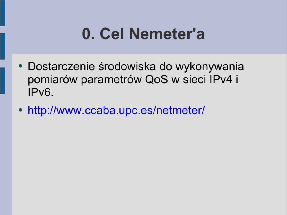 0. Cel Nemeter'a ● ● Dostarczenie środowiska do wykonywania pomiarów parametrów QoS w sieci IPv4 i IPv6. http://www.ccaba.upc.es/netmeter/ 1. Czym jest Netmeter? ● Nakładka graficzna ułatwiająca [zdalne] wywoływanie programów pomiarowych oraz generowanie wykresów na podstawie uzyskanych wyników. 2a. Instalacja (nakładka) ● ● ● sama nakładka wymaga jedynie rozpakowania (do dowolnego katalogu), gdyż jest wykonana w postaci skryptów okienkowych (wish, wymaga Tcl/Tk) do generowania wykresów konieczna jest kompilacja zawartości katalogu "plugins" w drzewie dystrybucji wymagane biblioteki w systemie: zlib, lib-png, libgd 2b. Instalacja (narzędzia pomiarowe i generatory ruchu) ● mgen - kompilacja ze źródeł (ps. od# parametry w Makefile'u) ● netperf - kompilacja ze źrodeł ● Do ściągnięcia: http://www.ccaba.upc.es/netmeter/script/download.php?file=netmeter-2.0.7.tar.bz2 http://www.boutell.com/gd/http/gd-2.0.33.tar.gz http://matrix.it.uc3m.es/~long/software/mgen6/mgen4/src-mgen-3.3.4-uc3m.tgz ftp://ftp.netperf.org/netperf/netperf-2.4.1.tar.gz 3a. Przygotowanie do pomiarów ● ● w zakładce Main: – wybór komputerów: nadawcy, odbiorcy i zarządcy (SRC, DST, LOC). – Dla celów testowych może być to ten sam komputer. Adres IP odbiorcy. w zakładce Throughput – ● pomiar przepustowości - wykorzystuje netperf'a w zakładce One-way Delay – pomiar opóźnienia - wykorzystuje mgen'a 3b. Przygotowanie do pomiarów ● ● ● ● ścieżki do powyższych narzędzi pomiarowych należy podać w odpowiednich zakładkach UWAGA - należy zsynchronizować czas na komputerach nadawcy i odbiorcy przydatne mogą być: ssh, date MMDDhhmm Aby uniknąć wpisywania hasła przy zdalnym wywoływaniu programów należy użyć uwierzytelniania challange-response: ssh-keygen i ~/.ssh/authorized_keys 4 Praktyka ● Zainstalowanie i przedstawienie aplikacji w laboratorium