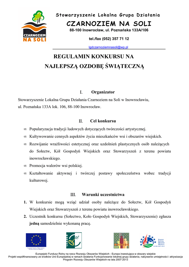 S t o w a r z y s z e n i e Lo k a l n a G r u p a D z i a ł a n i a CZARNOZIEM NA SOLI 88-100 Inowrocław, ul. Poznańska 133A/106 tel./fax (052) 357 71 12 [email protected] REGULAMIN KONKURSU NA NAJLEPSZĄ OZDOBĘ ŚWIĄTECZNĄ Ι. Organizator Stowarzyszenie Lokalna Grupa Działania Czarnoziem na Soli w Inowrocławiu, ul. Poznańska 133A lok. 106, 88-100 Inowrocław. ΙΙ. Cel konkursu • Popularyzacja tradycji ludowych dotyczących twórczości artystycznej. • Kultywowanie cennych aspektów życia mieszkańców wsi i obszarów wiejskich. • Rozwijanie wrażliwości estetycznej oraz uzdolnień plastycznych osób należących do Sołectw, Kół Gospodyń Wiejskich oraz Stowarzyszeń z terenu powiatu inowrocławskiego. • Promocja walorów wsi polskiej. • Kształtowanie aktywnej i twórczej postawy społeczeństwa wobec tradycji kulturowej. ΙΙΙ. Warunki uczestnictwa 1. W konkursie mogą wziąć udział osoby należące do Sołectw, Kół Gospodyń Wiejskich oraz Stowarzyszeń z terenu powiatu inowrocławskiego. 2. Uczestnik konkursu (Sołectwo, Koło Gospodyń Wiejskich, Stowarzyszenie) zgłasza jedną samodzielnie wykonaną pracę. Europejski Fundusz Rolny na rzecz Rozwoju Obszarów Wiejskich - Europa inwestująca w obszary wiejskie Projekt współfinansowany ze środków Unii Europejskiej w ramach działania Funkcjonowanie lokalnej grupy działania, nabywanie umiejętności i aktywizacja Program Rozwoju Obszarów Wiejskich na lata 2007-2013 S t o w a r z y s z e n i e Lo k a l n a G r u p a D z i a ł a n i a CZARNOZIEM NA SOLI 88-100 Inowrocław, ul. Poznańska 133A/106 tel./fax (052) 357 71 12 [email protected] 3. Do każdej pracy należy dołączyć kartkę z następującymi informacjami: nazwa instytucji, adres i nr tel. kontaktowego. 4. Ozdobę świąteczną należy dostarczyć do 9 grudnia 2014 r. w godzinach 8:00 – 13:00, do Biura Stowarzyszenia LGD Czarnoziem na Soli w Inowrocławiu przy ulicy Poznańskiej 133a lok.106. 5. Prace nie dostarczone w wymaganym terminie nie będą brały udziału w konkursie. 6. Technika wykonania prac jest dowolna. Wielkość pracy nie może przekraczać 0,5m x 0,5m x 05m. 7. Prace należy odebrać do dnia 15 grudnia 2014 r. w godzinach 8:00 – 14:00 w Biurze Stowarzyszenia LGD Czarnoziem na Soli w Inowrocławiu. Za nieodebrane prace w wyznaczonym terminie organizator konkursu nie ponosi odpowiedzialności. Ις. Ocena konkursowa 1. Kryteria oceny: • ogólne wrażenie artystyczne, • oryginalność wykonania, • motywy regionalne, • wkład pracy, • walory plastyczne, wykorzystanie materiałów (kompozycja, kolorystyka, dodatki), • estetyka wykonania, • zgodność pracy z tematem konkursowym, 2. Oceny prac dokona jury powołane przez organizatora. 3. Nagrodzone zostaną trzy najlepsze prace. Europejski Fundusz Rolny na rzecz Rozwoju Obszarów Wiejskich - Europa inwestująca w obszary wiejskie Projekt współfinansowany ze środków Unii Europejskiej w ramach działania Funkcjonowanie lokalnej grupy działania, nabywanie umiejętności i aktywizacja Program Rozwoju Obszarów Wiejskich na lata 2007-2013 S t o w a r z y s z e n i e Lo k a l n a G r u p a D z i a ł a n i a CZARNOZIEM NA SOLI 88-100 Inowrocław, ul. Poznańska 133A/106 tel./fax (052) 357 71 12 [email protected] 4. Prace niezgodne z regulaminem konkursu nie będą oceniane. ς. Rozstrzygnięcie konkursu 1. Rozstrzygnięcie konkursu i ogłoszenie wyników odbędzie się w Centrum Dziedzictwa Kujaw Zachodnich w Łojewie dnia 12 grudnia 2014r. o godzinie 13:00. 2. Wyniki konkursu zawierające dane nagrodzonych autorów zostaną podane do wiadomości publicznej na stronie internetowej www.czarnoziemnasoli.pl. Informacje związane z konkursem można uzyskać w Biurze Stowarzyszenia LGD Czarnoziem na Soli lub pod numerem telefonu: (052) 357 71 12. SERDECZNIE ZAPRASZAMY DO UDZIAŁU W KONKURSIE! Europejski Fundusz Rolny na rzecz Rozwoju Obszarów Wiejskich - Europa inwestująca w obszary wiejskie Projekt współfinansowany ze środków Unii Europejskiej w ramach działania Funkcjonowanie lokalnej grupy działania, nabywanie umiejętności i aktywizacja Program Rozwoju Obszarów Wiejskich na lata 2007-2013
