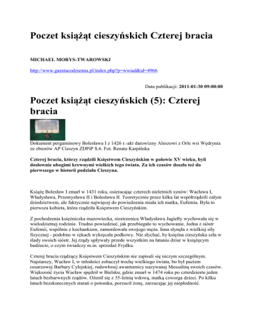 Poczet książąt cieszyńskich Czterej bracia MICHAEL MORYS-TWAROWSKI http://www.gazetacodzienna.pl/index.php?p=wwiad&id=4966 Data publikacji: 2011-01-30 09:00:00 Poczet książąt cieszyńskich (5): Czterej bracia Dokument pergaminowy Bolesława I z 1426 r.-akt darowizny Aleszowi z Orle wsi Wędrynia ze zbiorów AP Cieszyn ZDPiP S.6. Fot. Renata Karpińska Czterej bracia, którzy rządzili Księstwem Cieszyńskim w połowie XV wieku, byli dosłownie ubogimi krewnymi wielkich tego świata. Za ich czasów doszło też do pierwszego w historii podziału Cieszyna. Książę Bolesław I zmarł w 1431 roku, osieracając czterech nieletnich synów: Wacława I, Władysława, Przemysława II i Bolesława II. Teoretycznie przez kilka lat współrządzili całym dziedzictwem, ale faktycznie najwięcej do powiedzenia miała ich matka, Eufemia. Była to pierwsza kobieta, która rządziła Księstwem Cieszyńskim. Z pochodzenia księżniczka mazowiecka, siostrzenica Władysława Jagiełły wychowała się w wielodzietnej rodzinie. Trudno powiedzieć, jak przebiegało to wychowanie. Jedna z sióstr Eufemii, wspólnie z kochankiem, zamordowała swojego męża. Inna słynęła z wielkiej siły fizycznej - podobno w rękach wykręcała podkowy. Nie słychać, by księżna cieszyńska szła w ślady swoich sióstr. Jej rządy upływały przede wszystkim na łataniu dziur w książęcym budżecie, o czym świadczy m.in. sprzedaż Frydku. Czterej bracia rządzący Księstwem Cieszyńskim nie zapisali się niczym szczególnym. Najstarszy, Wacław I, w młodości zobaczył trochę wielkiego świata, bo był paziem cesarzowej Barbary Cylejskiej, rudowłosej awanturnicy nazywanej Messaliną swoich czasów. Większość życia Wacław spędził w Bielsku, gdzie zmarł w 1474 roku po czterdziestu jeden latach bezbarwnych rządów. Ożenił się z 35-letnią wdową, matką czworga dzieci. Po kilku latach bezskutecznych starań o potomka, porzucił żonę, zarzucając jej niepłodność. Drugi z braci, Władysław, spędził trochę czasu u boku swojego bliskiego kuzyna, cesarza Fryderyka III (matki naszego książątka i potężnego władcy były siostrami). Zwiedził Włochy, był też w Portugalii, gdzie został wysłany po narzeczoną kuzyna, ale trudno powiedzieć, czy pozwoliło mu to rozszerzyć horyzonty. Rezydował w Głogowie, a w zasadzie w tej połowie Głogowa, która należała do książąt cieszyńskich. Popierał czeskiego króla Jerzego z Podiebradu, co skończyło się dla naszego książątka tragicznie. W październiku 1459 roku został ciężko ranny w czasie oblężenia zbuntowanego Wrocławia i w wyniku obrażeń zmarł cztery miesiące później. Trzeci, Przemysław II, był księciem-awanturnikiem, który wmieszał się w konflikt między różnymi kandydatami do czeskiej korony. W ciągu swojego panowania zdążył poprzeć wszystkich trzech. Od jego z nich, Macieja Korwina, wziął pieniądze na werbunek wojska zaciężnego, jednak zdefraudował znaczną część pieniędzy. Wściekły Korwin chciał pozbawić Przemysława posiadłości, ale interwencja polskich wojsk pod wodzą Jakuba z Dębna uratowała Cieszyn dla naszych Piastów. Czwarty z braci, Bolesław II, był blisko związany z Krakowem i nieraz powtarzał, że chciałby widzieć Śląsk w granicach Królestwa Polskiego. Może wpływ na to miało jego małżeństwo z kuzynką króla Kazimierza Jagiellończyka, ale książę cieszyński nie był osamotniony w swoich życzeniach. Nawet potężny Wrocław słał poselstwa do Krakowa z prośbą o przyłączenie do Polski. Panujący w tym czasie Jagiellonowie nie myśleli w kategoriach interesu państwa, ale własnej rodziny. Kazimierz Jagiellończyk zamiast widzieć Śląsk w granicach Polski wolał osadzić swojego syna na czeskim tronie. Czasami można spotkać się z twierdzeniami, że Śląsk odłączył się do Polski głównie za sprawą miejscowych Piastów w XIV wieku, którzy złożyli hołd lenny królowi Czech, zapominając, że nie mieli oni innego wyjścia. Tymczasem przesądziły o tym wydarzenia o stulecie późniejsze, a przyczyną takiego, a nie innego obrotu rzeczy, był dynastyczny egoizm Jagiellonów. Przemysław II i Bolesław II rezydowali w Cieszynie. Około 1442 roku podzielili się miastem: pierwszy z nich wziął część wschodnią, drugi zachodnią, ale trudno powiedzieć, gdzie dokładnie przebiegała granica. Podział ten podobny jest trochę do tego z 1920 roku - jeden i drugi przyniósł poważny kryzys gospodarczy. Na szczęście ten średniowieczy okazał się nietrwały. Bolesław II zmarł w 1452 roku, nie mając trzydziestu lat, pozostawiając jednego syna, Kazimierza II. Właśnie Kazimierz w 1477 roku po śmierci Przemysława odziedziczył zachodnią część Cieszyna i doprowadził do zjednoczenia miasta.