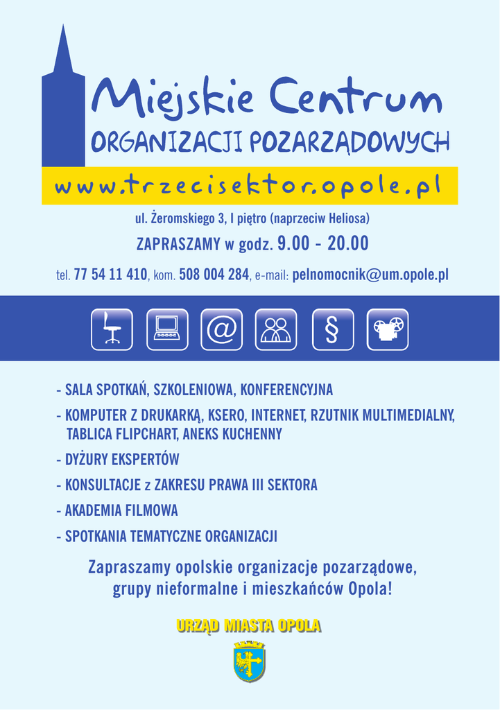 ul. Żeromskiego 3, I piętro (naprzeciw Heliosa) ZAPRASZAMY w godz. 9.00 - 20.00 tel. 77 54 11 410, kom. 508 004 284, e-mail: [email protected] - sala spotkań, szkoleniowa, konferencyjna - komputer z drukarką, ksero, internet, rzutnik multimedialny, tablica fliPchart, aneks kuchenny - dyżury ekspertów - konsultacje z zakresu prawa III sektora - Akademia Filmowa - spotkaniA tematyczne organizacji Zapraszamy opolskie organizacje pozarządowe, grupy nieformalne i mieszkańców Opola! Cele powołania Centrum: • • • • wsparcie merytoryczne, organizacyjne i logistyczne opolskich organizacji pozarządowych tworzenie stabilnej płaszczyzny współpracy między Miastem Opolem a organizacjami pozarządowymi stworzenie miejsca pełniącego rolę centrum aktywności lokalnej i inkubatora inicjatyw obywatelskich gromadzenie i udostępnianie informacji dotyczących III sektora Adresaci działań Centrum: • • • • • • • stowarzyszenia stowarzyszenia zwykłe fundacje grupy inicjatywne zmierzające do zarejestrowania organizacji grupy nieformalne tworzone do realizacji konkretnego zadania dla mieszkańców Opola uczestnicy szkoleń, konferencji i grup wsparcia mieszkańcy Opola Chcesz się przyłączyć do wspólnych działań, chcesz, aby rozszerzyć działania o inną tematykę, masz inny pomysł na działania Centrum, napisz do nas. Zarówno cele, jak i oferta Centrum może ewaluować w zależności od potrzeb, frekwencji na dyżurach i spotkaniach. Organizacje i instytucje współpracujące z CENTRUM: 1.Opolskie Centrum Wspierania Inicjatyw Pozarządowych ul. Damrota 4/ pok.35-36, 45-064 Opole tel. 77 441 50 25, faks 77 441 50 25 wew. 103 tel. kom. 883 945 710 e-mail: [email protected] nr gg: 20833371 www.ocwip.pl 2.Stowarzyszenie Uniwersytetu III Wieku ul. Damrota 6, 45-064 Opole tel. 77 453 01 03, faks 77 454 18 42 3.Stowarzyszenie QUISISANA ul. Sienkiewicza 20 of. Opole tel. 509 205 063 4.Stowarzyszenie Opolskie Lamy ul. Barlickiego 5, 45-082 Opole tel. 077 453 77 66, e-mail: [email protected] www.opolskielamy.pl 5.Opolskie Koło Stowarzyszenia Krajoznawców „Poznaj Swój Kraj” Skr.poczt.376; 45-950 OPOLE 1 tel.: 77 453 72 26 kom. 505 993 979 gg 10941581 e-mail: [email protected] www.twojkraj.wordpress.com 6.Koło Naukowe Prawa Administracyjnego Wydziału Prawa i Administracji Uniwersytetu Opolskiego opiekun: dr Mateusz Pszczyński www.prawo.uni.opole.pl/knaukowe.php 7.Fundacja Pomocy Dzieciom i Rodzinie „Horyzont” ul. Sienkiewicza 20 of. Opole tel. 660 153 313 8.Opolski Klub Krajoznawczy Polskiego Towarzystwa Turystyczno-Krajoznawczego ul. Krakowska 15/17 45-018 Opole tel. 77 454 51 13, fax. 77 441 99 65 e-mail: [email protected] gg: 852135 www.opole.pttk.pl Zapraszamy organizacje pozarządowe, grupy nieformalne i mieszkańców Opola na stałe spotkania, doradztwo już od 11 października 2010 r.: poniedziałek 9.00-15.00 można rezerwować wtorek środa 9.00-15.00 można rezerwować 9.00-15.00 można rezerwować 15.00-16.00 Doradztwo III sektora – OCWIP 16.00-17.00 Komisja do opiniowania wniosków organizacji pozarządowych o wynajem lokali Miasta Opola – trzeci poniedziałek miesiąca 16.00-18.00 Akademia Filmowa dla MłodzieżyStowarzyszenie Opolskie Lamy 15.00-17.00 Zespół Konsultacyjny ds. organizacji pozarządowych - drugi poniedziałek miesiąca 16.00-18.00 Wszechnica Krajoznawcza – OKK PTTK – pierwszy poniedziałek miesiąca 18.00-20.00 Psychoterapia grupowa Dorosłych Dzieci Alkoholików – Stowarzyszenie QUISISANA 18.00-20.00 język niemiecki dla Seniorów – Uniwersytet III Wieku czwartek piątek 9.00-20.00 można rezerwować 9.00-20.00 można rezerwować 14.30-15.30 Likwidacja organizacji pozarządowych, zakładanie organizacji, rejestracja KRS – Jan Całka – Urząd Miasta Opola 15.45-18.00 „Spotkania z Twórcą” „Akademia Wiedzy o Śląsku” Opolskie Koło Stowarzyszenia „Poznaj Swój Kraj” 18.00-19.00 Doradztwo prawne dla wszystkich – Koło Prawa Administracyjnego UO 19.00-20.00 Doradztwo socjalne dla wszystkich – Fundacja Pomocy Dzieciom i Rodzinie „Horyzont” Zapraszamy inne organizacje do stałej współpracy ! Szkolenia i konferencje: 29 wrzesień – godz. 14.00 Uroczyste otwarcie Centrum przez Prezydenta Miasta Opola - Ryszarda Zembaczyńskiego oraz wykład: „Społeczeństwo obywatelskie” – dr Aldona Wiktorska-Święcka – Pełnomocnik Prezydenta Miasta Wrocławia ds. organizacji pozarządowych – przedstawiciel Unii Metropolii Polskich w Radzie Pożytku Publicznego przy MPiPS Październik Finansowanie III sektora – OCDL Listopad Promocja opolskiego III sektora – media, Internet, PR – zostanie ogłoszony konkurs Grudzień KRS, Likwidacja stowarzyszeń - Irena Majcher – Przewodnicząca 8 Wydziału Krajowego Rejestru Sądowego Terminy i tematy szczegółowe zostaną podane na portalu opolskiego trzeciego sektora i na tablicy w Centrum Nowy cykl comiesięcznych spotkań Pełnomocnika ds. organizacji pozarządowych Przemysława Parkitnego „Nasze opolskie sprawy” Będą to spotkania branżowe z prezesami opolskich organizacji i ekspertami mające na celu: • wypracowanie nowych zasad wyboru Zespołu Konsultacyjnego ds. organizacji pozarządowych i wyboru członków komisji oceniających • wdrażanie dobrych pomysłów rozwijających trzeci sektor w Opolu • planowanie wspólnych wydarzeń trzeciego sektora i itd… Spotkania w październiku: 6 października, godz. 16.00 7 października, godz. 16.00 sport, rekreacja i turystyka, hobby, kultura, oświata, promocja polityka społeczna, zdrowie, pozostałe obszary Zapraszamy prezesów opolskich organizacji! Partnerzy Miejskiego Centrum Organizacji Pozarządowych www.trzecisektor.opole.pl: I. Centrum Dialogu - komórka organizacyjna Opolskiego Urzędu Wojewódzkiego w Biurze Wojewody Rafał Nowowiejski Pełnomocnik Wojewody ds. Dialogu Społecznego Kontakt: e-mail: [email protected], tel. 77 452 42 02, kom. 603 942 217 Centrum Dialogu jako region