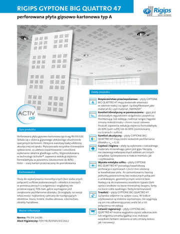 RIGIPS GYPTONE BIG QUATTRO 47 perforowana płyta gipsowo-kartonowa typ A Zalety produktu Opis produktu Perforowana płyta gipsowo-kartonowa typ A wg PN-EN 520. Składa się z rdzenia gipsowego obłożonego obustronnie specjalnym kartonem. Oklejona warstwą białej włókniny akustycznej od spodu. Płyta posiada wszystkie 4 krawędzie spłaszczone, co ułatwia szpachlowanie i umożliwia wykonanie idealnie gładkiego sufitu. Wyprodukowana w technologii Activ’Air®, zapewnia redukcję stężenia formaldehydu w powietrzu (skuteczność do 80%). Kolor – szary karton przeznaczony do pomalowania. Zastosowanie Służy do wykonywania monolitycznych (bez widocznych połączeń) sufitów podwieszanych i okładzin ściennych w pomieszczeniach o wilgotności względnej nie przekraczającej 70% tam, gdzie wymagane jest zwiększone pochłanianie dźwięku. Ze względu na swoje właściwości najbardziej zalecany do następujących obiektów: biura, hotele, służba zdrowia, szkolnictwo, obiekty handlowe. Ważne informacje Norma: PN-EN 14190 Atest Higieniczny: PZH HK/B/0565/03/2012 Bezpieczeństwo przeciwpożarowe – płyty GYPTONE BIG QUATTRO 47 mają doskonałe własności w zakresie reakcji na ogień. Są klasyfikowane jako materiał A2, czyli materiał „NIEPALNY” Komfort klimatyczny w pomieszczeniu – gips jest doskonałym regulatorem wilgotności powietrza. Pochłaniając lub oddając nadmiar wilgoci łagodzi zmiany mikroklimatu i chroni nasze zdrowie. Produkt zapewnia redukcję stężenia formaldehydu do 60% (sam sufit) lub do 80% (zastosowany na ścianach i suficie). Komfort akustyczny – płyty GYPTONE BIG QUATTRO 47 mają średni wskaźnik pochłaniania dźwięku αw = 0,35 Czystość i higiena – płyty są wykonane z naturalnego materiału mineralnego, jakim jest gips. Nie pylą, nie zawierają niebezpiecznych włókien ani innych związków. Są bezpieczne w trakcie montażu jak i użytkowania Wysoka estetyka sufitu – płyty GYPTONE BIG QUATTRO 47 posiadają kwadratową perforację o wymiarach 12x12 mm ułożoną w kwadratowe pola. Po zamontowaniu tworzą jednolitą powierzchnię bez widocznych połączeń o unikatowym, geometrycznym wzornictwie. Nadają się do malowania wszelkimi typami farb oprócz środków na bazie mineralnej (wapno, farby na bazie szkła wodnego i farby krzemianowe) Trwałość – płyty GYPTONE BIG QUATTRO 47 są bardzo odporne na upływ czasu. W trakcie użytkowania są stabilne wymiarowo, nie wyginają się ani nie odbarwiają przez wiele lat a ich połączenia nie pękają Łatwość regeneracji – płyty GYPTONE BIG QUATTRO 47 można wygodnie czyścić odkurzaczem lub wilgotną szmatką (gąbką) oraz malować wszelkimi farbami zarówno w celu zmiany koloru jak i renowacji RIGIPS GYPTONE BIG QUATTRO 47 perforowana płyta gipsowo-kartonowa typ A Właściwości produktu Wzór Krawędź Wymiary (mm) Ciężar (kg/m2) Gęstość (kg/m3) Klasa reakcji na ogień Pochłanianie dźwięku αw Odporność na wilgoć RH % perforacji QUATTRO 47 B1-4T 2400x1200x12,5 8,0 600–800 A2 0,35 70% 6,0% Inne wymiary płyt GYPTONE BIG dostępne na zamówienie. Wartość wskaźnika pochłaniania dźwięku αw dla sufitu 200 mm od stropu bez wełny mineralnej. Sposób ukształtowania krawędzi Pochłanianie dźwięku B1-4T 1,0 Rozmieszczenie i wielkość perforacji 106,5 87 63 stopień absorpcji αp 25 12x12 213 Wskaźnik αw Klasa pochłaniania Raport badania BTC 3067A 0,8 0,6 0,4 0,2 0 125 250 500 1k 2k 4k Hz 50 mm 200 mm 400 mm 200 mm + WM Współczynniki pochłaniania dźwięku αp Wzór QUATTRO 47 Częstotliwość Wysokość podwieszenia Wełna mineralna 125 Hz 250 Hz 500 Hz 1000 Hz 2000 Hz 4000 Hz 50 45 mm 0,50 0,55 0,50 0,40 0,30 0,30 0,40 D – 0,45 0,50 0,45 0,35 0,30 0,30 0,35 D BTC 3057A 50 mm 0,45 0,35 0,35 0,35 0,35 0,35 0,35 D P.V. 5158 - 1/3 – 0,35 0,35 0,35 0,35 0,35 0,35 0,35 D P.V. 5158 - 1/3 100 mm 0,35 0,30 0,35 0,35 0,40 0,35 0,40 D P.V. 5158 - 1/3 200 400 MONTAŻ. Przed przystąpieniem do montażu płyt sufitowych należy zmontować konstrukcję nośną z profili CD 60 ULTRASTIL® lub CD60 w taki sposób, aby płyty GYPTONE BIG układane w poprzek można było przykręcać do profili nośnych. Na stykach poprzecznych płyt musi być zawsze umieszczony profil nośny. Odległość pomiędzy osiami profili nośnych powinna wynosić maksymalnie 600 mm (400 mm w przypadku narażenia na wilgoć). Rozmieszczenie płyt należy zaplanować tak, by wzdłużne krawędzie płyt biegły równolegle do kierunku padania promieni słonecznych. Płyty GYPTONE BIG muszą być montowane zawsze w tym samym kierunku – w tym celu znakuje się jedną krawędź płyt ułożonych na palecie kredą. Montaż płyt GYPTONE BIG rozpoczyna się od środka pomieszczenia. Za pomocą znaczarki traserskiej wyznacza się pozycję pierwszej płyty i nanosi ją. Przed montażem pierwszej płyty powinno się zamontować nieprzesuwalny element oporowy wzdłuż krawędzi czołowej oraz wzdłużnej (po zamontowaniu płyty element ten należy zdjąć. Pierwszą płytę przysuwa się do elementu oporowego, odpowiednio ustawia i mocuje blachowkrętami TN 3,5x25 mm, rozmieszczonymi maksymalnie co 150 mm. Najpierw przykręca się stronę czołową, a następnie krawędź Saint-Gobain Construction Products Polska Sp. z o.o. Biuro Rigips w Warszawie ul. Cybernetyki 9 02-677 Warszawa Tel. +48 22 457 14 57 lub 8 Fax +48 22 457 14 55 Dział techniczny 801 328 788 www.rigips.pl wzdłużną. Gdy przewidziana jest dodatkowa warstwa izolacji akustycznej, nakłada się ją na montowaną płytę i przymocowuje razem z nią. Następną płytę dosuwa się do już zamontowanej płyty. Przed zamocowaniem należy wyrównać przebieg rzędów otworów w kierunku wzdłużnym i diagonalnym. Przykręcanie należy rozpocząć od naroża, w którym płyta GYPTONE BIG styka się z krawędzią wzdłużną i czołową już zamontowanej płyty. Najpierw przykręca się krawędź czołową, następnie wzdłużną. Sp