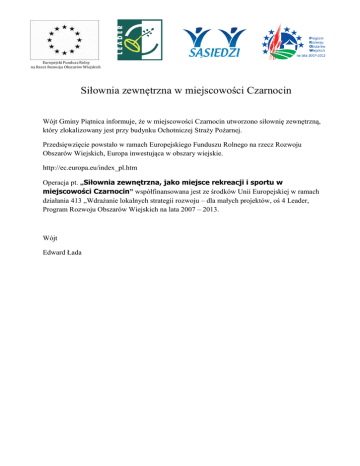 Europejski Fundusz Rolny na Rzecz Rozwoju Obszarów Wiejskich Siłownia zewnętrzna w miejscowości Czarnocin Wójt Gminy Piątnica informuje, że w miejscowości Czarnocin utworzono siłownię zewnętrzną, który zlokalizowany jest przy budynku Ochotniczej Straży Pożarnej. Przedsięwzięcie powstało w ramach Europejskiego Funduszu Rolnego na rzecz Rozwoju Obszarów Wiejskich, Europa inwestująca w obszary wiejskie. http://ec.europa.eu/index_pl.htm Operacja pt. „Siłownia zewnętrzna, jako miejsce rekreacji i sportu w miejscowości Czarnocin” współfinansowana jest ze środków Unii Europejskiej w ramach działania 413 „Wdrażanie lokalnych strategii rozwoju – dla małych projektów, oś 4 Leader, Program Rozwoju Obszarów Wiejskich na lata 2007 – 2013. Wójt Edward Łada
