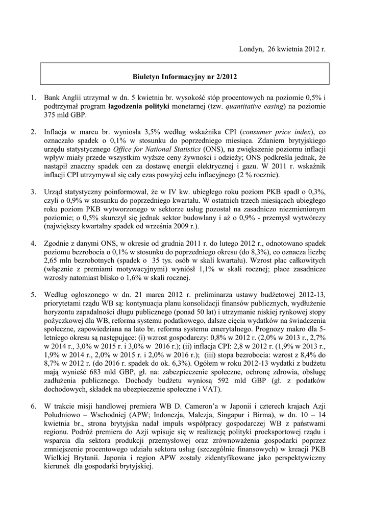 Londyn, 26 kwietnia 2012 r. Biuletyn Informacyjny nr 2/2012 1. Bank Anglii utrzymał w dn. 5 kwietnia br. wysokość stóp procentowych na poziomie 0,5% i podtrzymał program łagodzenia polityki monetarnej (tzw. quantitative easing) na poziomie 375 mld GBP. 2. Inflacja w marcu br. wyniosła 3,5% według wskaźnika CPI (consumer price index), co oznaczało spadek o 0,1% w stosunku do poprzedniego miesiąca. Zdaniem brytyjskiego urzędu statystycznego Office for National Statistics (ONS), na zwiększenie poziomu inflacji wpływ miały przede wszystkim wyższe ceny żywności i odzieży; ONS podkreśla jednak, że nastąpił znaczny spadek cen za dostawę energii elektrycznej i gazu. W 2011 r. wskaźnik inflacji CPI utrzymywał się cały czas powyżej celu inflacyjnego (2 % rocznie). 3. Urząd statystyczny poinformował, że w IV kw. ubiegłego roku poziom PKB spadł o 0,3%, czyli o 0,9% w stosunku do poprzedniego kwartału. W ostatnich trzech miesiącach ubiegłego roku poziom PKB wytworzonego w sektorze usług pozostał na zasadniczo niezmienionym poziomie; o 0,5% skurczył się jednak sektor budowlany i aż o 0,9% - przemysł wytwórczy (największy kwartalny spadek od września 2009 r.). 4. Zgodnie z danymi ONS, w okresie od grudnia 2011 r. do lutego 2012 r., odnotowano spadek poziomu bezrobocia o 0,1% w stosunku do poprzedniego okresu (do 8,3%), co oznacza liczbę 2,65 mln bezrobotnych (spadek o 35 tys. osób w skali kwartału). Wzrost płac całkowitych (włącznie z premiami motywacyjnymi) wyniósł 1,1% w skali rocznej; płace zasadnicze wzrosły natomiast blisko o 1,6% w skali rocznej. 5. Według ogłoszonego w dn. 21 marca 2012 r. preliminarza ustawy budżetowej 2012-13, priorytetami rządu WB są: kontynuacja planu konsolidacji finansów publicznych, wydłużenie horyzontu zapadalności długu publicznego (ponad 50 lat) i utrzymanie niskiej rynkowej stopy pożyczkowej dla WB, reforma systemu podatkowego, dalsze cięcia wydatków na świadczenia społeczne, zapowiedziana na lato br. reforma systemu emerytalnego. Prognozy makro dla 5letniego okresu są następujące: (i) wzrost gospodarczy: 0,8% w 2012 r. (2,0% w 2013 r., 2,7% w 2014 r., 3,0% w 2015 r. i 3,0% w 2016 r.); (ii) inflacja CPI: 2,8 w 2012 r. (1,9% w 2013 r., 1,9% w 2014 r., 2,0% w 2015 r. i 2,0% w 2016 r.); (iii) stopa bezrobocia: wzrost z 8,4% do 8,7% w 2012 r. (do 2016 r. spadek do ok. 6,3%). Ogółem w roku 2012-13 wydatki z budżetu mają wynieść 683 mld GBP, gł. na: zabezpieczenie społeczne, ochronę zdrowia, obsługę zadłużenia publicznego. Dochody budżetu wyniosą 592 mld GBP (gł. z podatków dochodowych, składek na ubezpieczenie społeczne i VAT). 6. W trakcie misji handlowej premiera WB D. Cameron’a w Japonii i czterech krajach Azji Południowo – Wschodniej (APW; Indonezja, Malezja, Singapur i Birma), w dn. 10 – 14 kwietnia br., strona brytyjska nadał impuls współpracy gospodarczej WB z państwami regionu. Podróż premiera do Azji wpisuje się w realizację polityki proeksportowej rządu i wsparcia dla sektora produkcji przemysłowej oraz zrównoważenia gospodarki poprzez zmniejszenie procentowego udziału sektora usług (szczególnie finansowych) w kreacji PKB Wielkiej Brytanii. Japonia i region APW zostały zidentyfikowane jako perspektywiczny kierunek dla gospodarki brytyjskiej. 7. Niemieckie koncerny Eon i RWE ogłosiły rezygnację z budowy nowych reaktorów atomowych w WB w ramach konsorcjum Horizon. Konsorcjum, które w zamierzeniach miało do 2025 r. zainwestować ok. 15 mld GBP w elektrownie atomowe w Wylfie i Oldbury zostanie obecnie wystawione na sprzedaż. Jako powód wycofania się z dotychczasowych planów obie firmy podały czynniki zewnętrzne, takie jak globalny kryzys energetyczny oraz implikacje decyzji rządu niemieckiego o rezygnacji z energetyki atomowej. Brytyjskie Ministerstwo ds. Energii i Zmian Klimatu zapewnia o ciągłym zaangażowaniu rządu brytyjskiego w rozwój energetyki atomowej, podkreślając, że dwa pozostałe konsorcja zaangażowane w budowę nowych reaktorów atomowych (EDF/Centrica i NuGen) pracują zgodnie z założeniami, a Horizon z pewnością w niedługim czasie znajdzie nabywcę. 8. Agencja ratingowa Fitch obniżyła perspektywę ratingu Wielkiej Brytanii ze stabilnej do negatywnej (AAA), decyzję motywując „bardzo ograniczoną przestrzenią fiskalną, w związku ze zmaganiem się z kolejnymi szokami gospodarczymi”. Dodatkowo Fitch wskazał, że zadłużenie WB znajduje się znacznie powyżej średniego poziomu zadłużenia dla państw o ratingu AAA, co w przyszłości może zaowocować nawet dalszym obniżaniem oceny ryzyka kredytowego. 9. Według nieoficjalnych danych, całkowity koszt Igrzysk Olimpijskich w Londynie przekroczy 9,3 mld GBP, z czego ponad pół miliarda pochłonęła już budowa Stadionu Olimpijskiego. W Londynie pojawi się ok. 10,5 tys. sportowców z 204 państw, którzy walczyć będą o 302 komplety medali w 39 dyscyplinach. W porównaniu z Pekinem 2008 z programu wycofano baseball i tzw. softball. Wyboru gospodarza Igrzysk XXX Olimpiady dokonano 6 lipca 2005 r. podczas 117. Sesji Międzynarodowego Komitetu Olimpijskiego w Singapurze. Londyn pokonał w finałowej rozgrywce m.in. Paryż; wcześniej odpadły Moskwa, Nowy Jork oraz Madryt. 10. Pracownicy londyńskiego metra, odpowiedzialni za obsługę konserwacyjną, przystąpili w dn. 24 kwietnia br. do 72-godzinnego strajku, domagając się przywilejów podobnych do tych, jakie przysługują np. motorniczym lub pracownikom bezpośredniej obsługi pasażerów. Dodatkowo twierdzą oni, że powinni zostać objęci takim samym systemem emerytalnym i mieć prawo do ulg i bonifikat w otrzymywaniu preferencyjnych biletów na podróże metrem także dla członków swoich rodzin. 11. Ze względu na wzrost cen znaczków pocztowych od 30 kwietnia br., w wielu oddziałach poczty królewskiej Royal Mail wprowadzono ograniczenia na ich zakup (popyt wzrósł nawet pięciokrotnie; 