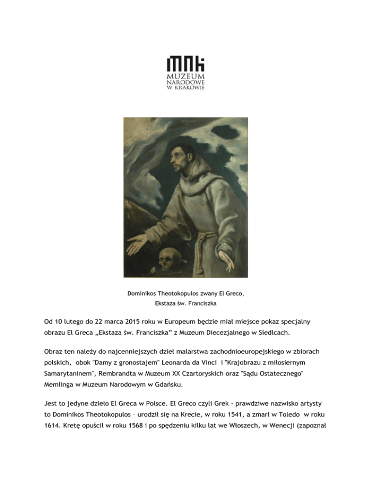 Dominikos Theotokopulos zwany El Greco, Ekstaza św. Franciszka Od 10 lutego do 22 marca 2015 roku w Europeum będzie miał miejsce pokaz specjalny obrazu El Greca „Ekstaza św. Franciszka” z Muzeum Diecezjalnego w Siedlcach. Obraz ten należy do najcenniejszych dzieł malarstwa zachodnioeuropejskiego w zbiorach polskich, obok "Damy z gronostajem" Leonarda da Vinci i "Krajobrazu z miłosiernym Samarytaninem", Rembrandta w Muzeum XX Czartoryskich oraz "Sądu Ostatecznego" Memlinga w Muzeum Narodowym w Gdańsku. Jest to jedyne dzieło El Greca w Polsce. El Greco czyli Grek - prawdziwe nazwisko artysty to Dominikos Theotokopulos – urodził się na Krecie, w roku 1541, a zmarł w Toledo w roku 1614. Kretę opuścił w roku 1568 i po spędzeniu kilku lat we Włoszech, w Wenecji (zapoznał się tutaj z malarstwem Tycjana i Tintoretta) i w Rzymie, w roku 1577 osiadł na stałe w hiszpańskim mieście Toledo. W minionym 2014 roku cały świat obchodził uroczyście 400. rocznicę śmierci El Greca, W Toledo, Madrycie i Nowym Jorku urządzono ważne wystawy jego dzieł. Polski obraz El Greca został odkryty w roku 1964, na plebanii w Kosowie Lackim, przez panie Izabellę Galicką i Hannę Sygietyńską, przeprowadzające inwentaryzacje zabytków. Odkrycie to wywołało wielką sensację, ściągnęło do Kosowa wybitnych historyków sztuki, którzy jednak odnieśli się do obrazu z wielkim sceptycyzmem. Poddanie obrazu badaniom konserwatorskim, pod okiem profesora Marconiego, w roku 1974, doprowadziło do odsłonięcia sygnatury: Domenikos Theotokopulos, co ostatecznie rozstrzygnęło kwestię oryginalności dzieła. Obraz trafił do Muzeum Diecezjalnego w Siedlcach ale długo nie był wystawiany, z obawy, że władze PRL-u mogłyby nakazać przekazanie go do państwowego muzeum. Dopiero od roku 2004 obraz jest wystawiany publicznie w Muzeum Diecezjalnym w Siedlcach. Tematem obrazu jest ekstatyczno-mistyczne przeżycie św. Franciszka z Asyżu, otrzymującego od Chrystusa stygmaty – znaki Jego ran od gwoździ przy ukrzyżowaniu. Utrzymany w chłodnej kolorystyce obraz, nasycony intensywnymi blaskami światła , tak ziemskiego, jak niebiańskiego, namalowany pewnymi, bardzo dynamicznymi pociągnięciami pędzla, jest bardzo charakterystyczny dla oryginalnej maniery malarskie El Greca. W roku ubiegłym obraz był wystawiany przez pewien czas w Zamku Królewskim w Warszawie. Obecny pokaz, w EUROPEUM, jest drugim pokazem poza Siedlcami i zapewne ostatnim poza tym miejscem, co stwarza wyjątkową okazję do zapoznania się z tym , owianym sensacją arcydziełem. Janusz Wałek