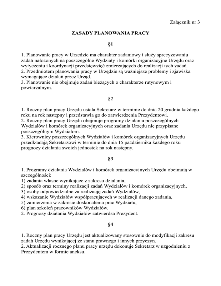 Załącznik nr 3 ZASADY PLANOWANIA PRACY §1 1. Planowanie pracy w Urzędzie ma charakter zadaniowy i służy sprecyzowaniu zadań nałożonych na poszczególne Wydziały i komórki organizacyjne Urzędu oraz wytyczeniu i koordynacji przedsięwzięć zmierzających do realizacji tych zadań. 2. Przedmiotem planowania pracy w Urzędzie są ważniejsze problemy i zjawiska wymagające działań przez Urząd. 3. Planowanie nie obejmuje zadań bieżących o charakterze rutynowym i powtarzalnym. §2 1. Roczny plan pracy Urzędu ustala Sekretarz w terminie do dnia 20 grudnia każdego roku na rok następny i przedstawia go do zatwierdzenia Prezydentowi. 2. Roczny plan pracy Urzędu obejmuje programy działania poszczególnych Wydziałów i komórek organizacyjnych oraz zadania Urzędu nie przypisane poszczególnym Wydziałom. 3. Kierownicy poszczególnych Wydziałów i komórek organizacyjnych Urzędu przedkładają Sekretarzowi w terminie do dnia 15 października każdego roku prognozy działania swoich jednostek na rok następny. §3 1. Programy działania Wydziałów i komórek organizacyjnych Urzędu obejmują w szczególności: 1) zadania własne wynikające z zakresu działania, 2) sposób oraz terminy realizacji zadań Wydziałów i komórek organizacyjnych, 3) osoby odpowiedzialne za realizację zadań Wydziałów, 4) wskazanie Wydziałów współpracujących w realizacji danego zadania, 5) zamierzenia w zakresie doskonalenia prac Wydziału, 6) plan szkoleń pracowników Wydziałów. 2. Prognozy działania Wydziałów zatwierdza Prezydent. §4 1. Roczny plan pracy Urzędu jest aktualizowany stosownie do modyfikacji zakresu zadań Urzędu wynikającej ze stanu prawnego i innych przyczyn. 2. Aktualizacji rocznego planu pracy urzędu dokonuje Sekretarz w uzgodnieniu z Prezydentem w formie aneksu. §5 1. Aktualizacji programów działania Wydziałów dokonują ich kierownicy w formie aneksu. 2. § 3, ust. 2 i § 4, ust. l stosuje się odpowiednio. §6 1. Za terminową i pełną realizację zadań wynikających z rocznego planu pracy Urzędu odpowiada Prezydent. 2. Na podstawie materiałów własnych i informacji uzyskanych od osób kierujących Wydziałami, Sekretarz przedkłada Prezydentowi pisemne sprawozdanie z realizacji rocznego planu pracy Urzędu w terminie do 15 lutego następnego roku. §7 Za terminową i pełną realizację zadań wynikających z programów działania Wydziałów odpowiadają osoby kierujące nimi. §8 1. Sekretarz kontroluje na bieżąco realizację rocznego planu pracy Urzędu. 2. Osoby kierujące Wydziałami kontrolują na bieżąco realizację programów działania Wydziałów i rozliczają podległych pracowników z wykonania zadań ujętych w tych programach. PRZEWODNICZĄCY RADY MIEJSKIEJ STAROGARDU GDAŃSKIEGO STEFAN MILEWSKI