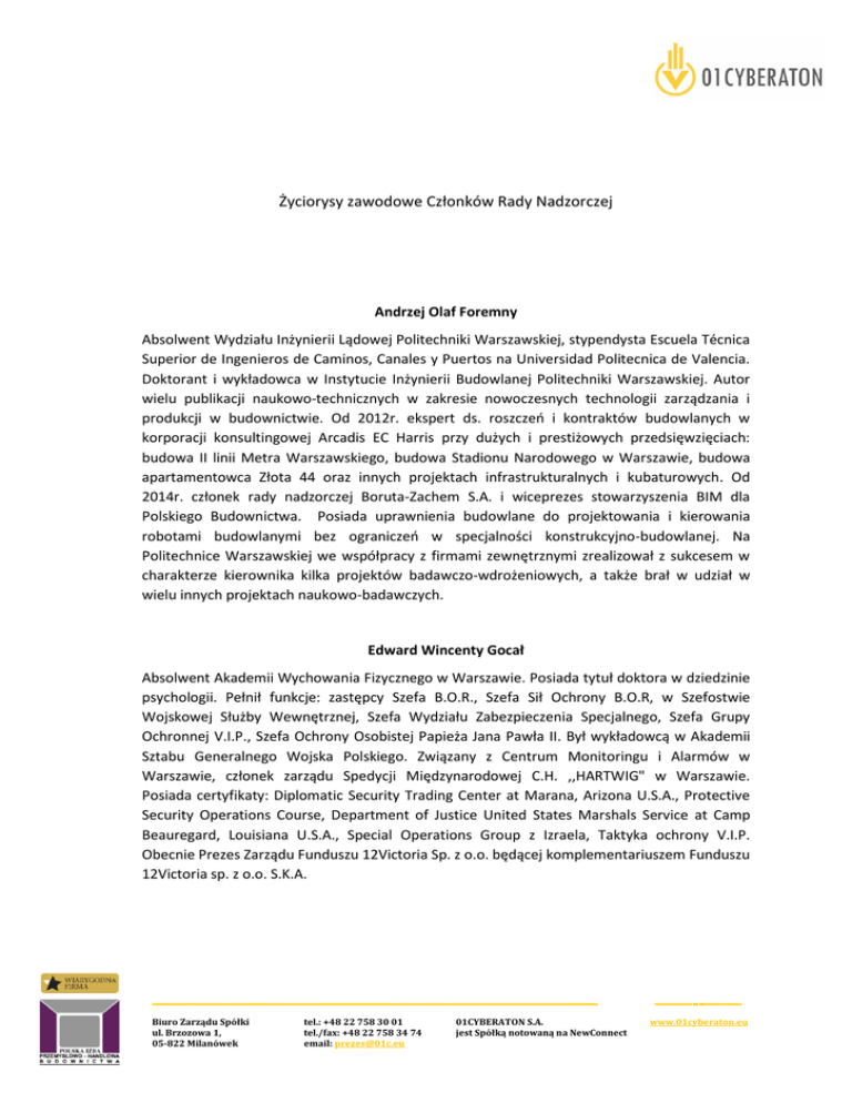 Życiorysy zawodowe Członków Rady Nadzorczej Andrzej Olaf Foremny Absolwent Wydziału Inżynierii Lądowej Politechniki Warszawskiej, stypendysta Escuela Técnica Superior de Ingenieros de Caminos, Canales y Puertos na Universidad Politecnica de Valencia. Doktorant i wykładowca w Instytucie Inżynierii Budowlanej Politechniki Warszawskiej. Autor wielu publikacji naukowo-technicznych w zakresie nowoczesnych technologii zarządzania i produkcji w budownictwie. Od 2012r. ekspert ds. roszczeń i kontraktów budowlanych w korporacji konsultingowej Arcadis EC Harris przy dużych i prestiżowych przedsięwzięciach: budowa II linii Metra Warszawskiego, budowa Stadionu Narodowego w Warszawie, budowa apartamentowca Złota 44 oraz innych projektach infrastrukturalnych i kubaturowych. Od 2014r. członek rady nadzorczej Boruta-Zachem S.A. i wiceprezes stowarzyszenia BIM dla Polskiego Budownictwa. Posiada uprawnienia budowlane do projektowania i kierowania robotami budowlanymi bez ograniczeń w specjalności konstrukcyjno-budowlanej. Na Politechnice Warszawskiej we współpracy z firmami zewnętrznymi zrealizował z sukcesem w charakterze kierownika kilka projektów badawczo-wdrożeniowych, a także brał w udział w wielu innych projektach naukowo-badawczych. Edward Wincenty Gocał Absolwent Akademii Wychowania Fizycznego w Warszawie. Posiada tytuł doktora w dziedzinie psychologii. Pełnił funkcje: zastępcy Szefa B.O.R., Szefa Sił Ochrony B.O.R, w Szefostwie Wojskowej Służby Wewnętrznej, Szefa Wydziału Zabezpieczenia Specjalnego, Szefa Grupy Ochronnej V.I.P., Szefa Ochrony Osobistej Papieża Jana Pawła II. Był wykładowcą w Akademii Sztabu Generalnego Wojska Polskiego. Związany z Centrum Monitoringu i Alarmów w Warszawie, członek zarządu Spedycji Międzynarodowej C.H. ,,HARTWIG" w Warszawie. Posiada certyfikaty: Diplomatic Security Trading Center at Marana, Arizona U.S.A., Protective Security Operations Course, Department of Justice United States Marshals Service at Camp Beauregard, Louisiana U.S.A., Special Operations Group z Izraela, Taktyka ochrony V.I.P. Obecnie Prezes Zarządu Funduszu 12Victoria Sp. z o.o. będącej komplementariuszem Funduszu 12Victoria sp. z o.o. S.K.A. ———————————————————————— Biuro Zarządu Spółki ul. Brzozowa 1, 05-822 Milanówek tel.: +48 22 758 30 01 tel./fax: +48 22 758 34 74 email: [email protected] 01CYBERATON S.A. jest Spółką notowaną na NewConnect ——--—— www.01cyberaton.eu Marzenna Aleksandrowicz Specjalista z dziedziny informatycznego przetwarzania danych. Posiada dyplom “Accounting and Business” międzynarodowego stowarzyszenia ACCA (Association of Chartered Certified Accountants). W ciągu swojej kariery zawodowej pełniła kierownicze funkcje w dużych przedsiębiorstwach (np. Makro Cash and Carry, Jedwab Polski) w zakresie doradztwa finansowego i księgowości. Marek Jacek Dmochowski Prowadzi własną działalność gospodarczą w zakresie nieruchomości i handlu artykułami przemysłowymi z dużymi sieciami handlowymi - Auchan, Polo Market. Rodzinnie i kapitałowo powiązany z firmą Jedwab Polski Sp. z.o.o. Jacek Franasik Absolwent Wydziału Lekarskiego Akademii Medycznej w Łodzi. Od wielu lat pełni kierownicze funkcje w dużych przedsiębiorstwach farmaceutycznych. W latach 1999-2003 był dyrektorem handlowym w firmie Agropharm. Od 2013r. członek rady nadzorczej firmy Pharmena. Od 2002r. do chwili obecnej pełni funkcję Prezesa Zarządu w firmie Master Pharm Polska. Pełnomocnik firmy Max Welt Holding Ltd. Agnieszka Irena Gocał Absolwentka Wyższej Szkoły Administracji Społecznej w Warszawie. Obecnie pracuje w Centrum Onkologii w Warszawie i zajmuje się audytem w szpitalach onkologicznych na terenie Polski. Stanisław Franciszek Klimczak Absolwent Wydziału Mechanicznego Politechniki Łódzkiej. Ukończony egzaminem państwowym kurs dla członków rad nadzorczych spółek Skarbu Państwa. Wieloletnie kierownictwo nad Zrzeszeniem Przemysłu Obronnego. Sekretarz Rady Nadzorczej Spółki Akcyjnej „Budowlani” (nadal). Sekretarz rady nadzorczej Zakładu Drogownictwa i Inżynierii Sp. z o.o. w Łodzi (Zakład ogłosił upadłość w 2012r.) Beatę Telenga-Pośpiech Projektant Wnętrz. Wieloletnia praktyka w zakresie zarządzania przedsiębiorstwami. Specjalizacja - handel zagraniczny. Od 2008 roku prowadzi własną działalność gospodarczą produkcja i handel ekskluzywnym wyposażeniem wnętrz . Właściciel i prezes firmy ROYAL HOME TELENGA STUDIO zajmującej się produkcją i sprzedażą mebli. Właścicielka Galerii Sztuki współczesnej. Członek Polskiego Klubu Biznesu. Udziałowiec w HCM Sp. z o.o. w Kłobucku. ———————————————————————— Biuro Zarządu Spółki ul. Brzozowa 1, 05-822 Milanówek tel.: +48 22 758 30 01 tel./fax: +48 22 758 34 74 email: [email protected] 01CYBERATON S.A. jest Spółką notowaną na NewConnect ——--—— www.01cyberaton.eu Renata Irena Śliwińska Absolwentka Wydziału Zarządzania Szkoły Głównej Handlowej w Warszawie. W przeszłości była radcą w Biurze Ochrony Rządu, a także w firmach AAT i Centrum Monitoringu i Alarmów. Zajmowała się doradztwem finansowym w szwajcarskiej grupie Swiss Life. Aktualnie jest pośrednikiem na rynku nieruchomości i doradcą inwestycyjnym, rozpoczęła pracę w firmie Prudential na stanowisku radcy. ———————————————————————— Biuro Zarządu Spółki ul. Brzozowa 1, 05-822 Milanówek tel.: +48 22 758 30 01 tel./fax: +48 22 758 34 74 email: [email protected] 01CYBERATON S.A. jest Spółką notowaną na NewConnect ——--—— www.01cyberaton.eu