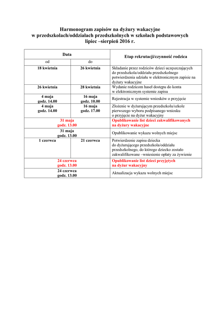 Harmonogram zapisów na dyżury wakacyjne w przedszkolach/oddziałach przedszkolnych w szkołach podstawowych lipiec –sierpień 2016 r. Data Etap rekrutacji/czynność rodzica od do 18 kwietnia 26 kwietnia 26 kwietnia 28 kwietnia 4 maja godz. 14.00 4 maja godz. 14.00 16 maja godz. 10.00 16 maja godz. 17.00 31 maja godz. 13.00 31 maja godz. 13.00 1 czerwca Rejestracja w systemie wniosków o przyjęcie Złożenie w dyżurującym przedszkolu/szkole pierwszego wyboru podpisanego wniosku o przyjęcie na dyżur wakacyjny Opublikowanie list dzieci zakwalifikowanych na dyżury wakacyjne Opublikowanie wykazu wolnych miejsc 21 czerwca 24 czerwca godz. 13.00 24 czerwca godz. 13.00 Składanie przez rodziców dzieci uczęszczających do przedszkola/oddziału przedszkolnego potwierdzenia udziału w elektronicznym zapisie na dyżury wakacyjne Wydanie rodzicom haseł dostępu do konta w elektronicznym systemie zapisu Potwierdzenie zapisu dziecka do dyżurującego przedszkola/oddziału przedszkolnego, do którego dziecko zostało zakwalifikowane –wniesienie opłaty za żywienie Opublikowanie list dzieci przyjętych na dyżur wakacyjny Aktualizacja wykazu wolnych miejsc