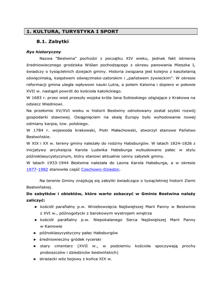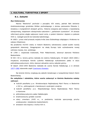 1. KULTURA, TURYSTYKA I SPORT 8.1. Zabytki Rys historyczny Nazwa "Bestwina" pochodzi z początku XIV wieku, jednak fakt istnienia średniowiecznego grodziska Wiślan pochodzącego z okresu panowania Mieszka I, świadczy o tysiącletnich dziejach gminy. Historia związana jest kolejno z kasztelanią oświęcimską, księstwem oświęcimsko-zatorskim i „państwem żywieckim”. W okresie reformacji gmina uległa wpływowi nauki Lutra, a potem Kalwina i dopiero w połowie XVII w. nastąpił powrót do kościoła katolickiego. W 1683 r. przez wieś przeszły wojska króla Jana Sobieskiego zdążające z Krakowa na odsiecz Wiedniowi. Na przełomie XV/XVI wieku w historii Bestwiny odnotowany został szybki rozwój gospodarki stawowej. Osiągnięciem na skalę Europy było wyhodowanie nowej odmiany karpia, tzw. polskiego. W 1784 r. wojewoda krakowski, Piotr Małachowski, stworzył stanowe Państwo Bestwińskie. W XIX i XX w. tereny gminy należały do rodziny Habsburgów. W latach 1824-1826 z inicjatywy arcyksięcia Karola Ludwika Habsburga wybudowano pałac w stylu późnoklasycystycznym, który stanowi aktualnie cenny zabytek gminy. W latach 1933-1944 Bestwina należała do Leona Karola Habsburga, a w okresie 1977-1982 stanowiła część Czechowic-Dziedzic. Na terenie Gminy znajdują się zabytki świadczące o tysiącletniej historii Ziemi Bestwińskiej. Do zabytków i obiektów, które warto zobaczyć w Gminie Bestwina należy zaliczyć: ► kościół parafialny p.w. Wniebowzięcia Najświętszej Marii Panny w Bestwinie z XVI w., późnogotycki z barokowym wystrojem wnętrza ► kościół parafialny p.w. Niepokalanego Serca Najświętszej Marii Panny w Kaniowie ► późnoklasycystyczny pałac Habsburgów ► średniowieczny gródek rycerski ► stary cmentarz (XVII w., w podziemiu proboszczów i dziedziców bestwińskich) ► strażacki wóz bojowy z końca XIX w. kościoła spoczywają prochy ► renesansowy nagrobek wojewody P.Myszkowskiego i jego żony Jadwigi ► drewniane chaty z XIX w. o konstrukcji zrębowo słupowej ► muzeum regionalne im. ks. Zygmunta Bubaka ► kamienne figury przydrożne z XVIII i XIX w. Zarówno kościół, tak i cmentarz w Bestwinie zostały zinwentaryzowane przez Górnośląskie Dziedzictwo Kulturowe i Wojewódzki Wydział Ochrony Zabytków. Do zabytków zalicza się także Park Starodrzewia z dębami szypułkowymi (stawy bestwińskie, las janowicki, morenowe oczko polodowcowe i pradoliny Wisły w Kaniowie), park lipowy pszczelarzy z działką miododajną oraz pomniki przyrody. Aktualnie na terenie Gminy znajduje się 6 pomników przyrody widniejących w rejestrze Pomników Przyrody (stare dęby, lipy i jawory) oraz 21 sędziwych dębów szypułkowych znajdujących się na terenie Parku Zamkowego i chronionych przez Wojewódzkiego Konserwatora Przyrody. Uchwałami Rady Gminy Bestwina ustanowiono także obszar chronionego krajobrazu – „Podkępie” wraz z doliną rzeki Białej (uchwała nr XII/68/95 z dnia 29.06.1995) oraz użytek ekologiczny – „Oczko wodne w Kaniowie” (uchwała nr XIII/72/95 z dnia 14.09.1995). Na terenie Gminy występuje wiele miejsc związanych z dziejami Bestwiny czy dawnymi legendami, np. źródełko Galachówka, lipa Hallera, Zielony Krzyż (wesele bestwińskie, św. Jan Nepomucen, konfederacja barska). 8.2. Kultura Na terenie Gminy Bestwina działa Centrum Kultury, Sportu i Rekreacji w Bestwinie, który jest organizatorem wielu różnorodnych imprez kulturalnych. Centrum Kultury, Sportu i Rekreacji stanowi kompleksowo wyremontowany obiekt posiadający dwie sale. W jednej z nich (widowiskowo-koncertowej) odbywają się imprezy kulturalne, a w drugiej zajęcia kół artystycznych oraz próby lokalnych zespołów. Grupy i zespoły skupiają zarówno młodych jak i starszych mieszkańców, a są to m.in.: ► Regionalny Zespół Pieśni i Tańca – typ: folklor - zespół pieśni i tańca, ► Młodzieżowy Teatr Tańca „Makbet” – typ: taniec nowoczesny, ► Dziecięca Formacja Tańca Nowoczesnego – typ: taniec nowoczesny, ► Arpeggio – typ: muzyka – wokalno – instrumentalny. Centrum Kultury, Sportu i Rekreacji w Bestwinie jest organizatorem wielu imprez (Rewie Orkiestr Dętych, Bestwińskie Spotkania Folklorystyczne) oraz konkursów dla dzieci i młodzieży. Szeroki wachlarz organizowanych zajęć kulturalnych odbywających się w ośrodku sprawia, że mieszkańcy mają możliwość sprawdzenia swoich umiejętności w konkursach plastycznych, gitarowych, pianistycznych, przyrodniczych, poetyckich, karaoke, z wiedzy literackiej czy na amatorski film dokumentalny. Wydarzenia społeczno-kulturalne odbywają się także w salach remiz Ochotniczych Straży Pożarnych we wszystkich czterech sołectwach. Odbywają się w nich spotkania i występy różnych organizacji działających na rzecz gminy i pielęgnujących lokalne wartości. Należy tutaj zaliczyć między innymi Koło Gospodyń Wiejskich, Orkiestry Dęte. Na terenie o charakterze Gminy lokalnym, odbywają się ale regionalnym także imprezy kulturalne i nie tylko międzynarodowym. Przykładem są organizowane na estradach gminnych i obiektach sportowych w Bestwinie Dni Powiatu Bielskiego, w czasie których można obejrzeć międzygminne potyczki sportowe samorządowców czy występy zagranicznych zespołów folklorystycznych (np. z Węgier i Chorwacji). Miejsce krzewienia kultury stanowią także biblioteki. Na terenie Gminy działa Gminna Biblioteka Publiczna w Bestwinie oraz jej 3 filie: w Bestwince, Janowicach i Kaniowie. Organizowane w nich konkursy i spotkania poetyckie, konkursy fotograficzne, sesje naukowe oraz wystawy stanowią istotny element życia kulturalnego Gminy. Dodatkowo mieszkańcy mogą korzystać z księgozbiorów książek, czasopism i multimediów. Aktywność mieszkańców pod względem wypożyczeń w latach 2001-2005 prezentuje poniższa tabela. Na 1000 mieszkańców Gminy Bestwina przypada 277 czytelników bibliotek, w porównan