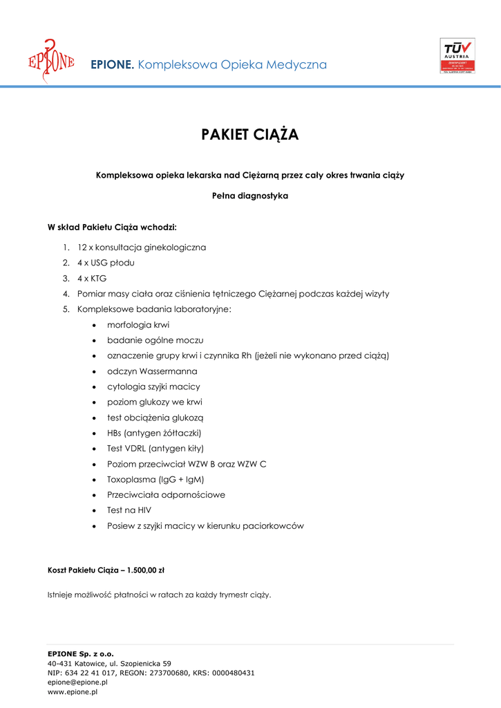 EPIONE. Kompleksowa Opieka Medyczna PAKIET CIĄŻA Kompleksowa opieka lekarska nad Ciężarną przez cały okres trwania ciąży Pełna diagnostyka W skład Pakietu Ciąża wchodzi: 1. 12 x konsultacja ginekologiczna 2. 4 x USG płodu 3. 4 x KTG 4. Pomiar masy ciała oraz ciśnienia tętniczego Ciężarnej podczas każdej wizyty 5. Kompleksowe badania laboratoryjne: morfologia krwi badanie ogólne moczu oznaczenie grupy krwi i czynnika Rh (jeżeli nie wykonano przed ciążą) odczyn Wassermanna cytologia szyjki macicy poziom glukozy we krwi test obciążenia glukozą HBs (antygen żółtaczki) Test VDRL (antygen kiły) Poziom przeciwciał WZW B oraz WZW C Toxoplasma (IgG + IgM) Przeciwciała odpornościowe Test na HIV Posiew z szyjki macicy w kierunku paciorkowców Koszt Pakietu Ciąża – 1.500,00 zł Istnieje możliwość płatności w ratach za każdy trymestr ciąży. EPIONE Sp. z o.o. 40-431 Katowice, ul. Szopienicka 59 NIP: 634 22 41 017, REGON: 273700680, KRS: 0000480431 [email protected] www.epione.pl EPIONE. Kompleksowa Opieka Medyczna HARMONOGRAM PROWADZENIA PAKIET CIĄŻA EPIONE I trymestr ciąży II trymestr ciąży III trymestr ciąży Konsultacja lekarska x 4 Konsultacja lekarska x 4 konsultacja lekarska x 4 Pomiar masy ciała oraz ciśnienia tętniczego Ciężarnej x 4 Pomiar masy ciała oraz ciśnienia tętniczego Ciężarnej x 4 Pomiar masy ciała oraz ciśnienia tętniczego Ciężarnej x 4 Morfologia krwi USG płodu x 1 USG płodu x 3 Oznaczenie grupy krwi i Rh (jeżeli nie wykonano przed ciążą) Morfologia krwi KTG x 4 Cytologia szyjki macicy Badanie ogólne moczu x 3 Morfologia krwi x 2 Badanie ogólne moczu x 2 Badanie poziomu glukozy po obciążeniu (test obciążenia glukozą) Badanie ogólne moczu x 3 Badanie poziomu glukozy we krwi Przeciwciała odpornościowe HBs (antygen żółtaczki) Test VDRL (antygen kiły) Posiew z szyjki macicy w kierunku paciorkowców Test w kierunku HIV Przeciwciała odpornościowe Przeciwciała w kierunku toxoplasmy (IgG + IgM) Przeciwciała WZW B oraz WZW C Odczyn Wassermanna Szczegółowe informacje dostępne telefonicznie: Poradnia Ginekologiczno – Położnicza ZOZ EPIONE, ul. Piotrowicka 68, Katowice – Ligota tel. 32 / 204 64 58 (w. 110) Poradnia Ginekologiczno – Położnicza ZOZ EPIONE, ul. Kijowska 71, Katowice – Panewniki tel. 32 / 206 40 68 Poradnia Ginekologiczno – Położnicza ZOZ EPIONE, ul. Zawiszy Czarnego 7a, Katowice – Osiedle Tysiąclecia, tel. 32 / 254 52 71 (w. 111) EPIONE Sp. z o.o. 40-431 Katowice, ul. Szopienicka 59 NIP: 634 22 41 017, REGON: 273700680, KRS: 0000480431 [email protected] www.epione.pl