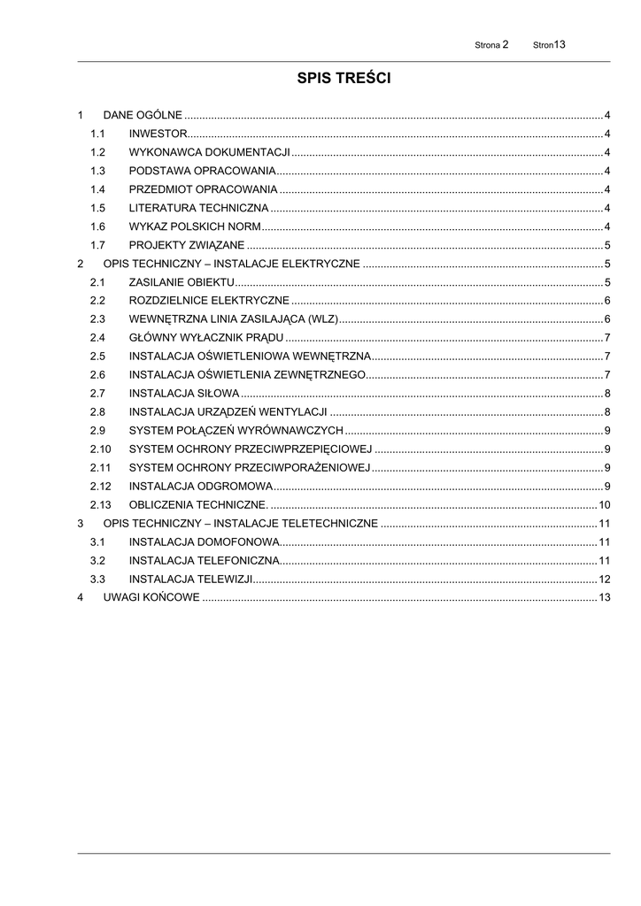 Strona 2 Stron13 SPIS TREŚCI 1 2 3 4 DANE OGÓLNE ............................................................................................................................................. 4 1.1 INWESTOR............................................................................................................................................ 4 1.2 WYKONAWCA DOKUMENTACJI......................................................................................................... 4 1.3 PODSTAWA OPRACOWANIA.............................................................................................................. 4 1.4 PRZEDMIOT OPRACOWANIA ............................................................................................................. 4 1.5 LITERATURA TECHNICZNA ................................................................................................................ 4 1.6 WYKAZ POLSKICH NORM................................................................................................................... 4 1.7 PROJEKTY ZWIĄZANE ........................................................................................................................ 5 OPIS TECHNICZNY – INSTALACJE ELEKTRYCZNE ................................................................................. 5 2.1 ZASILANIE OBIEKTU............................................................................................................................ 5 2.2 ROZDZIELNICE ELEKTRYCZNE ......................................................................................................... 6 2.3 WEWNĘTRZNA LINIA ZASILAJĄCA (WLZ)......................................................................................... 6 2.4 GŁÓWNY WYŁACZNIK PRĄDU ........................................................................................................... 7 2.5 INSTALACJA OŚWIETLENIOWA WEWNĘTRZNA.............................................................................. 7 2.6 INSTALACJA OŚWIETLENIA ZEWNĘTRZNEGO................................................................................ 7 2.7 INSTALACJA SIŁOWA .......................................................................................................................... 8 2.8 INSTALACJA URZĄDZEŃ WENTYLACJI ............................................................................................ 8 2.9 SYSTEM POŁĄCZEŃ WYRÓWNAWCZYCH ....................................................................................... 9 2.10 SYSTEM OCHRONY PRZECIWPRZEPIĘCIOWEJ ............................................................................. 9 2.11 SYSTEM OCHRONY PRZECIWPORAŻENIOWEJ .............................................................................. 9 2.12 INSTALACJA ODGROMOWA............................................................................................................... 9 2.13 OBLICZENIA TECHNICZNE. .............................................................................................................. 10 OPIS TECHNICZNY – INSTALACJE TELETECHNICZNE ......................................................................... 11 3.1 INSTALACJA DOMOFONOWA........................................................................................................... 11 3.2 INSTALACJA TELEFONICZNA........................................................................................................... 11 3.3 INSTALACJA TELEWIZJI.................................................................................................................... 12 UWAGI KOŃCOWE ..................................................................................................................................... 13 Strona 3 Stron13 SPIS RYSUNKÓW Rzut PIWNICY Instalacja oświetleniowa ............................................................................... rys. E-01 Rzut PARTERU Instalacja oświetleniowa ............................................................................. rys. E-02 Rzut PIĘTRA I Instalacja oświetleniowa ............................................................................... rys. E-03 Rzut PIĘTRA II Instalacja oświetleniowa .............................................................................. rys. E-04 Rzut PIĘTRA III Instalacja oświetleniowa ............................................................................. rys. E-05 Rzut PARTERU Instalacja siłowa ......................................................................................... rys. E-06 Rzut PIĘTRA I Instalacja siłowa ........................................................................................... rys. E-07 Rzut PIĘTRA II Instalacja siłowa .......................................................................................... rys. E-08 Rzut PIĘTRA III Instalacja siłowa ......................................................................................... rys. E-09 Rzut DACHU Instalacja odgromowa ..................................................................................... rys. E-10 Schemat tablic licznikowych TL ............................................................................................. rys. E-11 Schemat tablicy administracyjnej TA ..................................................................................... rys. E-12 Schemat tablicy węzła cieplnego TCW.................................................................................. rys. E-13 Schemat tablic mieszkalnych ................................................................................................ rys. E-14 Projekt zagospodarowania terenu ........................................................................................ rys. E-15 Rzut PARTERU Instalacja teletechniczna ............................................................................ rys. E-16 Rzut PIĘTRA I Instalacja teletechniczna ..............................................................................