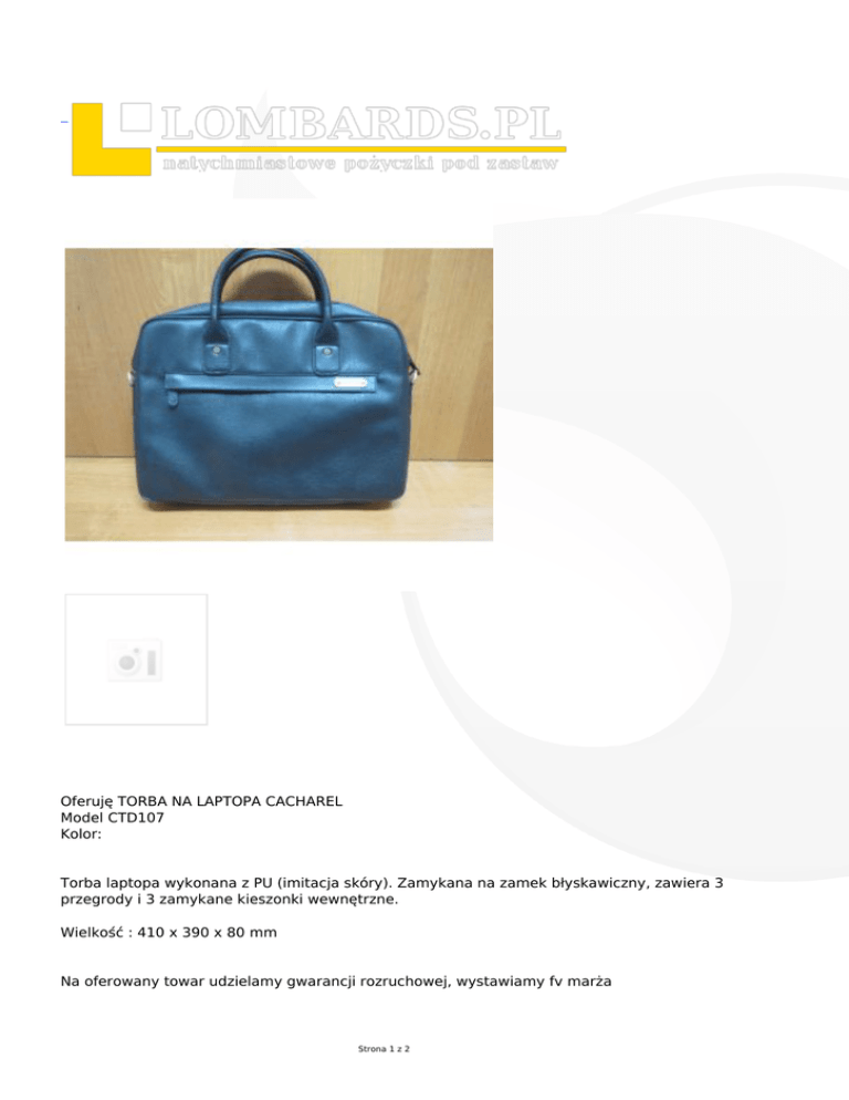Oferuję TORBA NA LAPTOPA CACHAREL Model CTD107 Kolor: Torba laptopa wykonana z PU (imitacja skóry). Zamykana na zamek błyskawiczny, zawiera 3 przegrody i 3 zamykane kieszonki wewnętrzne. Wielkość : 410 x 390 x 80 mm Na oferowany towar udzielamy gwarancji rozruchowej, wystawiamy fv marża Strona 1 z 2 Zapraszam do LOMBARDU Katowice, ul. Mikołowska 19/19 W godzinach od 8:00 do 20:00 (Od poniedziałku do soboty) www.lombards.pl Strona 2 z 2