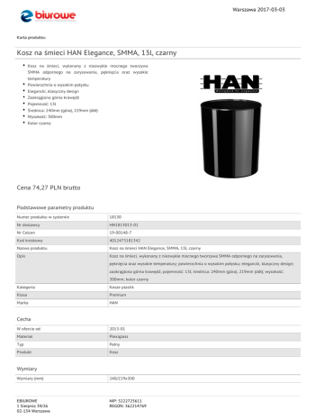 Warszawa 2017-03-03 Karta produktu: Kosz na śmieci HAN Elegance, SMMA, 13l, czarny Kosz na śmieci, wykonany z niezwykle mocnego tworzywa SMMA odpornego na zarysowania, pęknięcia oraz wysokie temperatury Powierzchnia o wysokim połysku Elegancki, klasyczny design Zaokrąglona górna krawędź Pojemność: 13l Średnica: 240mm (góra), 219mm (dół) Wysokość: 300mm Kolor czarny Cena 74,27 PLN brutto Podstawowe parametry produktu Numer produktu w systemie 18130 Nr dostawcy HN1813013-01 Nr Celcen 19-00148-7 Kod kreskowy 4012473181342 Nazwa produktu Kosz na śmieci HAN Elegance, SMMA, 13l, czarny Opis Kosz na śmieci, wykonany z niezwykle mocnego tworzywa SMMA odpornego na zarysowania, pęknięcia oraz wysokie temperatury; powierzchnia o wysokim połysku; elegancki, klasyczny design; zaokrąglona górna krawędź; pojemność: 13l; średnica: 240mm (góra), 219mm (dół); wysokość: 300mm; kolor czarny Kategoria Kosze plastik Klasa Premium Marka HAN Cecha W ofercie od 2013-01 Materiał Plexiglass Typ Pełny Produkt Kosz Wymiary Wymiary (mm) 240/219x300 EBIUROWE 1 Sierpnia 39/26 02-134 Warszawa NIP: 5222725611 REGON: 362214769 Warszawa 2017-03-03 Karta katalogowa produktu cd. Kosz na śmieci HAN Elegance, SMMA, 13l, czarny Wysokość (mm) 300 Rozmiar 13l Wspólny słownik zamówień CPV 39224340-3 Kosze Certyfikaty Nowy produkt w ofercie Standard Hit Standard Kolor Kolor Czarny Pozostałe zdjęcia produktu Serdecznie zapraszamy do współpracy EBIUROWE zespół. EBIUROWE 1 Sierpnia 39/26 02-134 Warszawa NIP: 5222725611 REGON: 362214769