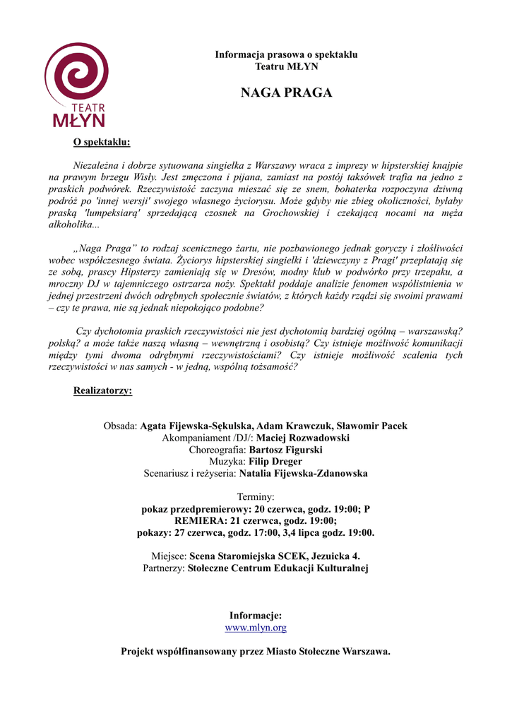 Informacja prasowa o spektaklu Teatru MŁYN NAGA PRAGA O spektaklu: Niezależna i dobrze sytuowana singielka z Warszawy wraca z imprezy w hipsterskiej knajpie na prawym brzegu Wisły. Jest zmęczona i pijana, zamiast na postój taksówek trafia na jedno z praskich podwórek. Rzeczywistość zaczyna mieszać się ze snem, bohaterka rozpoczyna dziwną podróż po 'innej wersji' swojego własnego życiorysu. Może gdyby nie zbieg okoliczności, byłaby praską 'lumpeksiarą' sprzedającą czosnek na Grochowskiej i czekającą nocami na męża alkoholika... „Naga Praga” to rodzaj scenicznego żartu, nie pozbawionego jednak goryczy i złośliwości wobec współczesnego świata. Życiorys hipsterskiej singielki i 'dziewczyny z Pragi' przeplatają się ze sobą, prascy Hipsterzy zamieniają się w Dresów, modny klub w podwórko przy trzepaku, a mroczny DJ w tajemniczego ostrzarza noży. Spektakl poddaje analizie fenomen współistnienia w jednej przestrzeni dwóch odrębnych społecznie światów, z których każdy rządzi się swoimi prawami – czy te prawa, nie są jednak niepokojąco podobne? Czy dychotomia praskich rzeczywistości nie jest dychotomią bardziej ogólną – warszawską? polską? a może także naszą własną – wewnętrzną i osobistą? Czy istnieje możliwość komunikacji między tymi dwoma odrębnymi rzeczywistościami? Czy istnieje możliwość scalenia tych rzeczywistości w nas samych - w jedną, wspólną tożsamość? Realizatorzy: Obsada: Agata Fijewska-Sękulska, Adam Krawczuk, Sławomir Pacek Akompaniament /DJ/: Maciej Rozwadowski Choreografia: Bartosz Figurski Muzyka: Filip Dreger Scenariusz i reżyseria: Natalia Fijewska-Zdanowska Terminy: pokaz przedpremierowy: 20 czerwca, godz. 19:00; P REMIERA: 21 czerwca, godz. 19:00; pokazy: 27 czerwca, godz. 17:00, 3,4 lipca godz. 19:00. Miejsce: Scena Staromiejska SCEK, Jezuicka 4. Partnerzy: Stołeczne Centrum Edukacji Kulturalnej Informacje: www.mlyn.org Projekt współfinansowany przez Miasto Stołeczne Warszawa. BIOGRAMY ARTYSTÓW Natalia Fijewska-Zdanowska (ur. 1981) – reżyser i dramaturg. Jest magistrem filozofii UW. Powołała do życia i prowadzi wraz z siostrami własną, autorską scenę niezależną Teatr MŁYN. W 2007 roku otrzymała Stypendium Ministra Kultury i Dziedzictwa Narodowego w dziedzinie Teatru. Realizuje kameralne spektakle autorskie, poddające artystycznej analizie współczesną rzeczywistość: monodram „Głuchoniemoc” (2004) „Różowa skarpetka” (2006), „De-naturat” (2007), „Siostry” (2008), „Piąta rano” (2009), „Gabinet” (2010), „Facet mojej żony” (2011), „Niunia” (2012), "Draka" (2013). Spektakle są wystawiane na Scenie Staromiejskiej SCEK, były także grane gościnnie na wielu scenach w całej Polsce, miedzy innymi w warszawskim Teatrze Powszechnym, Teatrze Polskim, czy Teatrze Ochoty. Agata Fijewska-Sękulska (ur. 1987) - Agata Fijewska-Sękulska (ur. 1987) aktorka, wokalistka, laureatka nagród aktorskich i wokalnych na przeglądach i festiwalach piosenki. Zagrała między innymi w spektaklu „Różowa skarpetka” (2006), który otrzymał szereg nagród, był grany w Teatrze Stara Prochownia w ramach Sceny OFF Teatru Konsekwentnego, a także w spektaklu „Siostry” (2008) zrealizowanym we współpracy z Teatrem na Woli w Warszawie, monodramie muzycznym „Piąta rano” (2009) w Teatrze Staromiejskim, który otrzymał GRAND PRIX Ogólnopolskiego Przeglądu Monodramu Współczesnego w Warszawie, oraz spektaklach muzycznych „Niunia” (2012) i „Draka” (2013). Wokalistka zespołu Nocny SuperSam. Ukończyła warszawską Wyższą Szkołę Psychologii Społecznej. Jest współzałożycielką Fundacji Artystycznej „MŁYN”, mającej obecnie siedzibę na Scenie Staromiejskiej SCEK w Warszawie i wielokrotną organizatorką przedsięwzięć kulturalnych z ramienia Fundacji. Adam Krawczuk (ur. 1971) ukończył warszawską PWST. Aktor teatralny i filmowy. W 1996 założył razem z kolegami Teatr Montownia, z którym aktualnie występuje na deskach Och-Teatru. Grał między innymi w serialach: „Plebania”, „Układ Warszawski”, „Na wspólnej”, Klan” oraz w filmach „Ciało” czy „Pierwszy milion”. Współpracował z Teatrem Powszechnym im. Zygmunta Hübnera oraz Teatrem Studio. Reżyser one-man-show z Rafałem Rutkowskim pt. „Sex polski”. W Teatrze Młyn występuje także w spektaklu „Niunia”. Sławomir Pacek (ur. w 1967 w Starachowicach) – polski aktor filmowy i teatralny. Ukończył warszawską PWST w roku 1990. W latach 1990 - 1996 był aktorem stołecznego Teatru Nowego, gdzie występował m.in. jako Czupurek, szekspirowski Merkuccio i Pan Tadeusz w spektaklach Adama Hanuszkiewicza. Od roku 1997 jest aktorem Teatru Powszechnego. Ma na swoim koncie drugoplanowe role w popularnych filmach kinowych, m.in. Ostatni dzwonek, Spona, Kraj świata, Młode wilki, Chłopaki nie płaczą, a także szereg ról w spektaklach Teatru TV stworzonych pod kierunkiem m.in. Olgi Lipińskiej, Andrzeja Łapickiego, Agnieszki Glińskiej, Stanisława Różewicza i Władysława Kowalskiego. Jest także cenionym aktorem radiowym. W Teatrze Młyn występuje także w spektaklu „Facet mojej żony”. Maciej Rozwadowski - (ur. 1986) rzeźbiarz, muzyk, perkusista. W 2013 roku ukończył studia na wydziale rzeźby warszawskiej Akademii Sztuk Pięknych. Laureat drugiej nagrody w międzynarodowym konkursie medalierskim w Helsinkach. Właściciel firmy BEE SOUND zajmującej się perkusyjną muzyką sesyjną i edukacją w jej kierunku, jak również pozaszkolną edukacją artystyczną. Czynny perkusista współpracujący z zespołami Nocny SuperSam, Henry David's GUN i Gambit. Filip Dreger (ur. 1977) z wykształcenia filolog polski i pianista po średniej szkole muzycznej. Pracuje zawodowo jako programista i konsultant specjalizujący się w Javie, głównie w dziedzinie aplikacji webowych i mobilnych. Od czasu pierwszego wysłuchania musicalu 