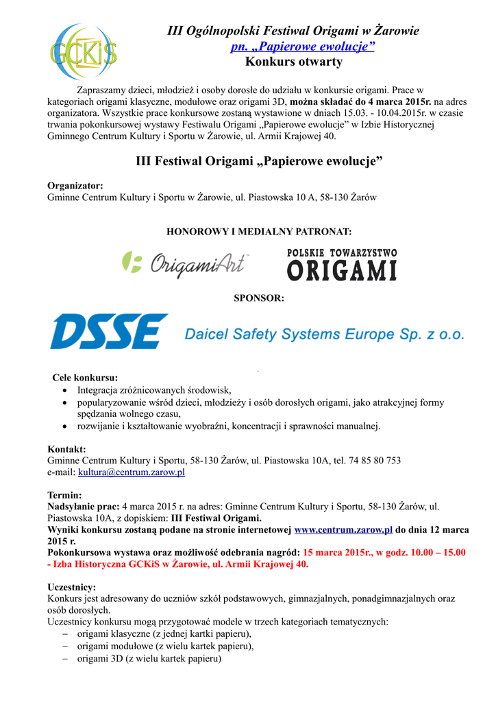 III Ogólnopolski Festiwal Origami w Żarowie pn. „Papierowe ewolucje” Konkurs otwarty Zapraszamy dzieci, młodzież i osoby dorosłe do udziału w konkursie origami. Prace w kategoriach origami klasyczne, modułowe oraz origami 3D, można składać do 4 marca 2015r. na adres organizatora. Wszystkie prace konkursowe zostaną wystawione w dniach 15.03. - 10.04.2015r. w czasie trwania pokonkursowej wystawy Festiwalu Origami „Papierowe ewolucje” w Izbie Historycznej Gminnego Centrum Kultury i Sportu w Żarowie, ul. Armii Krajowej 40. III Festiwal Origami „Papierowe ewolucje” Organizator: Gminne Centrum Kultury i Sportu w Żarowie, ul. Piastowska 10 A, 58-130 Żarów HONOROWY I MEDIALNY PATRONAT: SPONSOR: Cele konkursu: • Integracja zróżnicowanych środowisk, • popularyzowanie wśród dzieci, młodzieży i osób dorosłych origami, jako atrakcyjnej formy spędzania wolnego czasu, • rozwijanie i kształtowanie wyobraźni, koncentracji i sprawności manualnej. Kontakt: Gminne Centrum Kultury i Sportu, 58-130 Żarów, ul. Piastowska 10A, tel. 74 85 80 753 e-mail: [email protected] Termin: Nadsyłanie prac: 4 marca 2015 r. na adres: Gminne Centrum Kultury i Sportu, 58-130 Żarów, ul. Piastowska 10A, z dopiskiem: III Festiwal Origami. Wyniki konkursu zostaną podane na stronie internetowej www.centrum.zarow.pl do dnia 12 marca 2015 r. Pokonkursowa wystawa oraz możliwość odebrania nagród: 15 marca 2015r., w godz. 10.00 – 15.00 - Izba Historyczna GCKiS w Żarowie, ul. Armii Krajowej 40. Uczestnicy: Konkurs jest adresowany do uczniów szkół podstawowych, gimnazjalnych, ponadgimnazjalnych oraz osób dorosłych. Uczestnicy konkursu mogą przygotować modele w trzech kategoriach tematycznych: − origami klasyczne (z jednej kartki papieru), − origami modułowe (z wielu kartek papieru), − origami 3D (z wielu kartek papieru) ������������������������������������������ ���������������������� ������������� ����������������������������������������������������������������������� ���������������������������������������������������������������������������������������� ������������������������������������������� �����������������!"�#��$!#�#%�&#!"��������� �������������������'�������(��������)������*���������������'�+�,����-����������' .�������/������0�������1������2����������3����0��'���'%#� �������������������� !�"�������������#�$ ������%���& .�����/������0�������1������2��������������������!#3�"4$!�#2��5� '�(�)�*+���,-.�/0(+�!/1)�(/1& 2!�(2�)& 3������������& • ,�������'���5�����������6��������� • ����������������6�5��������������������5������������������'����������'��'7���� ��8������������������� • �����'������������������������9�������������'���������6����������'� �����& .�����/������0�������1������"4$!�#2��5���������������!#3�����:%4"4#:"� �$����;�������<���������������� 1�����& (����������"���&%�����&#!"���������;.�����/������0�������1������"4$!�#2��5����� ����������!#3�����������;�������������������� *���������������%����4�"�������������������������#������������%�����"������������������� ������� !����������������������%��������5�����6����������7�&����������������8������%��������9������� :��%6��'������%���;3��2���<������8�����/��������#���#����� =�%������& 0������'��������������������5����5��������������������'������������������'���������� ��5����������� =�������������������� ����������>������������������������������������; − �