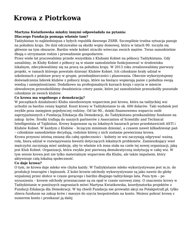 Krowa z Piotrkowa Martyna Kwiatkowska między innymi odpowiadała na pytania: Dlaczego Fundacja pomaga właśnie tam? Tadżykistan to najbiedniejsza z byłych republik dawnego ZSRR. Szczególnie trudna sytuacja panuje na południu kraju. Do dziś odczuwalne są skutki wojny domowej, która w latach 90. toczyła się głównie na tym obszarze. Bardzo wiele kobiet straciło wówczas swoich mężów. Teraz samodzielnie dbają o utrzymanie rodzin i prowadzenie gospodarstw. Przez wiele lat pracowaliśmy przede wszystkim z Klubami Kobiet na północy Tadżykistanu. Gdy uznaliśmy, że Kluby Kobiet z północy są w stanie samodzielnie funkcjonować w środowisku lokalnym, zdecydowaliśmy się na pracę na południu kraju. W 2013 roku zrealizowaliśmy pierwszy projekt, w ramach którego powstało dziesięć Klubów Kobiet. Ich członkinie brały udział w szkoleniach z podstaw pracy w grupie, przedsiębiorczości i planowania. Obecnie wykorzystujemy doświadczenia liderek klubów z północy kraju, które na bieżąco wspierają panie z południa swoją wiedzą i umiejętnościami. Dodatkowo na profesjonalnych kursach kroju i szycia w mieście obwodowym przeszkoliliśmy dwadzieścia cztery panie, które już samodzielnie przeszkoliły pozostałe członkinie ze swoich klubów. Co krowa ma wspólnego z demokracją? W początkach działalności Klubu nieodzownym wsparciem jest krowa, która na tadżyckiej wsi uchodzi za bardzo cenny kapitał. Koszt krowy w Tadżykistanie to ok. 600 dolarów. Taki wydatek jest zwykle poza zasięgiem pojedynczej rodziny. Od lat 90., dzięki finansowemu wsparciu osób zaprzyjaźnionych z Fundacją Edukacja dla Demokracji, do Tadżykistanu przekazaliśmy fundusze na zakup krów. Środki trafiają do naszych partnerów z Association of Scientific and Technical Intelligentsia of Tajikistan. Krowy kupowane są na lokalnych bazarach przez przedstawicieli ASTI i Klubów Kobiet. W każdym z Klubów – liczącym minimum dziesięć, a czasem nawet kilkadziesiąt pań – członkinie samodzielnie decydują, rodzinie której z nich zostanie powierzona krowa. Krowa przynosi istotną zmianę dla całej społeczności – kobiety ze wsi zaczynają odgrywać ważną rolę, biorą udział w rozwiązywaniu kwestii dotyczących lokalnych problemów. Zamieszkujący wieś mężczyźni zaczynają mieć ambicję, aby to właśnie ich żona stała na czele tej nowej organizacji, jaką jest Klub Kobiet. Organizacji, która zwykle jest pierwszą demokratyczną instytucją w całej wsi. W tym sensie krowa jest nie tylko materialnym wsparciem dla Klubu, ale także impulsem, który aktywizuje całą lokalną społeczność. Co daje krowa? O tym, że krowa daje mleko wie chyba każdy. W Tadżykistanie mleko wykorzystywane jest m.in. do produkcji twarogów i lepioszek. Z kolei krowie odchody wykorzystywane są jako nawóz do gleby wypalonej przez słońce w czasie gorącego i bardzo długiego tadżyckiego lata. Poza tym – po wysuszeniu – krowie odchody przeznaczane są na opał w czasie surowej zimy. O znaczeniu krowy w Tadżykistanie w poniższych nagraniach mówi Martyna Kwiatkowska, koordynatorka projektów z Fundacji Edukacja dla Demokracji. W tej chwili Fundacja nie prowadzi akcji na Polakpotrafi.pl, tylko zbiera fundusze na zakup krów i maszyn do szycia bezpośrednio na konto. Możesz pobrać krowę z numerem konto i przekazać ją dalej