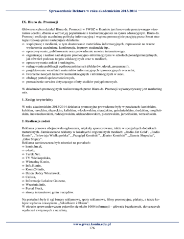 Sprawozdanie Rektora w roku akademickim 2013/2014 IX. Biuro ds. Promocji Głównym celem działań Biura ds. Promocji w PWSZ w Koninie jest kreowanie pozytywnego wizerunku uczelni, dbanie o wzrost jej popularności i konkurencyjności na rynku edukacyjnym. Biuro ds. Promocji realizuje uczelnianą politykę informacyjną i wspiera promocyjnie przyjętą przez Senat strategię rozwoju przez następujące działania: • współpracę z mediami, w tym dostarczanie materiałów informacyjnych, zapraszanie na ważne wydarzenia uczelniane, konferencje, imprezy studenckie itp., • opracowywanie, publikowanie oraz prowadzenie serwisu internetowego, • organizację i nadzór nad akcjami promocyjno-informacyjnymi w szkołach ponadgimnazjalnych, jak również podczas targów edukacyjnych oraz w mediach, • opracowywanie ankiet i rankingów, • redagowanie publikacji ogólnouczelnianych (folderów, ulotek, prezentacji), • projektowanie wszelkich materiałów informacyjnych i promocyjnych o uczelni, • tworzenie nowych kanałów komunikacyjnych i informacyjnych w sieci, • obsługę portali społecznościowych, • prowadzenie serwisu dotyczącego oferty studiów podyplomowych. W działaniach promocyjnych realizowanych przez Biuro ds. Promocji wykorzystywany jest marketing mix. 1. Zasięg terytorialny W roku akademickim 2013/2014 działania promocyjne prowadzone były w powiatach: konińskim, kolskim, tureckim, słupeckim, kaliskim, włocławskim, sieradzkim, gnieźnieńskim, średzkim, mogileńskim, inowrocławskim, radziejowskim, aleksandrowskim, pleszewskim, jarocińskim, wrzesińskim. 2. Realizacja zadań Reklama prasowa obejmowała ogłoszenia, artykuły sponsorowane, także w specjalnych dodatkach maturalnych. Zamieszczano reklamy w lokalnych i regionalnych mediach: „Radio Zet Gold”, „Radio Konin”, „Telewizja Wielkopolska”, „Przegląd Koniński”, „Kurier Koniński”, „Gazeta Słupecka”, „Głos Słupcy”. Reklama zamieszczana była również na portalach: • konin.lm.pl, • e-kolo, • Turek.Net, • TV Wielkopolska, • Wirtualny Konin, • Info.Konin, • Konin24.info, • Dzień Dobry Włocławek, • Calisia, • Informacje Lokalne Gniezno, • Września.Info, • Portal Płock, • strony internetowe gmin i urzędów. Na portalach były (i są) banery reklamowe, spoty reklamowe, filmy promocyjne, plakaty, a także kolejne wydania czasopisma „Szkiełkiem i Okiem”. W okresie sprawozdawczym pojawiło się około 1000 informacji – głównie bezpłatnych, dotyczących wydarzeń związanych z uczelnią. www.pwsz.konin.edu.pl 126 Państwowa Wyższa Szkoła Zawodowa w Koninie 3. Współpraca z portalami edukacyjnymi Podobne jak w latach ubiegłych, PWSZ w Koninie jest obecna na portalach edukacyjnych i wyszukiwarkach ogólnopolskich bezpłatnych oraz dwóch płatnych: www.pomaturze.pl oraz www.Study4u.eu. 4. Targi edukacyjne Zaprezentowaliśmy naszą ofertę edukacyjną podczas ośmiu imprez wystawienniczych dla maturzystów. Na stoisku PWSZ w Koninie uczniowie szkół ponadgimnazjalnych mieli okazję wziąć udział w konkursach wiedzy o poszczególnych kierunkach prowadzonych przez uczelnię. Targi edukacyjne odbyły się w Gnieźnie, Koninie, Kole, Turku, Sieradzu, Słupcy, Inowrocławiu i Kaliszu. 5. Prezentacje w szkołach ponadgimnazjalnych Przeprowadziliśmy ponad 70 spotkań bezpośrednich w szkołach ponadgimnazjalnych w Koninie, Kole, Słupcy, Turku, Jarocinie, Tarcach, Gnieźnie, Wrześni, Pleszewie, Inowrocławiu, Kaliszu, Bielicach, Izbicy Kujawskiej, Lubrańcu, Kruszwicy, Mogilnie, Kłodawie oraz w szkołach z powiatu konińskiego i powiatów ościennych. Prezentacje odbywały się głównie podczas lekcji i skierowane były do maturzystów. W sumie podczas promocji bezpośredniej dotarliśmy do ponad 3500 osób. 6. Wykłady otwarte Od roku akademickiego 2013/2014 przygotowana została oferta wykładów otwartych dla uczniów szkół ponadgimnazjalnych z całego regionu. Wykładowcy z wszystkich wydziałów przygotowali ofertę opartą na prezentacjach, wykładach, zgodnie z profilem uczelni oraz odwiedzanych szkół. Zajęcia prowadzono zarówno na uczelni, jak i w poszczególnych szkołach. W sumie odbyły się 42 wykłady otwarte dla maturzystów. 7. Akademia Młodego Studenta W roku akademickim 2013/2014 w PWSZ w Koninie uruchomiono Akademię Młodego Studenta. Ideą projektu jest rozwijanie u dzieci i młodzieży postaw twórczych, popularyzacja edukacji i wzbudzanie zainteresowania zagadnieniami naukowymi. Założeniem funkcjonowania AMS jest cykl spotkań w formie warsztatów, wykładów, zajęć korekcyjno-gimnastycznych, przeprowadzonych na uczelni przez poszczególne katedry i zakłady. Projekt swoim zasięgiem obejmuje wszystkie typy szkół – podstawowe, gimnazjalne i ponadgimnazjalne z powiatu kolskiego, tureckiego, słupeckiego i konińskiego. Od grudnia 2013 r. do czerwca 2014 r. odbyło się 14 spotkań w ramach nowego projektu, w którym czynny udział wzięło Biuro ds. Promocji. 8. Wydarzenia Biuro ds. Promocji prowadzi kalendarz wydarzeń na każdy rok akademicki. W roku 2013/2014 odbyło się 65 dużych imprez/wydarzeń/spotkań organizowanych na uczelni, przy których to wydarzeniach Biuro ds. Promocji współpracowało z jednostkami odpowiedzialnymi za organizację przedsięwzięcia. Biuro uczestniczyło w przygotowaniu i drukowaniu grafiki (zaproszeń, plakatów), promocji wydarzeń w mediach, dbało o sprawy organizacyjne, oprawę fotograficzną itd. Do najważniejszych wydarzeń mijającego roku akademickiego należały: • Drzwi Otwarte, • konferencja historyczna „Ku wolności” z udziałem prof. Jerzego Buzka oraz Władysława Frasyniuka, • Akademia Młodego Studenta – bezpieczeństwo wewnętrzne. www.pwsz.konin.edu.pl 127 Sprawozdanie Rektora w roku akademickim 2013/2014 9. Serwis internetowy Biuro ds. Promocji zajmuje się rozwojem i nadzorem serwisu internetowego PWSZ w Koninie, zarządza informacjami