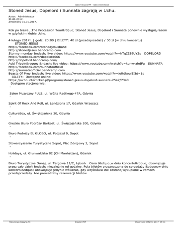 radio Toksyna FM - radio internetowe Stoned Jesus, Dopelord i Sunnata zagrają w Uchu. Autor: Administrator 31.01.2017. Zmieniony 31.01.2017. Rok po trasie ,,The Procession Tour” Stoned Jesus, Dopelord i Sunnata ponownie wystąpią razem w gdyńskim klubie Ucho. 4 lutego 2017r. | godz. 20:00 | BILETY: 40 zł (przedsprzedaż) / 50 zł (w dniu koncertu) STONED JESUS http://facebook.com/stonedjesusband http://stonedjesus.bandcamp.com Stormy monday – live video: https://www.youtube.com/watch?v=hTqJZS9UYZs DOPELORD http://facebook.com/dopelord666 http://dopelord.bandcamp.com/ Acid Trippin’ – live video: https://www.youtube.com/watch?v=kunw-alnIFg SUNNATA http://facebook.com/sunnataofficial http://sunnataofficial.bandcamp.com Beasts Of Prey – live video: https://www.youtube.com/watch?v=joftdkoulEI&t=1s BILETY: Dostępne online: https://ucho.interticket.pl/program/stoned-jesus-dopelord-sunnata-2547/7340 Dostępne stacjonarnie: Salon Muzyczny PULS, ul. Wójta Radtkego 47A, Gdynia Spirit Of Rock And Roll, ul. Lendziona 17, Gdańsk Wrzeszcz CultureBox, ul. Świętojańska 30, Gdynia Greckie Biuro Podróży Barkost, ul. Świętojańska 100, Gdynia Biuro Podróży EL GLOBO, ul. Podjazd 9, Sopot Stowarzyszenie Turystyczne Sopot, Plac Zdrojowy 2, Sopot Holidays, ul. Grunwaldzka 82 (CH Manhattan), Gdańsk Biuro Turystyczne Dunaj, ul. Targowa 11/2, Lębork Cena „w dniu koncertu” obowiązuje przez cały dzień – niezależnie od godziny. Pula biletów przeznaczona do sprzedaży „w dniu koncertu” obowiązuje jedynie wówczas, gdy wejściówki nie zostaną wykupione w ramach przedsprzedaży. Nie prowadzimy rezerwacji biletów. http://www.toksyna.fm Kreator PDF Utworzono 3 March, 2017, 19:14