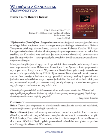 Wędrówki z Gandalfem. Przywództwo Brian Tracy, Robert Kozak ISBN: 978-83-7746-372-7 format 141/218, oprawa twarda z obwolutą liczba stron: 200 cena: 44,90 zł Wędrówki z Gandalfem. Przywództwo to inspirująca i motywująca historia młodego lidera napisana przez znanego amerykańskiego szkoleniowca Briana Tracy oraz polskiego dziennikarza, coacha i trenera Roberta Kozaka. Ta książka z gatunku business fiction (którego wybitnymi reprezentantami są takie bestsellery jak Kto zabrał mój ser? oraz Jednominutowy Menedżer) przeznaczona jest dla przywódców – także przyszłych, coachów, i osób zainteresowanych rozwojem osobistym. Niniejsza książka jest drugą z serii opowieści biznesowych poświęconych różnym aspektom biznesu. Bohaterem historii jest Tom Spencer, którego poznajemy w pierwszej książce z serii Wędrówek z Gandalfem, gdy zostaje zatrudniony w dziale sprzedaży firmy FSNS. Tym razem Tom nieoczekiwanie dostaje awans. Przeżywając z bohaterem jego porażki i sukcesy, wzloty i upadki, niejednokrotnie odnajdziesz w tych sytuacjach siebie. Pozwoli ci to dużo efektywniej zastosować w praktyce zawarte tutaj porady dotyczące sposobów osiągania wyjątkowych rezultatów w przywództwie. Gratulacje! – powiedział, wciąż szczerząc się w serdecznym uśmiechu. Uścisnął mi rękę i poklepał po plecach. Coś mi się zdaje, że zaczynamy nową przygodę i będziemy się od tej chwili znowu częściej spotykali. – Fragment książki O autorach Brian Tracy jest ekspertem w dziedzinach zarządzania zasobami ludzkimi, organizacji czasu i psychologii sprzedaży. Robert Kozak jest certfikowanym coachem, doradza wysokiej kadrze menedżerskiej w zakresie przywództwa, zarządzania zmianą i tworzenia strategii. Pełnił funkcję Executive Director w jednej ze światowych firm headhunterskich tzw. Wielkiej Piątki, gdzie poszukiwał członków zarządów na poziomie Europy Środkowej i Wschodniej. www.mtbiznes.pl Wędrówki z Gandalfem. Przywództwo SPIS TREŚCI Rozdział I Pierwsze kroki lidera ........................................................ 7 Rozdział II Samoświadomość lidera – styl zarządzania ..................... 29 Rozdział III Komunikacja i delegowanie ............................................ 79 Rozdział IV Lider, menedżer, coach ................................................... 97 Rozdział V Motywacja twojego zespołu ........................................... 113 Rozdział VI Osobista motywacja lidera ............................................. 131 Rozdział VII Networking ................................................................... 157 Rozdział VIII Rekrutacja i trudne decyzje ........................................... 167 Rozdział IX Mapowanie zespołu i negatywna informacja zwrotna .... 189 Rozdział X Epilog ............................................................................ 199 www.mtbiznes.pl Wędrówki z Gandalfem. Przywództwo I PIERWSZE KROKI LIDERA M ój szef Robert dostał awans – został członkiem zarządu odpowiedzialnym za sprzedaż. Gratulowaliśmy mu bardzo tego awansu, ale był to dla nas trudny moment, bo byliśmy przyzwyczajeni do jego sposobu zarządzania zespołem, ufaliśmy mu, a on dawał nam dużo swobody. Jak będzie dalej? – zastanawiałem się i byłem ciekaw, kto obejmie tę funkcję po Robercie. Tymczasowo obowiązki po nim przejął Mike, ale Monika też od dawna szykowała się na to stanowisko. Któregoś dnia Robert zadzwonił do mnie i poprosił o spotkanie. Pojechałem do niego windą na 40. piętro, gdzie mieści się cały zarząd firmy, zastanawiając się, o co może chodzić. Jak zwykle pokoje członków zarządu w większości były pootwierane, a siedzący za biurkami ludzie kiwali głowami, bądź machali ręką w geście przywitania. Nie wiedziałem, skąd się to bierze, ale zawsze miałem poczucie, że gdy ktoś tu wchodzi, jest przyjaźnie witany. Robert też przyjął mnie wyjątkowo serdecznie, ale miałem wrażenie, że nieco oficjalnie. Zastanawiałem się, czy to wynik awansu, czy tak jak dotąd, zapowiedź trudnej rozmowy. Usiedliśmy w fotelach w rogu gabinetu. Ze swojego miejsca miałem widok na miasto. Była piękna słoneczna pogoda i błękitne niebo odbijało się w szklanych wieżowcach. Znałem tę perspekty- www.mtbiznes.pl Wędrówki z Gandalfem. Przywództwo 8 Wõdrówki z Gandalfem. Przywództwo wę ze spotkań z moim coachem i mentorem, Samuelem Portlandem, nazywanym przeze mnie Gandalfem, ze względu na jego siwą brodę, włosy, podeszły wiek oraz zamiłowanie do fajki – jego gabinet był na tym samym piętrze i w tym samym skrzydle budynku. Sekretarka wniosła kawę – zauważyłem, że Robert zatrzymał serwis kawowy przywieziony z podróży do Indii – ten sam serwis, którego używał, gdy był jeszcze naszym bezpośrednim szefem. Było w tym coś swojskiego, ale spowodowało, że już byłem prawie pewien, że to będzie ważna rozmowa, bo Robert nigdy nie proponował kawy, gdy chodziło o załatwienie bieżących spraw. – Jak ci jest w nowym miejscu? – zapytałem, przerywając milczenie, które nastąpiło po wyjściu sekretarki. – Jeszcze trochę jestem zagubiony i cały czas próbuję się zorientować, co jest najważniejsze – odparł Robert. – A jak tam u was beze mnie na dwudziestym trzecim piętrze? – zapytał. – W porządku. Czekamy z niepokojem na nowego szefa. Najbardziej byśmy chcieli, żeby został nim Mike, jako najbardziej doświadczony i osoba pełniąca tymczasowo obowiązki szefa działu. Chyba nie bardzo jesteśmy gotowi na to, żeby przyszedł ktoś z zewnątrz, chociaż… W tym momencie ugryzłem się w język, bo nie chciałem Robertowi opowiadać o napięciach, jakie pojawiły się ostatnio między Mike’em a Moniką. Monika od dawna liczyła na awans i spodziewała się, że to ona obejmie schedę po Robercie. Tymczasem Robert wskazał na Mike’a jako swojego tymczasowego następcę 