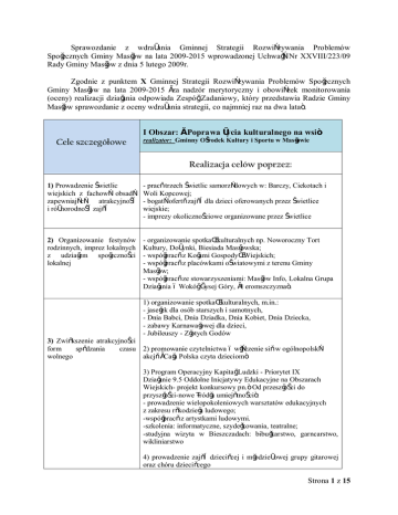 Sprawozdanie z wdrażania Gminnej Strategii Rozwiązywania Problemów Społecznych Gminy Masłów na lata 2009-2015 wprowadzonej Uchwałą Nr XXVIII/223/09 Rady Gminy Masłów z dnia 5 lutego 2009r. Zgodnie z punktem X Gminnej Strategii Rozwiązywania Problemów Społecznych Gminy Masłów na lata 2009-2015 „za nadzór merytoryczny i obowiązek monitorowania (oceny) realizacji działania odpowiada Zespół Zadaniowy, który przedstawia Radzie Gminy Masłów sprawozdanie z oceny wdrażania strategii, co najmniej raz na dwa lata”. I Obszar: „ Poprawa życia kulturalnego na wsi” Cele szczegółowe realizator: Gminny Ośrodek Kultury i Sportu w Masłowie Realizacja celów poprzez: 1) Prowadzenie świetlic wiejskich z fachową obsadą zapewniającą atrakcyjność i różnorodność zajęć - pracę trzech świetlic samorządowych w: Barczy, Ciekotach i Woli Kopcowej; - bogatą ofertę zajęć dla dzieci oferowanych przez świetlice wiejskie; - imprezy okolicznościowe organizowane przez świetlice 2) Organizowanie festynów rodzinnych, imprez lokalnych z udziałem społeczności lokalnej - organizowanie spotkań kulturalnych np. Noworoczny Tort Kultury, Dożynki, Biesiada Masłowska; - współpracę z Kołami Gospodyń Wiejskich; - współpracę z placówkami oświatowymi z terenu Gminy Masłów; - współpracę ze stowarzyszeniami: Masłów Info, Lokalna Grupa Działania – Wokół Łysej Góry, „Żeromszczyzna”. 1) organizowanie spotkań kulturalnych, m.in.: - jasełek dla osób starszych i samotnych, - Dnia Babci, Dnia Dziadka, Dnia Kobiet, Dnia Dziecka, - zabawy Karnawałowej dla dzieci, - Jubileuszy - Złotych Godów 3) Zwiększenie atrakcyjności form spędzania czasu 2) promowanie czytelnictwa – włączenie się w ogólnopolską wolnego akcję „Cała Polska czyta dzieciom” 3) Program Operacyjny Kapitał Ludzki - Priorytet IX Działanie 9.5 Oddolne Inicjatywy Edukacyjne na Obszarach Wiejskich- projekt konkursowy pn.” Od przeszłości do przyszłości-nowe źródła umiejętności”: - prowadzenie wielopokoleniowych warsztatów edukacyjnych z zakresu rękodzieła ludowego; -współpracę z artystkami ludowymi. -szkolenia: informatyczne, szydełkowania, teatralne; -studyjna wizyta w Bieszczadach: bibułkarstwo, garncarstwo, wikliniarstwo 4) prowadzenie zajęć dziecięcej i młodzieżowej grupy gitarowej oraz chóru dziecięcego Strona 1 z 15 Cele szczegółowe II Obszar „ Bezrobocie, działania wpływające na zmniejszenie bezrobocia’’ Realizator: Gminny Ośrodek Pomocy Społecznej w Masłowie; Urząd Gminy Masłów Realizacja celów poprzez: 1) Aktywizacja zawodowa 2) Wspieranie rozwoju kwalifikacji osób bezrobotnych. Zdobywanie nowych kwalifikacji zawodowych przez osoby długotrwale bezrobotne, w tym klientów Ośrodka Pomocy Społecznej - Program Operacyjny Kapitał Ludzki - Priorytet VII Poddziałanie 7.1.1 - "Rozwój i upowszechnianie aktywnej integracji przez ośrodki pomocy społecznej"- projekt systemowy pn.” Program aktywizacji społeczno-zawodowej bezrobotnych w gm. Masłów; - zawieranie kontraktów socjalnych mobilizujących do poszukiwania pracy; -Program Operacyjny Kapitał Ludzki- Priorytet VII Poddziałanie 7.2.1 „Aktywizacja zawodowa i społeczna osób zagrożonych wykluczeniem społecznym”- projekt konkursowy pn. ”Nam nie jest łyso!” - zachęcanie beneficjentów ostatecznych do korzystania z organizowanych kursów; - mobilizowanie klientów pomocy społecznej do poszukiwania pracy 3) Organizowanie prac społecznie użytecznych organizację prac społecznie użyteczne w ramach współpracy realizowanych przez osoby z Powiatowym Urzędem Pracy; korzystające z pomocy społecznej 4) Organizowanie kursów dla osób bezrobotnych GOPS zorganizował następujące szkolenia: - opiekun osób starszych i niepełnosprawnych, - masaż klasyczny i leczniczy, - sprzedawca z obsługą komputera i kasy fiskalnej, - budowanie wizerunku – jak przygotować się do skutecznego poszukiwania pracy, - trening umiejętności psychospołecznych Łysogórska Akademia Kobiet zorganizowała następujące szkolenia: 1) cykl szkoleń aktywizujących-Akademia Kobiet Sukcesu 2) cykl szkoleń zawodowych z warsztatami wyjazdowymi: - umiejętność pracy w grupie i komunikacji; - rękodzieło artystyczne; - obsługa komputera w biurze; - obsługa ruchu turystycznego; - doradca europejski w małej i średniej firmie; - praca w call centre; - wizaż i stylizacja 3) kursy językowe: angielski, niemiecki, włoski, rosyjski Strona 2 z 15 Cele szczegółowe III Obszar „Rozwiązywanie problemów alkoholowych’’ realizator: Urząd Gminy Masłów-Gminna Komisja ds. Profilaktyki i Rozwiązywania Problemów Alkoholowych w Masłowie Realizacja celów poprzez: 1) Skuteczne przeciwdziałanie uzależnieniom - współpracę z GOPS oraz z Posterunkiem Policji w Masłowie, - rozmowy interdyscyplinarne z osobami podejrzanymi o uzależnienie alkoholowe, - kierowanie wniosków do Sądu Rejonowego, Sądu Rodzinnego, - nadzór i kontrole punktów sprzedaży alkoholu, 2) Profesjonalna pomoc terapeutyczna - dyżur psychologa w punkcie konsultacyjnym GKRPA, - działanie na terenie Gminy grupy spotkań AA „Lubrzanka”, - współpracę z lekarzami biegłymi i psychologami ze Świętokrzyskiego Centrum Psychiatrii, - kierowanie osób uzależnionych na terapię i monitoring ich uczestnictwa w zajęciach. - realizację Ogólnopolskiej Społecznej Kampanii Edukacyjnej ”Sprawdź czy twoje picie jest bezpieczne”, - realizację w szkołach programów profilaktycznych. 3) Racjonalna i efektywna profilaktyka 4) Promocja zdrowego trybu życia Cele szczegółowe - wyjazd dzieci na kolonie wraz realizacją zajęć profilaktycznych; - wyjazdy terapeutyczne grupy AA „Lubrzanka”; - prowadzenie Punktu Konsultacyjnego; - piknik parafialny w Domaszowicach IV Obszar „ Zagospodarowanie wolnego czasu dzieci i młodzieży” realizator: Urząd Gminy Masłów-Gminna Komisja ds. Profilaktyki i R