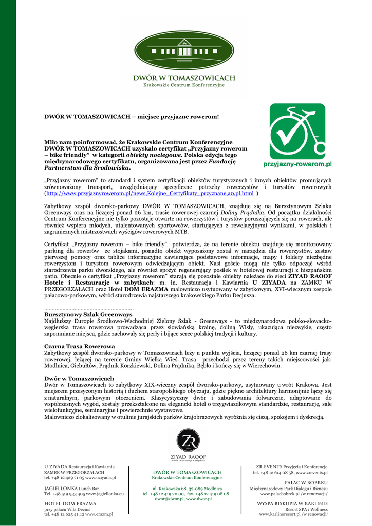 DWÓR W TOMASZOWICACH – miejsce przyjazne rowerom! Miło nam poinformować, że Krakowskie Centrum Konferencyjne DWÓR W TOMASZOWICACH uzyskało certyfikat „Przyjazny rowerom – bike friendly” w kategorii obiekty noclegowe. Polska edycja tego międzynarodowego certyfikatu, organizowana jest przez Fundację Partnerstwo dla Środowiska. „Przyjazny rowerom” to standard i system certyfikacji obiektów turystycznych i innych obiektów promujących zrównoważony transport, uwzględniający specyficzne potrzeby rowerzystów i turystów rowerowych (http://www.przyjaznyrowerom.pl/news,Kolejne_Certyfikaty_przyznane,a0,pl.html ) Zabytkowy zespół dworsko-parkowy DWÓR W TOMASZOWICACH, znajduje się na Bursztynowym Szlaku Greenways oraz na liczącej ponad 26 km, trasie rowerowej czarnej Doliny Prądnika. Od początku działalności Centrum Konferencyjne nie tylko pozostaje otwarte na rowerzystów i turystów poruszających się na rowerach, ale również wspiera młodych, utalentowanych sportowców, startujących z rewelacyjnymi wynikami, w polskich i zagranicznych mistrzostwach wyścigów rowerowych MTB. Certyfikat „Przyjazny rowerom – bike friendly” potwierdza, że na terenie obiektu znajduje się monitorowany parking dla rowerów ze stojakami, ponadto obiekt wyposażony został w narzędzia dla rowerzystów, zestaw pierwszej pomocy oraz tablice informacyjne zawierające podstawowe informacje, mapy i foldery niezbędne rowerzystom i turystom rowerowym odwiedzającym obiekt. Nasi goście mogą nie tylko odpocząć wśród starodrzewia parku dworskiego, ale również spożyć regenerujący posiłek w hotelowej restauracji z hiszpańskim patio. Obecnie o certyfikat „Przyjazny rowerom” starają się pozostałe obiekty należące do sieci ZIYAD RAOOF Hotele i Restauracje w zabytkach: m. in. Restauracja i Kawiarnia U ZIYADA na ZAMKU W PRZEGORZAŁACH oraz Hotel DOM ERAZMA malowniczo usytuowany w zabytkowym, XVI-wiecznym zespole pałacowo-parkowym, wśród starodrzewia najstarszego krakowskiego Parku Decjusza. ………………………………………………….. Bursztynowy Szlak Greenways Najdłuższy Europie Środkowo-Wschodniej Zielony Szlak - Greenways - to międzynarodowa polsko-słowackowęgierska trasa rowerowa prowadząca przez słowiańską krainę, doliną Wisły, ukazująca niezwykłe, często zapomniane miejsca, gdzie zachowały się perły i bijące serce polskiej tradycji i kultury. Czarna Trasa Rowerowa Zabytkowy zespół dworsko-parkowy w Tomaszowicach leży u punktu wyjścia, liczącej ponad 26 km czarnej trasy rowerowej, leżącej na terenie Gminy Wielka Wieś. Trasa przechodzi przez tereny takich miejscowości jak: Modlnica, Giebułtów, Prądnik Korzkiewski, Dolina Prądnika, Bębło i kończy się w Wierzchowiu. Dwór w Tomaszowicach Dwór w Tomaszowicach to zabytkowy XIX-wieczny zespół dworsko-parkowy, usytuowany u wrót Krakowa. Jest miejscem przesyconym historią i duchem staropolskiego obyczaju, gdzie piękno architektury harmonijnie łączy się z naturalnym, parkowym otoczeniem. Klasycystyczny dwór i zabudowania folwarczne, adaptowane do współczesnych wygód, zostały przekształcone na elegancki hotel o trzygwiazdkowym standardzie, restaurację, sale wielofunkcyjne, seminaryjne i powierzchnie wystawowe. Malowniczo zlokalizowany w otulinie jurajskich parków krajobrazowych wyróżnia się ciszą, spokojem i dyskrecją. U ZIYADA Restauracja i Kawiarnia ZAMEK W PRZEGORZAŁACH tel. +48 12 429 71 05 www.uziyada.pl JAGIELLONKA Lunch Bar Tel. +48 519 933 405 www.jagiellonka.eu HOTEL DOM ERAZMA przy pałacu Villa Decius tel. +48 12 625 41 42 www.erazm.pl DWÓR W TOMASZOWICACH Krakowskie Centrum Konferencyjne ul. Krakowska 68, 32-089 Modlnica tel. +48 12 419 20 00, fax. +48 12 419 08 08 [email protected], www.dwor.pl ZR EVENTS Przyjęcia i Konferencje tel. +48 12 614 08 58, www.zrevents.pl PAŁAC W BOBRKU Międzynarodowy Park Dialogu i Biznesu www.palacbobrek.pl /w renowacji/ WYSPA BISKUPIA W KARLINIE Resort SPA i Wellness www.karlinoresort.pl /w renowacji/