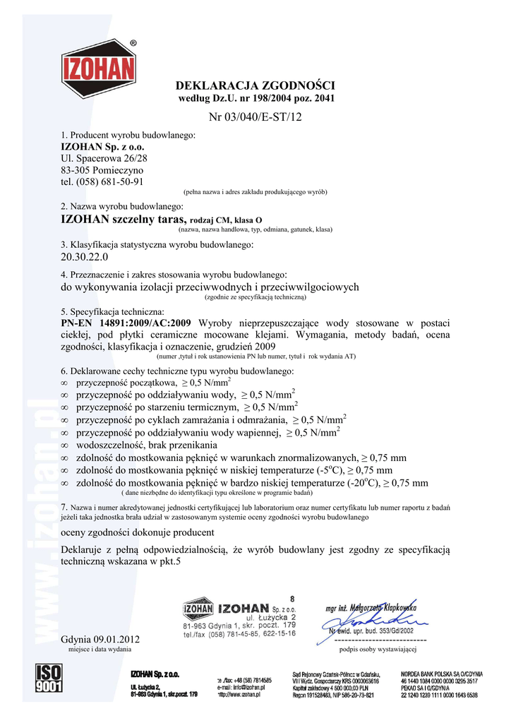 DEKLARACJA ZGODNOŚCI według Dz.U. nr 198/2004 poz. 2041 Nr 03/040/E-ST/12 1. Producent wyrobu budowlanego: IZOHAN Sp. z o.o. Ul. Spacerowa 26/28 83-305 Pomieczyno tel. (058) 681-50-91 (pełna nazwa i adres zakładu produkującego wyrób) 2. Nazwa wyrobu budowlanego: IZOHAN szczelny taras, rodzaj CM, klasa O (nazwa, nazwa handlowa, typ, odmiana, gatunek, klasa) 3. Klasyfikacja statystyczna wyrobu budowlanego: 20.30.22.0 4. Przeznaczenie i zakres stosowania wyrobu budowlanego: do wykonywania izolacji przeciwwodnych i przeciwwilgociowych (zgodnie ze specyfikacją techniczną) 5. Specyfikacja techniczna: PN-EN 14891:2009/AC:2009 Wyroby nieprzepuszczające wody stosowane w postaci ciekłej, pod płytki ceramiczne mocowane klejami. Wymagania, metody badań, ocena zgodności, klasyfikacja i oznaczenie, grudzień 2009 (numer ,tytuł i rok ustanowienia PN lub numer, tytuł i rok wydania AT) 6. Deklarowane cechy techniczne typu wyrobu budowlanego: • przyczepność początkowa, ≥ 0,5 N/mm2 • • • • • • • • przyczepność po oddziaływaniu wody, ≥ 0,5 N/mm2 przyczepność po starzeniu termicznym, ≥ 0,5 N/mm2 przyczepność po cyklach zamrażania i odmrażania, ≥ 0,5 N/mm2 przyczepność po oddziaływaniu wody wapiennej, ≥ 0,5 N/mm2 wodoszczelność, brak przenikania zdolność do mostkowania pęknięć w warunkach znormalizowanych, ≥ 0,75 mm zdolność do mostkowania pęknięć w niskiej temperaturze (-5oC), ≥ 0,75 mm zdolność do mostkowania pęknięć w bardzo niskiej temperaturze (-20oC), ≥ 0,75 mm ( dane niezbędne do identyfikacji typu określone w programie badań) 7. Nazwa i numer akredytowanej jednostki certyfikującej lub laboratorium oraz numer certyfikatu lub numer raportu z badań jeżeli taka jednostka brała udział w zastosowanym systemie oceny zgodności wyrobu budowlanego oceny zgodności dokonuje producent Deklaruje z pełną odpowiedzialnością, że wyrób budowlany jest zgodny ze specyfikacją techniczną wskazana w pkt.5 Gdynia 09.01.2012 miejsce i data wydania --------------------------podpis osoby wystawiającej