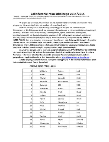 Zakończenie roku szkolnego 2014/2015 ( autor fot. : Tomasz Bołt , źródło: http://www.dziennikbaltycki.pl/artykul/zdjecia/3914785,koniec-roku-szkolnego-20142015-wtrojmiejskich-szkolach-zdjecia,5588485,id,t,zid.html / ) W piątek 26 czerwca 2015 odbyło się na płycie boiska uroczyste zakończenie roku szkolnego dla wszystkich klas gimnazjalnych oraz licealnych. Podczas uroczystości zostały wręczone listy gratulacyjne 24. absolwentom Gimnazjum nr 24, którzy wyróżnili się podczas 3-letniej nauki w różnych dziedzinach edukacji szkolnej ( praca na rzecz innych ludzi, samorządność, sport, dokonania artystyczne, przedsiębiorczość, konkursy i olimpiady naukowe ). 21 najlepszych uczniów ( po jednym z każdej klasy – wybitni w jednej lub więcej ww dziedzinach ) otrzymało tytuły PRIMUS INTER PARES, listy gratulacyjne oraz nagrody książkowe ( zob. listy wyróżnionych ). Ponadto uhonorowani zostali także Zofia Jankowska oraz Kacper Walentynowicz - absolwenci Gimnazjum nr 24 , którzy najlepiej zdali egzamin gimnazjalny uzyskując maksymalną liczbę punktów za każdą z sześciu części tego egzaminu, czyli łącznie 600 pkt. Za wybitne osiągnięcia w zakresie geografii stypendium „SVENDROMA” ( 3420 PLN ) otrzymał Adam Rytel. W imieniu fundatorów – Pani Grażyny Norwisz oraz Pana Krystiana Norwisza – dyrektor Wiesław Kosakowski przekazał Adamowi stypendium i piękny geograficzny dyplom (Fundacja im. Swena Norwisza; http://svendrom.w.interia.pl/ ). Z kolei piękny puchar i dyplom za wybitne osiągnięcia w dziedzinie matematyki oraz informatyki otrzymał Paweł Burzyński. PRIMUS INTER PARES - 2015 1 Wiktoria Pedryc I AG 2 Hanna Renko I BG 3 Michał Umiński I MG 4 Karolina Raczkowska II AG 5 Zuzanna Olik II BG 6 Weronika Praska II MG 7 Klaudia Kreft III AG 8 Hubert Nadziejko III BG 9 Paweł Sawicki III MG 10 Zofia Olsztyńska IA 11 Maja Michalik IB 12 Michał Szostek I Mf 13 Jan Klinkosz I Mi 14 Paulina Bień I MYP 15 Kamil Aftyka I PRE-IB 16 Małgorzata Fic II Aekon 17 Marta Karkowska II Ahum 18 Małgorzata Styczewska II B 19 Łukasz Śliwiński II Mf 20 Julia Bazińska II Mi 21 Stanisław Tomaszczyk II IB LISTY GRATULACYJNE - KL. III GIMNAZJUM 1 Jakub Bober III AG 2 Zofia Jankowska III AG 3 Bianka Kiedrowska III AG 4 Robert Sikorski III AG 5 Jaromir Stromski III AG 6 Adrian Zaorski III AG 7 Dominika Dawidowska III BG 8 Natalia Królak III BG 9 Michał Kugacki III BG 10 Antonina III BG 11 Marta Machała RadwanWińska 12 Aleksander Topolewski III BG 13 Zuzanna Adamiuk III MG 14 Adam Borsuk III MG 15 Julia Depczyńska III MG 16 Wiktoria Drochlińska III MG 17 Wojciech Jankowski III MG 18 Teresa Kapica III MG 19 Kacper Kluk III MG 20 Piotr Kowalewski III MG 21 Juliusz Pham III MG 22 Anna Subczyńska III MG 23 Karol Sylwestrzak III MG 24 Kacper Walentynowicz III MG III BG Zofia Jankowska oraz Kacper Walentynowicz - absolwenci Gimnazjum nr 24 , którzy najlepiej zdali egzamin gimnazjalny Stypendium „SVENDROMA” otrzymuje Adam Rytel Puchar i dyplom za wybitne osiągnięcia w dziedzinie matematyki oraz informatyki otrzymuje Paweł Burzyński