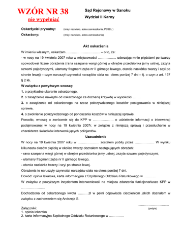 WZÓR NR 38 nie wypełniać Sąd Rejonowy w Sanoku Wydział II Karny Oskarżyciel prywatny: (imię i nazwisko, adres zamieszkania, PESEL ) Oskarżony: (imię i nazwisko, adres zamieszkania) Akt oskarżenia W imieniu własnym, oskarżam …………………………. – o to, że: - w nocy na 19 kwietnia 2007 roku w miejscowości …………….. uderzając mnie pięściami po twarzy spowodował liczne obrażenia (rana szarpana wargi górnej w obrębie przedsionka jamy ustnej, zszyta szwami pojedynczymi, ułamany fragment zęba nr II górnego lewego, otarcia naskórka twarzy i szyi po stronie lewej) – czym naruszył czynności narządów ciała na okres poniżej 7 dni – tj. o czyn z art. 157 § 2 kk. W związku z powyższym wnoszę: 1. o przykładne ukaranie oskarżonego, 2. o zasądzenie nawiązki od oskarżonego za doznaną krzywdę w wysokości ……. 3. o zasądzenie od oskarżonego na rzecz pokrzywdzonego kosztów postępowania w niniejszej sprawie, 4. o zwolnienie pokrzywdzonego od ponoszenia kosztów w niniejszej sprawie. Ponadto, wnoszę o zwrócenie się do KPP w ………………. o udzielenie informacji o interwencji podejmowanej w nocy na 19 kwietnia 2007r. w związku z niniejszą sprawą i przesłuchanie w charakterze świadków interweniujących policjantów. Uzasadnienie W nocy na 19 kwietnia 2007 roku w ……………….. zostałem pobity przez ……………… W wyniku kilkunastu ciosów pięścią w okolice twarzy doznałem następujących obrażeń: - rana szarpana wargi górnej w obrębie przedsionka jamy ustnej, zszyta szwami pojedynczymi, - ułamany fragment zęba nr II górnego lewego, - otarcia naskórka twarzy i szyi po stronie lewej. Obrażenia te naruszyły czynności narządów ciała na okres poniżej 7 dni. Dowód: opinia lekarska, karta informacyjna z Szpitalnego Oddziału Ratunkowego w ………... W związku z powyższym incydentem interweniowali na miejscu zdarzenia funkcjonariusze KPP w …………………. Dochodzona od oskarżonego kwota ……….zł w pełni odpowiada cierpieniom jakich doznałem w związku z zachowaniem się Andrzeja S. ……………………….. Załączniki: 1. opinia lekarska 2. karta informacyjna Szpitalnego Oddziału Ratunkowego w ………….. (podpis)