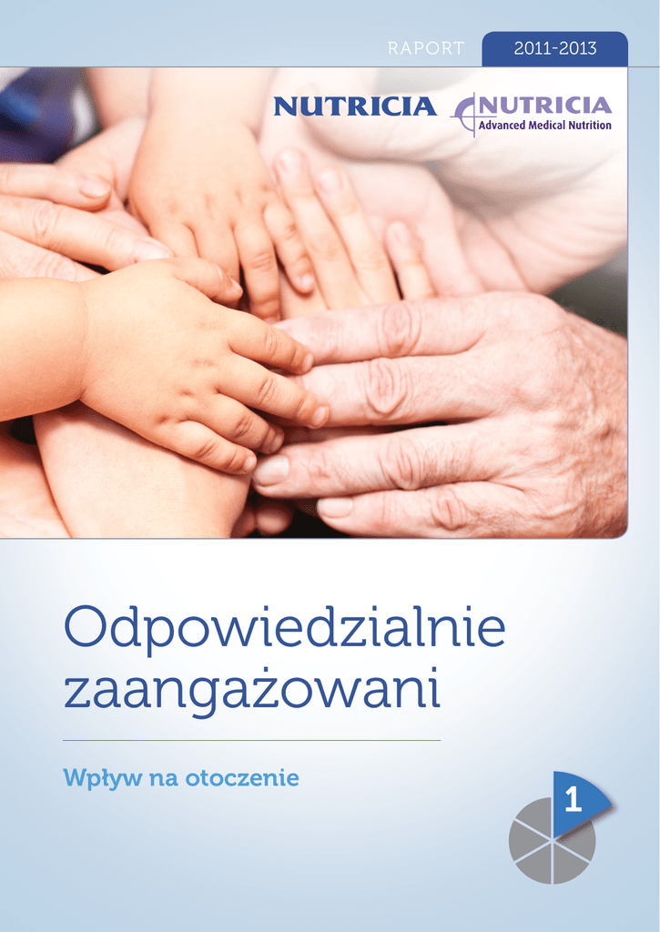 r a p o rt 2011-2013 Odpowiedzialnie zaangażowani Wpływ na otoczenie 1 Wpływ na otoczenie Odpowiedzialnie zaangażowani spis treści Wpływ na otoczenie Misja oparta na odpowiedzialności Blisko naszych interesariuszy Odpowiedzialność NUTRICIA w 6 krokach NUTRICIA w Polsce Produkty NUTRICIA Wpływ na najmłodszych konsumentów Wpływ na jakość życia pacjentów NUTRICIA – część lokalnej społeczności Wielowymiarowe zaangażowanie – podstawa odpowiedzialnego biznesu Etyka wpisana w nasze działania NUTRInews 3 5 6 7 8 9 10 11 12 13 15 Edukacja w trosce o jakość życia Edukacja w trosce o jakość życia 18 Prawidłowe żywienie fundamentem dla zdrowia przyszłych pokoleń 19 Fundacja NUTRICIA – ochrona, promocja i zapewnienie zdrowia poprzez żywienie 20 Dzielimy się wiedzą, wspierając prawidłowe żywienie najmłodszych Wsparcie dla najmłodszych konsumentów i ich rodziców Programy edukacyjne w odpowiedzi na realne potrzeby NUTRICIA dla środowiska medycznego Dywizja Żywności Medycznej NUTRICIA– na rzecz poszerzania wiedzy o żywieniu pacjentów i seniorów NUTRInews 2 22 24 25 26 27 30 Wpływ na otoczenie Misja oparta na odpowiedzialności Nicolaas van Exel Dyrektor Generalny, Dywizja Żywności dla Dzieci NUTRICIA Jako lider rynku żywności dla niemowląt i małych dzieci postawiliśmy sobie za cel wspieranie optymalnego, zdrowego rozwoju dziecka od poczęcia do 3. roku życia. Żywienie we wczesnym okresie życia odgrywa bardzo ważną rolę, a zachodzące w tym okresie programowanie żywieniowe ma decydujące znaczenie dla zdrowia dziecka w przyszłości. Nasza odpowiedzialność to najwyższa jakość produktów i surowców, odpowiadająca, a w wielu przypadkach przewyższająca wymogi prawne i normy przyjęte dla produktów żywnościowych dla dzieci. Dokładamy wszelkich starań, by zapewnić najwyższe standardy bezpieczeństwa w trakcie produkcji, pakowania i transportu naszych wyrobów. Dbamy o dopasowanie naszych produktów do potrzeb żywieniowych najmłodszych dzieci zgodnie z najnowszymi normami i zaleceniami żywieniowymi. Konsekwentnie zmieniamy portfolio naszych produktów, by były one ważnym elementem dobrze zbilansowanej diety maluchów. Jesteśmy przekonani, że nasza odpowiedzialność wykracza poza podstawowe działania biznesowe. Dlatego od 18 lat finansujemy działalność badawczą i edukacyjną Fundacji NUTRICIA. Fundacja wspiera najwyższej jakości badania naukowe w dziedzinie żywienia człowieka, udziela grantów na szkolenia personelu medycznego z zakresu laktacji oraz prowadzi ogólnopolski program edukacji żywieniowej rodziców i opiekunów dzieci od poczęcia do 3. roku życia pt. „1000 pierwszych dni dla zdrowia”, który zrzesza szeroką koalicję partnerów. Kolejnym elementem naszej strategii społecznego zaangażowania jest wyrównywanie szans rozwojowych dzieci z małych miejscowości poprzez realizację programu „Od serca dla dziecka”. Wspólnie z Fundacją Rozwoju Dzieci im. J. A. Komeńskiego, tam gdzie nie ma żłobków i przedszkoli, tworzymy Grupy Zabawowe, w ramach których najmłodsze dzieci poprzez zabawę, w gronie rówieśników, rodziców i animatorek uczą się i rozwijają m.in. umiejętności społeczne. Andrzej Drosik Dyrektor NUTRICIA Zakłady Produkcyjne Odpowiedzialność w NUTRICIA Zakłady Produkcyjne to przede wszystkim świadomość tego, jak duży wpływ mamy na odbiorców naszych produktów. NUTRICIA produkuje rocznie ponad 250 mln sztuk wyrobów, co oznacza, że co najmniej 250 mln razy w ciągu roku nasz produkt jest konsumowany przez niemowlęta lub małe dzieci. Kluczem prowadzenia biznesu w odpowiedzialny sposób jest zapewnienie najwyższej jakości oferowanych produktów oraz zaangażowanie pracowników wrażliwych na potrzeby innych. Jako członek lokalnej społeczności dbamy o otoczenie, w którym prowadzimy działalność. Angażujemy się w pomoc potrzebującym oraz promocję zdrowego i zrównoważonego trybu życia. Planujemy nasze inicjatywy długoterminowo, ponieważ wierzymy, że tylko w ten sposób jesteśmy w stanie osiągnąć widoczne rezultaty. Pragniemy być blisko naszych interesariuszy, dlatego zawsze jesteśmy otwarci na nowe działania, które mogą przyczynić się do poprawy jakości życia naszych konsumentów, klientów oraz społeczności lokalnych. 3 Wpływ na otoczenie Artur Ludwiczak Dyrektor Generalny, Dywizja Żywności Medycznej NutricIa Dyrektor Zarządzający, Nutrimed Odpowiedzialność, w moim przekonaniu, znajduje odzwierciedlenie szczególnie w czterech obszarach działalności firmy. Wysokie standardy. Misją NUTRICIA jest szerzenie w środowisku medycznym świadomości leczenia żywieniowego. Zapewniamy transparentność i wysoki poziom przekazu merytorycznego, dzięki czemu jestem pewny, że nasza działalność opiera się na wysokich standardach. Pacjenci. Tworzymy warunki pracy oraz wpływamy na otoczenie w taki sposób, aby podnosić jakość życia Pacjentów, a czasami nawet ratować ich życie. Przykładem narzędzi wykorzystywanych w realizacji tych zobowiązań jest m.in. serwis dla Pacjentów czy kontrola jakości produktów. Pracownicy. Kształtujemy przyjazne środowisko pracy, które zapewnia Pracownikom zarówno możliwość wykonywania swoich codziennych obowiązków, jak i realizowania własnych pasji i rozwijania siebie. Rozwój. Jako Dyrektor Generalny jestem odpowiedzialny za nadawanie kierunku rozwoju i ustalanie priorytetów biznesowych NUTRICIA. Dzięki temu mogę wpływać na wartość organizacji oraz rozszerzać rolę, jaką odgrywa w społeczeństwie. Dorota Pawłowska Dyrektor Operacyjna, Nutrimed Jesteśmy ekspertem w zakresie żywienia dojelitowego w warunkach domowych, mamy w tym obszarze wieloletnie doświadczenie. Dlatego odpowiedzialność w Nutrimed rozumiemy przede wszystkim jako dostarczanie pacjentom najwyższej jakości usług przy uwzględnieniu ich specyficznych potrzeb żywieniowych. Nasza codzienna 
