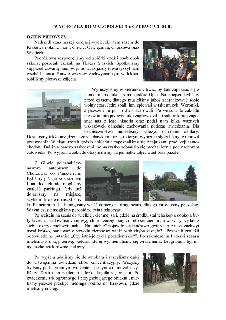 WYCIECZKA DO MAŁOPOLSKI 3-6 CZERWCA 2004 R. DZIEŃ PIERWSZY Nadszedł czas naszej kolejnej wycieczki, tym razem do Krakowa i okolic m.in., Gliwic, Oświęcimia, Chorzowa oraz Wieliczki PodróŜ swą rozpoczęliśmy od zbiórki części osób obok szkoły, pozostali czekali na Tkaczy Śląskich. Spotkaliśmy się przed czwartą rano, więc podczas jazdy towarzyszył nam wschód słońca. Prawie wszyscy zachwyceni tym widokiem robiliśmy pierwsze zdjęcia. Wyruszyliśmy w kierunku Gliwic, by tam zapoznać się z tajnikami produkcji samochodów Opla. Na miejscu byliśmy przed czasem, dlatego musieliśmy jakoś zorganizować sobie wolny czas. Jedni spali, inni śpiewali w takt muzyki Weroniki, a jeszcze inni po prostu spacerowali. Po wejściu do zakładu przywitał nas przewodnik i zaprowadził do sali, w której zapoznał nas z jego historią oraz podał nam kilka waŜnych wskazówek odnośnie zachowania podczas zwiedzania. Dla bezpieczeństwa musieliśmy załoŜyć ochronne okulary. Dostaliśmy takŜe urządzenia ze słuchawkami, dzięki którym wyraźnie słyszeliśmy, co mówił przewodnik. W ciągu trzech godzin dokładnie zapoznaliśmy się z tajnikami produkcji samochodów. Byliśmy bardzo zaskoczeni, bo wszystko odbywało się mechanicznie pod nadzorem człowieka. Po wyjściu z zakładu otrzymaliśmy na pamiątkę zdjęcia aut oraz puzzle. Z Gliwic pojechaliśmy naszym autobusem do Chorzowa, do Planetarium. Byliśmy juŜ grubo spóźnieni i na dodatek nie mogliśmy znaleźć parkingu. Gdy juŜ dotarliśmy na miejsce, szybkim krokiem ruszyliśmy ku Planetarium. I tak mogliśmy wejść dopiero na drugi seans, dlatego musieliśmy poczekać. W tym czasie mogliśmy porobić zdjęcia i odpocząć. Po wejściu na seans do wielkiej, ciemnej sali, gdzie na środku stał teleskop a dookoła były krzesła, usadowiliśmy się wygodnie i zaczęło się, zrobiło się ciemno, a wszyscy wydali z siebie okrzyk zachwytu aah ... Na „niebie” pojawiło się mnóstwo gwiazd. Ale nasz zachwyt trwał krótko, poniewaŜ z powodu ciemności wiele osób chyba zasnęło?!. Pozostali znaleźli odpowiedź na pytanie: „Czy istnieje Ŝycie pozaziemskie?”. Po zakończeniu I części seansu mieliśmy krótką przerwę, podczas której wymienialiśmy się wraŜeniami. Drugi seans był inny, aczkolwiek równie ciekawy. Po wyjściu udaliśmy się do autokaru i ruszyliśmy dalej do Oświęcimia zwiedzać obóz koncentracyjny. Wszyscy byliśmy pod ogromnym wraŜeniem po tym co tam zobaczyliśmy. Dech nam zapierało i łezka kręciła się w oku. Po zwiedzeniu tak ogromnego i przygnębiającego obiektu , mieliśmy jeszcze przebyć niedługą podróŜ do Krakowa, gdzie mieliśmy nocleg. Niestety, pokoje nie były takie jak się spodziewaliśmy. Wiele osób sprawdzało wcześniej w Internecie wygląd, warunki i połoŜenie naszego hotelu – niestety to co zastaliśmy na miejscu było całkiem odmienne. Dziewczyny koniecznie chciały spać w szóstkę, więc z dwóch pokoi zrobiliśmy jedną sypialnię, a w drugim zrobiliśmy pokój „zwierzeń”, gdzie odbywały się zebrania oraz „wieczorne imprezki”. DZIEŃ DRUGI Kolejny dzień naszej podróŜy rozpoczęliśmy od pysznego śniadania w mrocznych podziemiach naszego Hotelu. Około godziny 900 wyruszyliśmy do Wieliczki. Przed wejściem musieliśmy trochę poczekać, ale ten czas spędziliśmy miło na opalaniu się i zwiedzaniu okolicy. Wreszcie nadeszła nasza kolej i ruszyliśmy do podziemi wielkiej kopalni soli pokonując ogromną ilość schodów. Cały obchód trwał trzy godziny. Przez ten czas mogliśmy podziwiać podziemne korytarze i wielkie „słone” sale. Jedną z nich była wielka sala balowa, w której gościł nasz PapieŜ Jan Paweł II, odbywają się w niej równieŜ wesela. Zrobiliśmy sobie tutaj grupowe zdjęcie. Po męczącym zwiedzaniu kopalni soli wyruszyliśmy autobusem do Kalwarii Zebrzydowskiej, gdzie zwiedzaliśmy z Franciszkaninem Bratem Sebastianem klasztor. Oprowadzał on nas po raz pierwszy, więc miał z tym pewne problemy, ale miał bardzo przyjazny charakter i miły głos, dlatego teŜ, chociaŜ byliśmy bardzo zmęczeni zainteresował nas swoim opowiadaniem. Wygłodzeni i zmęczeni ruszyliśmy z powrotem do Hotelu „Trzy Kafki”, gdzie czekały na nas frytki i kurczak - obiad był pyszny. Potem wszyscy udali się do „pokoju zwierzeń” na omówienie dalszego planu dnia. Po wielu sporach doszliśmy do wniosku, Ŝe część osób pójdzie na basen, a pozostali na wieczorny spacer po krakowskim Rynku, natomiast jutrzejsze popołudnie spędzimy w kinie. Z wielu moŜliwych do obejrzenia filmów wybraliśmy trzy, tj. „Van Helsing”, „Pojutrze” i „Harry Potter i Więzień Azkabanu”. Wieczorem (jedni po basenie inni po spacerach) spotkaliśmy się w „pokoju zwierzeń”, była gitara, śpiew i taniec – miło wspominamy ten wieczór do dzisiaj. DZIEŃ TRZECI Po wczorajszym męczącym dniu cięŜko było zerwać się z naszych „wygodnych” lóŜek. Gdy pokonaliśmy jednak naszą niemoc, Ŝwawo ruszyliśmy na śniadanie. Po posiłku Pan Mader zapowiedział, Ŝe znów czeka nas cięŜki i męczący dzień. Dzisiaj czekało nas zwiedzanie Wawelu i Drogi Królewskiej. Oprowadzała nas pani przewodnik, która przekazała nam wiele cennych informacji. Po zwiedzaniu ruszyliśmy Drogą Królewską zwiedzać Sukiennice. Po przybyciu na miejsce dowiedzieliśmy się, Ŝe krakowski Rynek jest jednym z największych w Europie. Poszliśmy do Kościoła Mariackiego i usłyszeliśmy ciekawą historię o powstaniu ołtarza Wita Stwosza. Następnie mieliśmy czas wolny – ruszyliśmy do Sukiennic wybierać bursztynowe i nie tylko pamiątki. Po udanych zakupach (cali mokrzy od deszczu) udaliśmy się na obiadokolację (pieszo, nie doroŜką). Znowu podali nam frytki i mięsko. Następnie w planach mieliśmy kino. Nieopodal w multikinie, rozkoszując się jego atmosferą udaliśmy się na wybrane filmy. DZIEŃ CZWARTY (I OSTAT