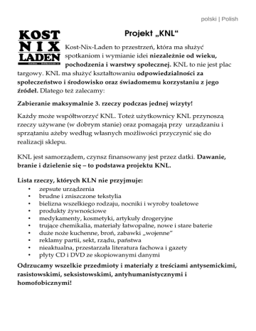 polski | Polish Projekt „KNL“ KostNixLaden to przestrzeń, która ma służyć spotkaniom i wymianie idei niezależnie od wieku, pochodzenia i warstwy społecznej. KNL to nie jest plac targowy. KNL ma służyć kształtowaniu odpowiedzialności za społeczeństwo i środowisko oraz świadomemu korzystaniu z jego źródeł. Dlatego też zalecamy: Zabieranie maksymalnie 3. rzeczy podczas jednej wizyty! Każdy może współtworzyć KNL. Toteż użytkownicy KNL przynoszą rzeczy używane (w dobrym stanie) oraz pomagają przy urządzaniu i sprzątaniu ażeby według własnych możliwości przyczynić się do realizacji sklepu. KNL jest samorządem, czynsz finansowany jest przez datki. Dawanie, branie i dzielenie się – to podstawa projektu KNL. Lista rzeczy, których KLN nie przyjmuje: • zepsute urządzenia • brudne i zniszczone tekstylia • bielizna wszelkiego rodzaju, nocniki i wyroby toaletowe • produkty żywnościowe • medykamenty, kosmetyki, artykuły drogeryjne • trujące chemikalia, materiały łatwopalne, nowe i stare baterie • duże noże kuchenne, broń, zabawki „wojenne” • reklamy partii, sekt, rządu, państwa • nieaktualna, przestarzała literatura fachowa i gazety • płyty CD i DVD ze skopiowanymi danymi Odrzucamy wszelkie przedmioty i materiały z treściami antysemickimi, rasistowskimi, seksistowskimi, antyhumanistycznymi i homofobicznymi!