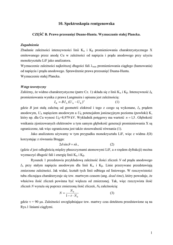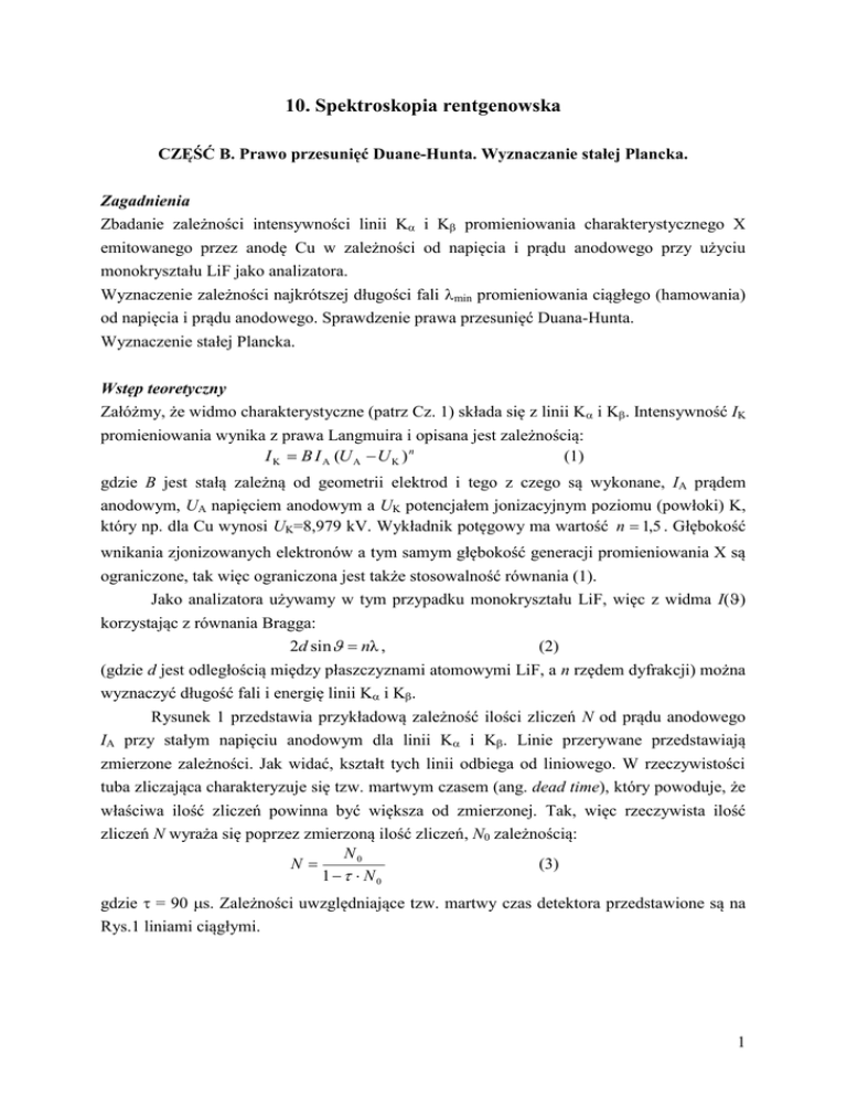 10. Spektroskopia rentgenowska CZĘŚĆ B. Prawo przesunięć Duane-Hunta. Wyznaczanie stałej Plancka. Zagadnienia Zbadanie zależności intensywności linii K i K promieniowania charakterystycznego X emitowanego przez anodę Cu w zależności od napięcia i prądu anodowego przy użyciu monokryształu LiF jako analizatora. Wyznaczenie zależności najkrótszej długości fali min promieniowania ciągłego (hamowania) od napięcia i prądu anodowego. Sprawdzenie prawa przesunięć Duana-Hunta. Wyznaczenie stałej Plancka. Wstęp teoretyczny Załóżmy, że widmo charakterystyczne (patrz Cz. 1) składa się z linii K i K. Intensywność IK promieniowania wynika z prawa Langmuira i opisana jest zależnością: (1) I K B I A (U A U K ) n gdzie B jest stałą zależną od geometrii elektrod i tego z czego są wykonane, IA prądem anodowym, UA napięciem anodowym a UK potencjałem jonizacyjnym poziomu (powłoki) K, który np. dla Cu wynosi UK=8,979 kV. Wykładnik potęgowy ma wartość n 1,5 . Głębokość wnikania zjonizowanych elektronów a tym samym głębokość generacji promieniowania X są ograniczone, tak więc ograniczona jest także stosowalność równania (1). Jako analizatora używamy w tym przypadku monokryształu LiF, więc z widma I() korzystając z równania Bragga: (2) 2d sin nλ , (gdzie d jest odległością między płaszczyznami atomowymi LiF, a n rzędem dyfrakcji) można wyznaczyć długość fali i energię linii K i K. Rysunek 1 przedstawia przykładową zależność ilości zliczeń N od prądu anodowego IA przy stałym napięciu anodowym dla linii K i K. Linie przerywane przedstawiają zmierzone zależności. Jak widać, kształt tych linii odbiega od liniowego. W rzeczywistości tuba zliczająca charakteryzuje się tzw. martwym czasem (ang. dead time), który powoduje, że właściwa ilość zliczeń powinna być większa od zmierzonej. Tak, więc rzeczywista ilość zliczeń N wyraża się poprzez zmierzoną ilość zliczeń, N0 zależnością: N0 N (3) 1 N0 gdzie = 90 s. Zależności uwzględniające tzw. martwy czas detektora przedstawione są na Rys.1 liniami ciągłymi. 1 Rys. 1. Intensywności linii K i K. w funkcji prądu anodowego przy stałym napieciu anodowym, z uwzględnieniem (linie ciągłe) i bez uwzględnienia tzw. martwego czasu detektora. Elektrony, których źródłem jest katoda, zwalniając emitują ciągłe promieniowanie elektromagnetyczne (patrz Cz. 1). Niektóre z elektronów zamieniają swą energię kinetyczną w promieniowanie elektromagnetyczne w pojedynczym procesie, wytwarzając promieniowanie, które stanowi minimalną długość fali min wypromieniowaną w danych warunkach. W 1915 Duane i Hunt odkryli empiryczne prawo, mówiące, że iloczyn napiecia anodowego i minimalnej długości fali jest stały, czyli U A min const . (4) Zależność ta może w prosty sposób zostać wyprowadzona z równania Einsteina: c . (5) E kin e U A h f max h min Przekształcając powyższe równanie dostajemy 1 min 1,2398 10 6 Vm. UA (6) Wykreślając, więc zależność min(1/UA) powinniśmy otrzymać linię prostą. Korzystają z równania (5) i (2) można napisać, że 2 sin min hc 1 . 2ed UA (7) Tak, więc i dla zależności sin min(1/UA) powinniśmy otrzymać linię prostą. Z zależności sin min(1/UA) możemy także wyznaczyć wartość stałej Plancka. Licznik Geigera-Müllera Jest to urządzenie opracowane przez H. Geigera i W. Müllera w 1928 roku, służące do detekcji wysokoenergetycznego promieniowania. Zbudowany jest z rury metalowej (z aluminium) – Rys. 2, która stanowi elektrodę ujemną – katodę. Przez środek rury katody przebiega cienki drut stanowiący elektrodę dodatnią. Rura wypełniona jest mieszaniną gazów: ok. 90 % gazu szlachetnego (np. argonu) i ok. 10 % par alkoholu. metalowa tuba wypełniona gazem katoda metalowy drut - anoda okienko wysokie napięcie Rys. 2 Schemat licznika G-M. Kiedy promieniowanie X wpada do tuby jonizuje cząsteczki gazu wytwarzając dodatnio naładowane jony i swobodne elektrony. Poprzez przyłożone napięcie elektrony przyspieszane są w kierunku dodatnio spolaryzowanego drutu po drodze zyskując wystarczającą energię do jonizacji kolejnych cząsteczek gazu – zwielokrotniając liczbę elektronów docierających do anody (drutu). Powoduje to przepływ prądu pomiędzy licznikiem (drutem) a tubą. Z wykorzystaniem opornika R można zamienić prąd na sygnał napięciowy. Sygnał napięciowy jest elektronicznie wzmacniany. Zadania do wykonania 1. Zmierzyć zależności intensywności N promieniowania X od kąta Bragga dla lampy rentgenowskiej z anodą Cu w zadanym przedziale dla monokryształu analizującego LiF w zależności od prądu anodowego (przy stałym napięciu anodowym) i w zależności od napięcia anodowego (przy stałym prądzie anodowym). 2. Odczytać z wykresów N() intensywności (ilość zliczeń na sekundę) dla linii K i K. Wykreślić zależności N(IA) dla wartości zmierzonych i wartości skorygowanych (z uwzględnieniem martwego czasu detektora – równanie (3)) dla linii K i K. Znaleźć właściwą wartość martwego czasu detektora (np. poprzez najlepsze przybliżenie do linii prostej). Porównać otrzymane zależności. 3 3. Wykreślić zależności ilości zliczeń N w funkcji (UA-UK)1,5 dla wartości zmierzonych i wartości skorygowanych (z uwzg. martwego czasu detektora) dla linii K i K. 4. Z wykresów N() odczytać wartości min i korzystając z zależności (2) wyznaczyć min. 5. Wykreślić zależność min(1/UA). Sprawdzić prawo przesunięć Duane-Hunta. 6. Wykreślić zależność sin min(1/UA). Korzystając z regresji liniowej i równania (7) wyznaczyć stałą Plancka. Przeprowadzić rachunek błędów. Porównać otrzymany wynik z wartością tablicową. Parametry pomiarów - zamocować moduł z anodą Cu - zamocować przesłonę o średnicy 1 mm na wyjściu promieniowania X: - ustawić goniometr w pozycji pośredniej (wskaźnik na pozycji 4) - na