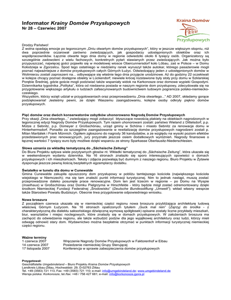 Informator Krainy Domów Przysłupowych Nr 28 – Czerwiec 2007 Drodzy Państwo! Z wolna opadają emocje po tegorocznym „Dniu otwartym domów przysłupowych”, który w jeszcze większym stopniu, niż dwa poprzednie oczarował zarówno zwiedzających, jak gospodarzy udostępnionych obiektów oraz ich współpracowników. Łącznie otwarte tego dnia domy w regionie odwiedziło około 6 tysięcy osób. Organizatorzy są szczególnie zadowoleni z wielu fachowych, konkretnych pytań stawianych przez zwiedzających. Jak można było przypuszczać, najwięcej gości pojawiło się w modelowej wiosce Obercunnersdorf koło Löbau, zaś w Polsce – w Domu Kołodzieja w Zgorzelcu. Spod tego ostatniego w niedzielny ranek wyruszył także autokar, którego pasażerowie mogli poznać najważniejsze z domów przysłupowych całych Górnych Łużyc. Odwiedzający jeden z udostępnionych domów w Wolimierzu zostali zaproszeni na... odbywające się właśnie tego dnia przyjęcie urodzinowe. Aż do godziny 22 oczekiwali w kolejce chcący poznać dostępne obiekty w Lückendorf; niewiele krócej rozstawione były stoły przy domu w Szklarskiej Porębie Średniej, gdzie goście mogli podziwiać także wspaniały widok na Karkonosze oraz domowe wypieki Gospodyni. Dziennikarka tygodnika „Polityka”, która od niedawna posiada w naszym regionie dom przysłupowy, zdecydowała się na przygotowanie większego artykułu o ludziach zafascynowanych budownictwem ludowym pogranicza polsko-niemieckoczeskiego. Wszystkim, którzy wzięli udział w przygotowaniach oraz przeprowadzeniu „Dnia otwartego...” AD 2007, składamy gorące podziękowania! Jesteśmy pewni, ze dzięki Waszemu zaangażowaniu, kolejne osoby odkryły piękno domów przysłupowych. Pięć domów oraz dwóch konserwatorów zabytków uhonorowano Nagrodą Domów Przysłupowych Przy okazji „Dnia otwartego...” zwiedzający mogli zobaczyć błyszczące nowością plakiety na obiektach nagrodzonych w tegorocznej edycji Nagrody Domów Przysłupowych. Tym razem uhonorowani zostali: państwo Wieland z Dittelsdorf, p.p. Mütze z Sebnitz, p.p. Domeyer z Großschönau, urząd gminy w Schöna i miasto Sebnitz za renowacje domu w Hinterhermsdorf. Ponadto za szczególne zaangażowanie w rewitalizację domów przysłupowych nagrodzeni zostali p. Milan Maršálek i Frank Münnich. Ogółem zgłoszono do nagrody 36 kandydatów, a ze względu na wysoki poziom efektów przedstawionych prac renowacyjnych, jury przyznało jeszcze osiem dodatkowych wyróżnień. Nagrody finansowe o łącznej wartości 7 tysięcy euro były możliwe dzięki wsparciu ze strony Sparkasse Oberlausitz-Niederschlesien. Słowa uznania za wkładkę tematyczną do „Sächsische Zeitung” Do Biura Projektu spływa wiele pozytywnych głosów nt. Wkładki tematycznej do „Sächsische Zeitung”, która ukazała się w weekendowym wydaniu dziennika. Na 16 stronach znalazło się sporo interesujących opowieści o domach przysłupowych i ich mieszkańcach. Teksty i zdjęcia pozwalają być dumnym z naszego regionu. Biuro Projektu w Żytawie dysponuje jeszcze pewną ilością bezpłatnych egzemplarzy dodatku. Światełko w tunelu dla domu w Cunewalde Gmina Cunewalde zakupiła opuszczony dom przysłupowy w pobliżu tamtejszego kościoła (największego kościoła wiejskiego w Niemczech); ma się tam znaleźć punkt informacji turystycznej. Nim to jednak nastąpi, muszą zostać przeprowadzone daleko posunięte prace renowacyjne. Dom ten jest trzecim w regionie – po Domu na Wyspie (Inselhaus) w Großschönau oraz Domku Pielgrzyma w Hirschfelde - który będzie mógł zostać odremontowany dzięki środkom Niemieckiej Fundacji Federalnej „Środowisko” (Deutsche Bundesstiftung „Umwelt”); wkład własny wesprze także Starostwo Powiatu Budziszyn. Obecnie trwa przygotowanie odpowiedniego wniosku. Nowa broszura Z początkiem czerwca ukazała się w niemieckiej części regionu nowa broszura przybliżająca architekturę ludową właściwą Górnym Łużycom. Na 16 stronach opatrzonych tytułem „Guck mal rein” (Zajrzyj do środka - z charakterystyczną dla dialektu saksońskiego dźwięczną wymową spółgłosek) opisane zostały liczne przykłady mieszkań, biur, warsztatów i miejsc noclegowych, które znalazły się w domach przysłupowych. W założeniach broszura ma zachęcić do odwiedzenia regionu, ale także wzbudzić podziw dla jego wyjątkowej architektury oraz ludzi, którzy mieli odwagę odnowić stary dom. Wydawnictwo można bezpłatnie otrzymać w punktach informacji turystycznej niemieckiej części regionu. Ważne terminy 1 czerwca 2007 14 czerwca 2007 17 listopada 2007 Wręczenie Nagrody Domów Przysłupowych w Faktorenhof w Eibau Posiedzenie niemieckiej Grupy Sterującej Konferencja w sprawie zabezpieczenia domów przysłupowych Przygotował: Geschäftstelle Umgebindeland – Biuro Projektu Kraina Domów Przysłupowych Landkreis Löbau-Zittau, Hochwaldstr. 29, D-02763 Zittau Tel. +49 (3583) 721 113, Fax: +49 (3583) 721 110; e-mail: [email protected]; www.umgebindeland.de Wersja polska: Korkonosze, tel./fax: +48 / 756 427 681; e-mail: [email protected]