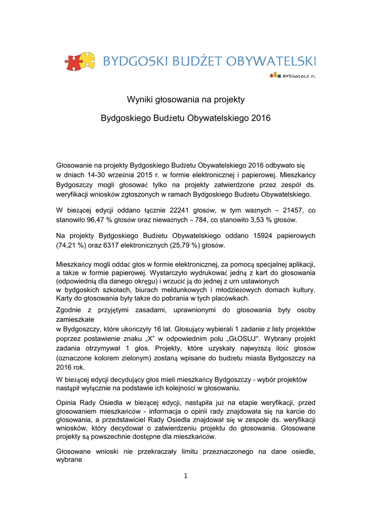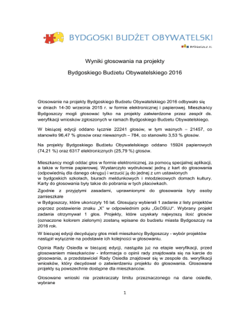 Wyniki głosowania na projekty Bydgoskiego Budżetu Obywatelskiego 2016 Głosowanie na projekty Bydgoskiego Budżetu Obywatelskiego 2016 odbywało się w dniach 14-30 września 2015 r. w formie elektronicznej i papierowej. Mieszkańcy Bydgoszczy mogli głosować tylko na projekty zatwierdzone przez zespół ds. weryfikacji wniosków zgłoszonych w ramach Bydgoskiego Budżetu Obywatelskiego. W bieżącej edycji oddano łącznie 22241 głosów, w tym ważnych – 21457, co stanowiło 96,47 % głosów oraz nieważnych – 784, co stanowiło 3,53 % głosów. Na projekty Bydgoskiego Budżetu Obywatelskiego oddano 15924 papierowych (74,21 %) oraz 6317 elektronicznych (25,79 %) głosów. Mieszkańcy mogli oddać głos w formie elektronicznej, za pomocą specjalnej aplikacji, a także w formie papierowej. Wystarczyło wydrukować jedną z kart do głosowania (odpowiednią dla danego okręgu) i wrzucić ją do jednej z urn ustawionych w bydgoskich szkołach, biurach meldunkowych i młodzieżowych domach kultury. Karty do głosowania były także do pobrania w tych placówkach. Zgodnie z przyjętymi zasadami, uprawnionymi do głosowania były osoby zamieszkałe w Bydgoszczy, które ukończyły 16 lat. Głosujący wybierali 1 zadanie z listy projektów poprzez postawienie znaku „X” w odpowiednim polu „GŁOSUJ”. Wybrany projekt zadania otrzymywał 1 głos. Projekty, które uzyskały najwyższą ilość głosów (oznaczone kolorem zielonym) zostaną wpisane do budżetu miasta Bydgoszczy na 2016 rok. W bieżącej edycji decydujący głos mieli mieszkańcy Bydgoszczy - wybór projektów nastąpił wyłącznie na podstawie ich kolejności w głosowaniu. Opinia Rady Osiedla w bieżącej edycji, nastąpiła już na etapie weryfikacji, przed głosowaniem mieszkańców - informacja o opinii rady znajdowała się na karcie do głosowania, a przedstawiciel Rady Osiedla znajdował się w zespole ds. weryfikacji wniosków, który decydował o zatwierdzeniu projektu do głosowania. Głosowane projekty są powszechnie dostępne dla mieszkańców. Głosowane wnioski nie przekraczały limitu przeznaczonego na dane osiedle, wybrane 1 w głosowaniu do realizacji kolejne wnioski nie mogą przekraczać limitu środków przeznaczonych na dane osiedle. Zwycięskie projekty oznaczone kolorem zielonym, zostaną wprowadzone do projektu budżetu miasta na 2016 rok. W przypadku przekroczenia środków przeznaczonych na teren danego osiedla (z powodu wyższej od szacowanej kwoty po przetargu lub niemożliwych do przewidzenia robót dodatkowych) zmniejsza się pulę środków w kolejnym roku o kwotę przekroczenia. Projekty oznaczone kolorem niebieskim zostaną wprowadzone do projektu budżetu miasta na 2016 rok, w przypadku ewentualnej możliwej korekty wniosku, w celu dostosowania projektu do limitu środków przeznaczonych na osiedle. Projekty oznaczone kolorem czerwonym, nie zostaną wprowadzone do projektu budżetu miasta na 2016 rok. Liczba głosów ogółem oddanych na projekty Bydgoskiego Budżetu Obywatelskiego 2016 Liczba Liczba Okręg nr Liczba wszystkich głosów głosów głosów ważnych nieważnych 1 5166 217 5383 2 3722 148 3870 3 2635 108 2743 4 3239 84 3323 5 2679 86 2765 6 4016 141 4157 Razem 21457 784 22241 W trakcie zliczania głosów przyczynami uznania głosów za nieważne były: niewłaściwy numer PESEL, brak ukończenia przez głosującego szesnastu lat, wielokrotne użycie jednego numeru PESEL. Liczba głosów ogółem z podziałem na elektroniczne i papierowe, oddane na projekty Bydgoskiego Budżetu Obywatelskiego 2016 Okręg nr Elektroniczne Papierowe Liczba wszystkich głosów 1 1362 4021 5383 2 1017 2853 3870 3 1086 1657 2743 4 956 2367 3323 5 849 1916 2765 6 1047 3110 4157 Razem 6317 15924 22241 Podział osób głosujących ze względu na płeć (głosy ważne) Okręg nr Kobiety Mężczyźni Liczba wszystkich głosów 2833 2333 5166 1608 3722 1547 1088 2635 1820 1419 3239 1556 1123 2679 1 2 2114 2 3 4 5 Struktura wiekowa osób głosujących Okręg 1 2 3 4 5 6 Raze m 16-20 21-25 26-30 31-35 36-40 41-45 46-50 51-55 56-60 61-65 66-70 71-75 649 503 623 666 596 469 287 305 381 295 200 77 66 49 5166 279 241 429 437 370 263 227 215 285 256 261 167 126 166 3722 252 153 305 439 339 213 112 156 232 219 137 36 21 21 2635 255 296 424 481 405 260 202 166 193 191 130 85 84 67 3239 205 214 328 420 333 233 180 142 179 169 111 56 47 62 2679 283 1923 258 1665 471 2580 481 2924 461 2504 365 1803 256 1264 225 1209 274 1544 294 1424 281 1120 159 580 120 464 88 453 4016 21457 3 76-80 81- razem Wyniki na poszczególne projekty Bydgoskiego Budżetu Obywatelskiego z podziałem na osiedla: 7 523 mieszkańców Czyżkówko Numer 1OK/0081 Tytuł Koszt SUMA Rozbudowa istniejącego placu zabaw dla dzieci z elementami plenerowej siłowni dla dorosłych 1OK/0239 Budowa chodników 1OK/0115 Zielony punkt Czyżkówka 112000,00 112450,00 30000,00 Lokalizacja u zbiegu ulic: Chmielna Siedlecka Byszewska pozytywna ul. Wiejska, ul. Karolewska pozytywna ul. Wiejska pomiędzy nr 21 i 23 pozytywna Tytuł SUMA Doposażenie placu zabaw 1OK/0013 przy ul. Bronikowskieg o Doposażenie placu zabaw w Parku nad 1OK/0103 Kanałem przy ulicy Mińskiej Flisy Koszt 23737,00 23737,00 Elektroniczne Papierowe 183 132 Liczba wszystkich głosów 315 109 64 173 37 53 90 37 15 52 1 588 mieszkańców Flisy numer Opinia rady osiedla Lokalizacja ul. Bronikowskie go Park nad Kanałem przy ulicy Mińskiej Opinia rady osiedla pozytywna negatywna 4 23 737 zł Elektroniczne Papierowe 19 1 Liczba wszystkich głosów 20 12 1 13 7 0 7 11 830 mieszkańców Miedzyń - Prądy 112 450 zł 176 829 zł Numer Tytuł Koszt Lokalizacja 176000,00 ulice: Paprocia, Tragerów, Sicieńska, Zasobna, Warzywna Opinia rady osiedla SUMA 1OK/0015 Oświetlenie ulic Budowa chodnika między ulicami 1OK/0253 Nakielską a Jędrzejowską – 50 m. Budowa 1OK/0006 chodnika 1OK/0020 Skatepark 12000,00 20000,00 176000,00 ul. Nakielska, ul. Jędrzejowska pozytywna ul. Pijarów pozytywna Te