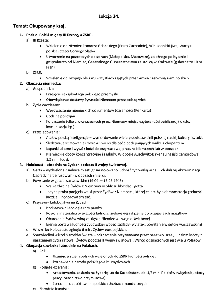 Lekcja 24. Temat: Okupowany kraj. 1. Podział Polski między III Rzeszę, a ZSRR. a) III Rzesza: Wcielenie do Niemiec Pomorza Gdańskiego (Prusy Zachodnie), Wielkopolski (Kraj Warty) i polskiej części Górnego Śląska Utworzenie na pozostałych obszarach (Małopolska, Mazowsze), zależnego politycznie i gospodarczo od Niemiec, Generalnego Gubernatorstwa ze stolicą w Krakowie (gubernator Hans Frank) b) ZSRR: Wcielenie do swojego obszaru wszystkich zajętych przez Armię Czerwoną ziem polskich. 2. Okupacja niemiecka: a) Gospodarka: Przejęcie i eksploatacja polskiego przemysłu Obowiązkowe dostawy żywności Niemcom przez polską wieś. b) Życie codzienne: Wprowadzenie niemieckich dokumentów tożsamości (Kenkarta) Godzina policyjna Korzystanie tylko z wyznaczonych przez Niemców miejsc użyteczności publicznej (lokale, komunikacja itp.) c) Prześladowania: Atak w polską inteligencję – wymordowanie wielu przedstawicieli polskiej nauki, kultury i sztuki. Śledztwa, aresztowania i wyroki śmierci dla osób podejmujących walkę z okupantem Łapanki uliczne i wywóz ludzi do przymusowej pracy w Niemczech lub w obozach Niemieckie obozy koncentracyjne i zagłady. W obozie Auschwitz-Birkenau naziści zamordowali 1.5 mln. ludzi. 3. Holokaust – zbrodnia na Żydach podczas II wojny światowej. a) Getta – wydzielone dzielnice miast, gdzie izolowano ludność żydowską w celu ich dalszej eksterminacji (zagłady na tle rasowym) w obozach śmierci. b) Powstanie w getcie warszawskim (19.04. – 16.05.1943) Walka zbrojna Żydów z Niemcami w obliczu likwidacji getta Jedyna próba podjęcia walki przez Żydów z Niemcami, której celem była demonstracja godności ludzkiej i honorowa śmierć. c) Przyczyny ludobójstwa na Żydach. Nazistowska ideologia rasy panów Pozycja materialna większości ludności żydowskiej i dążenie do przejęcia ich majątków Obarczanie Żydów winą za klęskę Niemiec w I wojnie światowej Bierna postawa ludności żydowskiej wobec zagłady (wyjątek: powstanie w getcie warszawskim) d) W wyniku Holocaustu zginęło 6 mln. Żydów europejskich. e) Sprawiedliwi wśród Narodów Świata – odznaczenie przyznawane przez państwo Izrael, ludziom którzy z narażeniem życia ratowali Żydów podczas II wojny światowej. Wśród odznaczonych jest wielu Polaków. 4. Okupacja sowiecka i zbrodnie na Polakach. a) Cel: Usunięcie z ziem polskich wcielonych do ZSRR ludności polskiej. Pozbawienie narodu polskiego elit umysłowych. b) Podjęte działania: Aresztowania, zesłania na Syberię lub do Kazachstanu ok. 1,7 mln. Polaków (więzienia, obozy pracy, osadnictwo przymusowe) Zbrodnie ludobójstwa na polskich służbach mundurowych. c) Zbrodnia katyńska. IX – X. 1939 - osadzenie ok. 15 tysięcy polskich oficerów wziętych do niewoli w kampanii wrześniowej w obozach w Kozielsku, Ostaszkowie i Starobielsku. IV – V 1940 – zamordowanie większości osadzonych oficerów w Katyniu, Piatichatkach i Miednoje. Propaganda ZSRR przez niemal cały okres istnienia tego państwa, winą za zbrodnie obarczała Niemców.