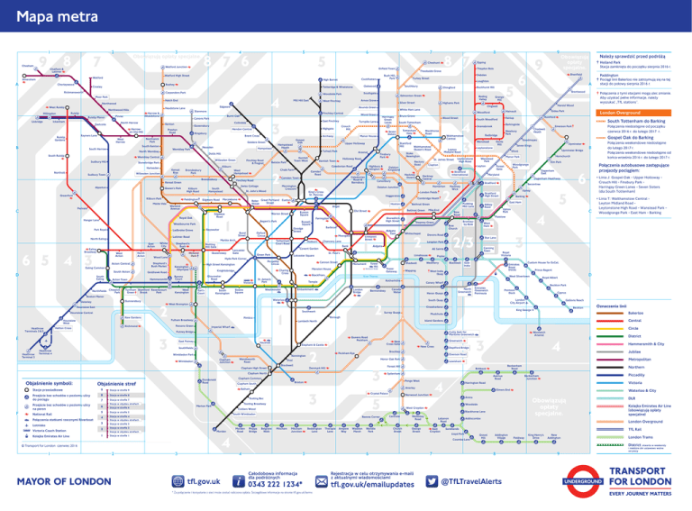 Mapa metra Chesham A 9 1 8 2 7 Chalfont & Latimer 3 Obowiązują opłaty specjalne. Watford Junction Chorleywood Northwood Ruislip Kenton Harrowon-the-Hill Rayners Lane Ruislip Gardens Golders Green South Kenton South Harrow Neasden Wembley Park North Wembley South Ruislip Willesden Green Stonebridge Park Harlesden Kensal Rise Willesden Junction Sudbury Town Kilburn Brondesbury Park Queen’s Park Greenford Kilburn Park Maida Vale Perivale C Kilburn High Road Paddington Latimer Road East Acton Ealing Broadway 6 5 4 3 North Acton West Acton Acton Central Ealing Common D South Acton South Ealing Acton Town Northfields Chiswick Park Boston Manor Hounslow East Hounslow Central Kew Gardens Hounslow West Queensway Earl’s Court South Kensington Liverpool Street 1 Chancery Lane Bank St. Paul’s Leicester Square Cannon Street Monument Mansion House Blackfriars London Bridge 2 Parsons Green Southwark Imperial Wharf Borough Lambeth North 3 Heathrow Terminal 4 East Putney Wimbledon Park Clapham Junction Kennington Wandsworth Road Oval Clapham High Street Stockwell 2 Blackwall 3 Objaśnienie symboli: Objaśnienie stref Stacje przesiadkowe 9 Stacja w strefie 9 Przejście bez schodów z poziomu ulicy do pociągu 8 Stacja w strefie 8 Przejście bez schodów z poziomu ulicy na peron National Rail Połączenia statkami rzecznymi Riverboat Lotnisko Victoria Coach Station Kolejka Emirates Air Line 7 6 North Greenwich Heron Quays 4 Stacja w strefie 4 Stacja w obydwu strefach 3 Tooting Broadway Merton Park Stacja w strefie 6 Colliers Wood Surrey Quays Stacja w strefie 2 Stacja w obydwu strefach 1 Stacja w strefie 1 Morden Transport for London czerwiec 2016 1 MAYOR OF LONDON 2 3 4 Morden Road Phipps Bridge Belgrave Walk Mitcham Mitcham Junction Beddington Lane Therapia Lane Ampere Way Waddon Marsh Wandle Park 5 Całodobowa informacja dla podróżnych * Za połączenie i korzystanie z sieci może zostać naliczona opłata. Szczegółowe informacje na stronie tfl.gov.uk/terms Gallions Reach Oznaczenia linii Beckton King George V Bakerloo Central Greenwich New Cross Deptford Bridge Elverson Road 3 4 E Norwood Junction Wellesley Road George Street 6 Rejestracja w celu otrzymywania e-maili z aktualnymi wiadomościami 7 Victoria Waterloo & City Arena Obowiązują opłaty specjalne. Blackhorse Lane East Croydon Piccadilly Beckenham Junction Woodside 5 Northern Elmers End Addiscombe Lebanon Road Hammersmith & City Jubilee Harrington Road West Croydon District Metropolitan Avenue Road 4 Penge West Church Street Circle Beckenham Road Birkbeck Sydenham Centrale Woolwich Arsenal Lewisham Lloyd Park DLR F Kolejka Emirates Air Line (obowiązują opłaty specjalne) London Overground TfL Rail Sandilands Coombe Lane 4 Cyprus Mudchute Stacja w strefie 3 2 Pontoon Dock London City Airport Forest Hill 5 Reeves Corner D Royal Albert Island Gardens Crystal Palace South Wimbledon Prince Regent Beckton Park Emirates Greenwich Peninsula Crossharbour Anerley Tooting Bec Stacja w strefie 7 Stacja w strefie 5 3 Clapham South Balham Stacja w obydwu strefach 5 Brixton Custom House for ExCeL Emirates Royal Docks West Silvertown Honor Oak Park Clapham North Royal Victoria East India • Linia T: Walthamstow Central Leyton Midland Road Leytonstone High Road - Wanstead Park Woodgrange Park - East Ham - Barking 3 Star Lane Canning Town • Linia J: Gospel Oak - Upper Holloway Crouch Hill - Finsbury Park Harringay Green Lanes - Seven Sisters (dla South Tottenham) C 4 West Ham South Quay Peckham Rye Clapham Common Dundonald Road Bromleyby-Bow Poplar Brockley Denmark Hill Upton Park Połączenia weekendowe niedostępne do lutego 2017 r. Połączenia weekendowe niedostępne od końca września 2016 r. do lutego 2017 r. Połączenia autobusowe zastępujące przejazdy pociągiem: 6 5 East Ham Abbey Road Canary Wharf New Cross Gate Elephant & Castle Southfields Wimbledon F All Saints Upney Barking Plaistow Cutty Sark for Maritime Greenwich Queens Road Peckham Vauxhall Dagenham East Becontree West India Quay Canada Water Bermondsey Hornchurch Stratford Pudding Mill Lane B Elm Park Maryland 2/3 Devons Road Wapping Upminster Bridge Woodgrange Park Forest Gate Stratford High Street Bow Church Westferry Rotherhithe Embankment 1 Pimlico Tower Gateway Seven Kings Manor Park Bow Road Langdon Park Limehouse Shadwell Tower Hill Temple Westminster 2 Gospel Oak do Barking Upminster Ilford Wanstead Park Hackney Wick Połączenia niedostępne od początku czerwca 2016 r. do lutego 2017 r. Goodmayes Gants Hill Leytonstone South Tottenham do Barking Emerson Park Chadwell Heath Newbury Park Redbridge Wanstead Leytonstone High Road 2 Stepney Green Whitechapel Barkingside Holland Park Stacja zamknięta do początku sierpnia 2016 r. --------------------------------------------------------------------------Paddington Pociągi linii Bakerloo nie zatrzymują się na tej stacji do połowy sierpnia 2016 r. --------------------------------------------------------------------------Połączenia z tymi stacjami mogą ulec zmianie. Aby uzyskać pełne informacje, należy wyszukać „TfL stations”. London Overground Romford Fairlop Snaresbrook Leyton Mile End River Thames West Brompton Fulham Broadway Aldgate Fenchurch Street Waterloo 2 Aldgate East Harold Wood Gidea Park Dagenham Heathway Bethnal Green Shoreditch High Street A Brentwood Hainault South Woodford Stratford International Cambridge Heath Bethnal Green Barbican Holborn St. James’s Park Sloane Square Hoxton Farringdon Piccadilly Circus Victoria Clapton Homerton Haggerston Old Street Russell Square Goodge Street Charing Cross Gloucester Road Barons Court St. James Street Hackney Central Canonbury 4 3 Należy sprawdzić przed podróżą Obowiązują opłaty specjalne. Shenfield Chigwell Walthamstow Central Leyton Midland Road London Fields Moorgate Knightsbridge Hackney Downs Caledonian Road & Barnsbury Covent Garden High Street Kensington Blackhorse Road Rectory Road Dalston Kingsland Angel Green Park Tottenham Ha