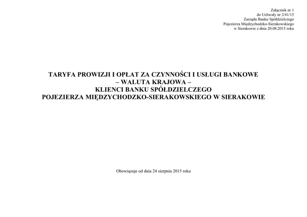 Załącznik nr 1 do Uchwały nr 2/41/15 Zarządu Banku Spółdzielczego Pojezierza Międzychodzko-Sierakowskiego w Sierakowie z dnia 20.08.2015 roku TARYFA PROWIZJI I OPŁAT ZA CZYNNOŚCI I USŁUGI BANKOWE – WALUTA KRAJOWA – KLIENCI BANKU SPÓŁDZIELCZEGO POJEZIERZA MIĘDZYCHODZKO-SIERAKOWSKIEGO W SIERAKOWIE Obowiązuje od dnia 24 sierpnia 2015 roku SPIS TREŚCI DZIAŁ I. POSTANOWIENIA OGÓLNE ................................................................................................................................................................................................................. 3 DZIAŁ II. USŁUGI DLA KLIENTÓW INDYWIDUALNYCH .............................................................................................................................................................................. 5 Rozdział 1. Obsługa rachunków oszczędnościowo-rozliczeniowych .................................................................................................................................................................... 5 Rozdział 2. Obsługa rachunków oszczędnościowych ............................................................................................................................................................................................ 6 Rozdział 3. Obsługa rachunków oszczędnościowych płatnych na każde żądanie (książeczki a’vista) ................................................................................................................. 7 Rozdział 4. Obsługa rachunków terminowych lokat oszczędnościowych ............................................................................................................................................................. 8 Rozdział 5. Usługi bankowości elektronicznej ...................................................................................................................................................................................................... 9 Rozdział 6. Karty płatnicze .................................................................................................................................................................................................................................... 9 DZIAŁ III. USŁUGI DLA KLIENTÓW INSTYTUCJONALNYCH .................................................................................................................................................................... 13 Rozdział 1. Obsługa rachunków rozliczeniowych ............................................................................................................................................................................................... 13 Rozdział 2. Obsługa rachunków lokat terminowych ........................................................................................................................................................................................... 15 Rozdział 3. Usługi bankowości elektronicznej .................................................................................................................................................................................................... 15 Rozdział 4. Karty płatnicze .................................................................................................................................................................................................................................. 16 DZIAŁ IV. KREDYTY ........................................................................................................................................................................................................................................... 19 Rozdział 1. Czynności związane z udzieleniem i spłatą kredytów oraz czynności związane ze zmianą warunków umowy lub za inne czynności związane z obsługą .......... 19 Rozdział 2. Gwarancje, poręczenia, regwarancje ................................................................................................................................................................................................ 20 Rozdział 3. Inne czynności i usługi bankowe ...................................................................................................................................................................................................... 20 DZIAŁ V. POZOSTAŁE OPŁATY ........................................................................................................................................................................................................................ 21 2 DZIAŁ I. POSTANOWIENIA OGÓLNE 1. Bank Spółdzielczy Pojezierza Międzychodzko-Sierakowskiego w Sierakowie, zwany dalej Bankiem, pobiera prowizje i opłaty za czynności i usługi bankowe dla Klientów indywidualnych oraz instytucjonalnych zgodnie z niniejszą Taryfą prowizji i opłat. 2. Prowizje i opłaty ustalane są w złotych. 3. Wszelkie prowizje i opłaty bankowe pokrywa zleceniodawca operacji bankowej, o ile strony nie ustaliły inaczej. 4. Prowizje i opłaty pobierane są poprzez obciążenie rachunku na podstawie udzielonej przez klienta dyspozycji lub poprzez przyjęcie wpłaty gotówkowej albo bezgotówkowej. 5. Prowizje i opłaty za czynności bankowe księgowane są w ciężar rachunku, którego dotyczą; w uzasadnionych przypadkach dopuszcza się zaksięgowanie prowizji/opłaty w ciężar innego rachunku klienta, zgodnie z dyspozycją klienta. 6. Opłaty i prowizje pobierane są : 1) niezwłocznie, w dniu złożenia albo wykonania dyspozycji, 2) cyklicznie, 3) w innych terminach wskazanych w umowach zawartych pomiędzy Klientami a Bankiem. 7. Opłaty cykliczne, o których mowa w ust. 6 pkt. 2, pobierane są w następujących terminach: 1) ostatniego dnia miesiąca – w przypadku opłat za prowadzenie rachunków, 2) 27 dnia każdego miesiąca – w przypadku opłat za użytkowanie k