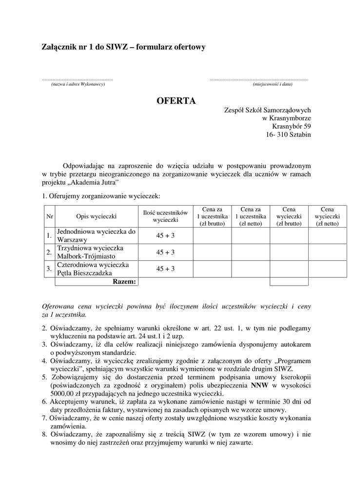 Załącznik nr 1 do SIWZ – formularz ofertowy ............................................................ (nazwa i adres Wykonawcy) ................................................................................... (miejscowość i data) OFERTA Zespół Szkół Samorządowych w Krasnymborze Krasnybór 59 16- 310 Sztabin Odpowiadając na zaproszenie do wzięcia udziału w postępowaniu prowadzonym w trybie przetargu nieograniczonego na zorganizowanie wycieczek dla uczniów w ramach projektu „Akademia Jutra” 1. Oferujemy zorganizowanie wycieczek: Nr Opis wycieczki Jednodniowa wycieczka do Warszawy Trzydniowa wycieczka 2. Malbork-Trójmiasto Czterodniowa wycieczka 3. Pętla Bieszczadzka Razem: 1. Ilość uczestników wycieczki Cena za 1 uczestnika (zł brutto) Cena za 1 uczestnika (zł netto) Cena wycieczki (zł brutto) 45 + 3 45 + 3 45 + 3 Oferowana cena wycieczki powinna być iloczynem ilości uczestników wycieczki i ceny za 1 uczestnika. 2. Oświadczamy, że spełniamy warunki określone w art. 22 ust. 1, w tym nie podlegamy wykluczeniu na podstawie art. 24 ust.1 i 2 uzp. 3. Oświadczamy, iż dla celów realizacji niniejszego zamówienia dysponujemy autokarem o podwyższonym standardzie. 4. Oświadczamy, iż wycieczkę zrealizujemy zgodnie z załączonym do oferty „Programem wycieczki”, spełniającym wszystkie warunki wymienione w rozdziale drugim SIWZ. 5. Zobowiązujemy się do dostarczenia przed terminem podpisania umowy kserokopii (poświadczonych za zgodność z oryginałem) polis ubezpieczenia NNW w wysokości 5000,00 zł przypadających na jednego uczestnika wycieczki. 6. Akceptujemy warunek, iż zapłata za wykonane zamówienie nastąpi w terminie 30 dni od daty przedłożenia faktury, wystawionej na zasadach opisanych we wzorze umowy. 7. Oświadczamy, że w cenie naszej oferty zostały uwzględnione wszystkie koszty wykonania zamówienia. 8. Oświadczamy, że zapoznaliśmy się z treścią SIWZ (w tym ze wzorem umowy) i nie wnosimy do niej zastrzeżeń oraz przyjmujemy warunki w niej zawarte. Cena wycieczki (zł netto) 9. Oświadczamy, iż zamierzamy wykonać zamówienie siłami własnymi, tj bez udziału podwykonawców. 10. Oświadczamy, że uważamy się za związanych z niniejszą ofertą na czas wskazany w SIWZ. 11. W przypadku przyznania nam zamówienia, zobowiązujemy się do zawarcia umowy w miejscu i terminie wskazanym przez Zamawiającego. 12. Oferta została złożona na ................. stronach kolejno ponumerowanych od nr ................. do nr .................. 13. Integralną część oferty stanowią następujące dokumenty*: a) ........................................................................................................................................................................................................... b) ........................................................................................................................................................................................................... c) ........................................................................................................................................................................................................... d) ........................................................................................................................................................................................................... e) ........................................................................................................................................................................................................... 14. Tajemnicą przedsiębiorstwa w rozumieniu przepisów ustawy o zwalczaniu nieuczciwej konkurencji, która nie będzie podlegać udostępnieniu, są następujące informacje**: a) ........................................................................................................................................................................................................... b) ........................................................................................................................................................................................................... c) ........................................................................................................................................................................................................... ...................................................................................................... (podpis upełnomocnionego(ych) przedstawiciela(i) Wykonawcy) Uwaga: * jeżeli dołączone są kopie dokumentów, to muszą być one poświadczone przez Wykonawcę za zgodność z oryginałem, ** należy wymienić dokumenty lub ich części albo podać numery stron, na których znajdują się informacje będące tajemnicą przedsiębiorstwa w rozumieniu ustawy o zwalczaniu nieuczciwej konkurencji.