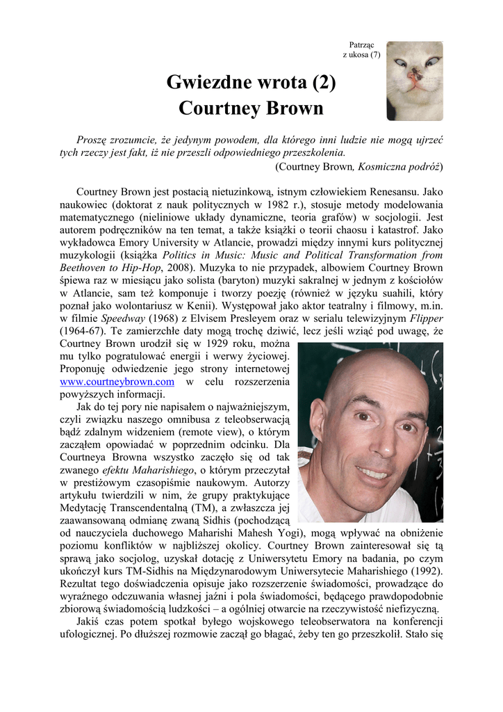 Patrząc z ukosa (7) Gwiezdne wrota (2) Courtney Brown Proszę zrozumcie, Ŝe jedynym powodem, dla którego inni ludzie nie mogą ujrzeć tych rzeczy jest fakt, iŜ nie przeszli odpowiedniego przeszkolenia. (Courtney Brown, Kosmiczna podróŜ) Courtney Brown jest postacią nietuzinkową, istnym człowiekiem Renesansu. Jako naukowiec (doktorat z nauk politycznych w 1982 r.), stosuje metody modelowania matematycznego (nieliniowe układy dynamiczne, teoria grafów) w socjologii. Jest autorem podręczników na ten temat, a takŜe ksiąŜki o teorii chaosu i katastrof. Jako wykładowca Emory University w Atlancie, prowadzi między innymi kurs politycznej muzykologii (ksiąŜka Politics in Music: Music and Political Transformation from Beethoven to Hip-Hop, 2008). Muzyka to nie przypadek, albowiem Courtney Brown śpiewa raz w miesiącu jako solista (baryton) muzyki sakralnej w jednym z kościołów w Atlancie, sam teŜ komponuje i tworzy poezję (równieŜ w języku suahili, który poznał jako wolontariusz w Kenii). Występował jako aktor teatralny i filmowy, m.in. w filmie Speedway (1968) z Elvisem Presleyem oraz w serialu telewizyjnym Flipper (1964-67). Te zamierzchłe daty mogą trochę dziwić, lecz jeśli wziąć pod uwagę, Ŝe Courtney Brown urodził się w 1929 roku, moŜna mu tylko pogratulować energii i werwy Ŝyciowej. Proponuję odwiedzenie jego strony internetowej www.courtneybrown.com w celu rozszerzenia powyŜszych informacji. Jak do tej pory nie napisałem o najwaŜniejszym, czyli związku naszego omnibusa z teleobserwacją bądź zdalnym widzeniem (remote view), o którym zacząłem opowiadać w poprzednim odcinku. Dla Courtneya Browna wszystko zaczęło się od tak zwanego efektu Maharishiego, o którym przeczytał w prestiŜowym czasopiśmie naukowym. Autorzy artykułu twierdzili w nim, Ŝe grupy praktykujące Medytację Transcendentalną (TM), a zwłaszcza jej zaawansowaną odmianę zwaną Sidhis (pochodzącą od nauczyciela duchowego Maharishi Mahesh Yogi), mogą wpływać na obniŜenie poziomu konfliktów w najbliŜszej okolicy. Courtney Brown zainteresował się tą sprawą jako socjolog, uzyskał dotację z Uniwersytetu Emory na badania, po czym ukończył kurs TM-Sidhis na Międzynarodowym Uniwersytecie Maharishiego (1992). Rezultat tego doświadczenia opisuje jako rozszerzenie świadomości, prowadzące do wyraźnego odczuwania własnej jaźni i pola świadomości, będącego prawdopodobnie zbiorową świadomością ludzkości – a ogólniej otwarcie na rzeczywistość niefizyczną. Jakiś czas potem spotkał byłego wojskowego teleobserwatora na konferencji ufologicznej. Po dłuŜszej rozmowie zaczął go błagać, Ŝeby ten go przeszkolił. Stało się to moŜliwe dopiero po 15 miesiącach, kiedy jego interlokutor (którego personalia Brown dyskretnie przemilcza) zorganizował pierwszy kurs zdalnego widzenia. Rzecz jasna najpierw przyszli teleobserwatorzy zostali wysłani do The Monroe Institute na kurs Wędrówka przez Bramę, zgodnie z procedurą ustaloną przez Ingo Swanna. W latach 1993-94 Courtney Brown odbył serię sesji obserwacyjnych pod kierunkiem swojego mentora, a w r. 1995 załoŜył własną niedochodową organizację The Farsight Institute (www.farsight.org). Swoje doświadczenia opisał w ksiąŜkach Cosmic Voyage (1996) i Cosmic Explorers (1999), dostępnych na stronie autora, a próbę wyjaśnienia fenomenu zdalnego widzenia przedstawił w ksiąŜce Remote Viewing: The Science and Theory of Nonphysical Perception (2006). Tylko pierwsza z tych ksiąŜek została przetłumaczona na język polski (Kosmiczna podróŜ, Limbus 1997); spróbuję ją dość obszernie streścić poniŜej. Na zakończenie dodam, Ŝe dawna fascynacja Courtneya Browna filmem daje o sobie znać takŜe obecnie – jest on producentem i reŜyserem internetowego serialu animowanego Galactic Times: Earth Report, dostępnego na stronie www.farsightpresentations.com, łączącego fabułę science fiction z danymi pochodzącymi z teleobserwacji. Tytułem wstępu do opisu zawartości ksiąŜki warto zaznaczyć, Ŝe poniŜsze dane są oceniane przez autora jako w pełni wiarygodne, a samo zdalne widzenie jako naukowe. Podstawową cechą metody uwaŜanej za naukową jest bowiem powtarzalność, co tu bez wątpienia ma miejsce. OtóŜ dobrze przeszkoleni teleobserwatorzy, namierzając niezaleŜnie od siebie nawet najbardziej egzotyczne cele, bez uprzedniej wiedzy o ich charakterze, uzyskują zawsze zgodne wyniki, co dotyczy takŜe obserwacji opisanych niŜej. Zdalne widzenie ma jednak pewne ograniczenia, związane ze sposobem postrzegania nieświadomości oraz przekazywania przez nią danych do świadomego umysłu. Jeśli np. zaobserwuje się ksiąŜkę, da się łatwo uzyskać informację o jej treści, byłby jednak kłopot z przytoczeniem dosłownego tekstu. Inny przykład ułomności widzenia odnalazłem w ksiąŜce Wędrujący umysł Josepha McMoneagle. Oto rysunek autora z teleobserwacji piramid na Marsie (15°N, 198°E). Wszystko się zgadza z wyjątkiem tego, Ŝe tamtejsze piramidy mają podstawę nie czworokątną, lecz pięciokątną. Widać zatem, Ŝe podświadomość przekazała raczej ideę piramidy, niŜ konkretny obraz. Courtney Brown podkreśla, Ŝe świadomy umysł moŜe odebrać tylko to, co rozumie – być moŜe więc w tym przypadku idea nietypowej piramidy została przezeń zablokowana. Autor Kosmicznej podróŜy, z uwagi na brak odpowiedniego wykształcenia, nie odbiera dobrze skomplikowanych urządzeń technicznych, natomiast jako socjolog bez kłopotu rozumie złoŜone układy społeczne. Jeszcze jedna trudność wiąŜe się z ustaleniem usytuowania namierzanych obiektów, do których dotarło się w jakiś inteligentny sposób (po nitce do kłębka) – jeśli cel jest na Ziemi, moŜna spróbować rozpoznać okolicę, co jest dość pracochłonne i z reguły wymaga współpracy wielu teleobserwatorów. Tym niemniej Courtney Brown uwaŜa, Ŝe wymienione trudn