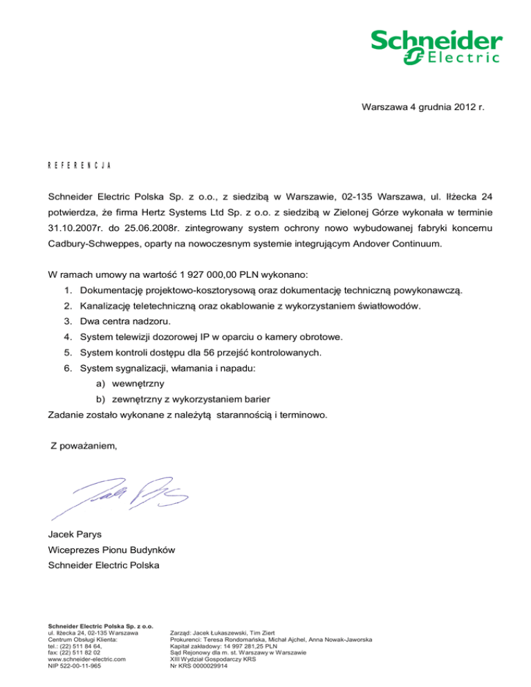 Warszawa 4 grudnia 2012 r. REFERENCJA Schneider Electric Polska Sp. z o.o., z siedzib w Warszawie, 02-135 Warszawa, ul. I ecka 24 potwierdza, e firma Hertz Systems Ltd Sp. z o.o. z siedzib w Zielonej Górze wykona a w terminie 31.10.2007r. do 25.06.2008r. zintegrowany system ochrony nowo wybudowanej fabryki koncernu Cadbury-Schweppes, oparty na nowoczesnym systemie integruj cym Andover Continuum. W ramach umowy na warto 1 927 000,00 PLN wykonano: 1. Dokumentacj projektowo-kosztorysow oraz dokumentacj techniczn powykonawcz . 2. Kanalizacj teletechniczn oraz okablowanie z wykorzystaniem wiat owodów. 3. Dwa centra nadzoru. 4. System telewizji dozorowej IP w oparciu o kamery obrotowe. 5. System kontroli dost pu dla 56 przej kontrolowanych. 6. System sygnalizacji, w amania i napadu: a) wewn trzny b) zewn trzny z wykorzystaniem barier Zadanie zosta o wykonane z nale yt staranno ci i terminowo. Z powa aniem, Jacek Parys Wiceprezes Pionu Budynków Schneider Electric Polska Schneider Electric Polska Sp. z o.o. ul. I ecka 24, 02-135 Warszawa Centrum Obs ugi Klienta: tel.: (22) 511 84 64, fax: (22) 511 82 02 www.schneider-electric.com NIP 522-00-11-965 Zarz d: Jacek ukaszewski, Tim Ziert Prokurenci: Teresa Rondoma ska, Micha Ajchel, Anna Nowak-Jaworska Kapita zak adowy: 14 997 281,25 PLN d Rejonowy dla m. st. Warszawy w Warszawie XIII Wydzia Gospodarczy KRS Nr KRS 0000029914